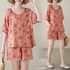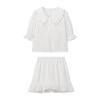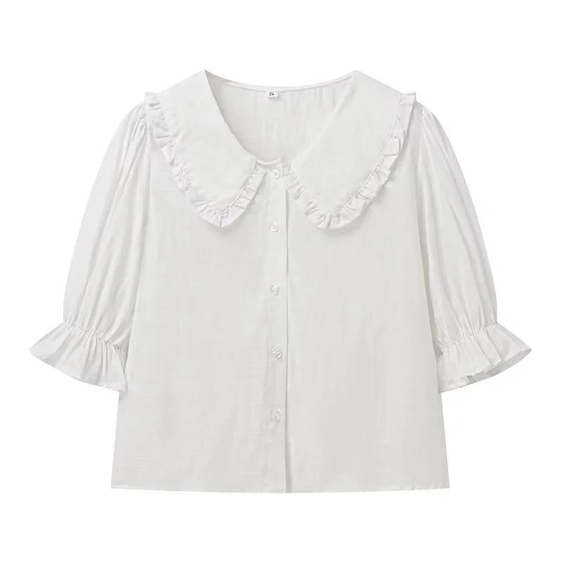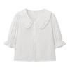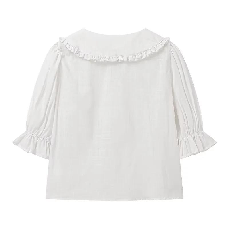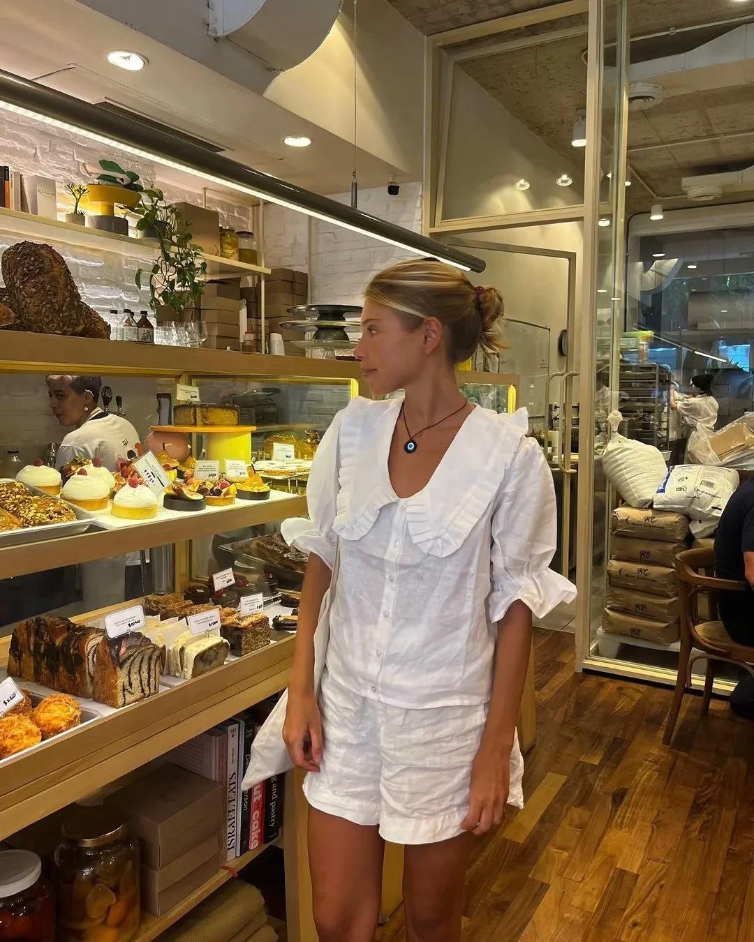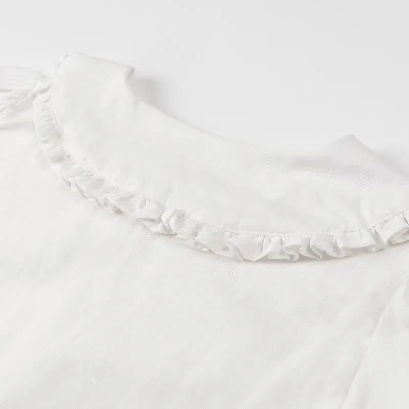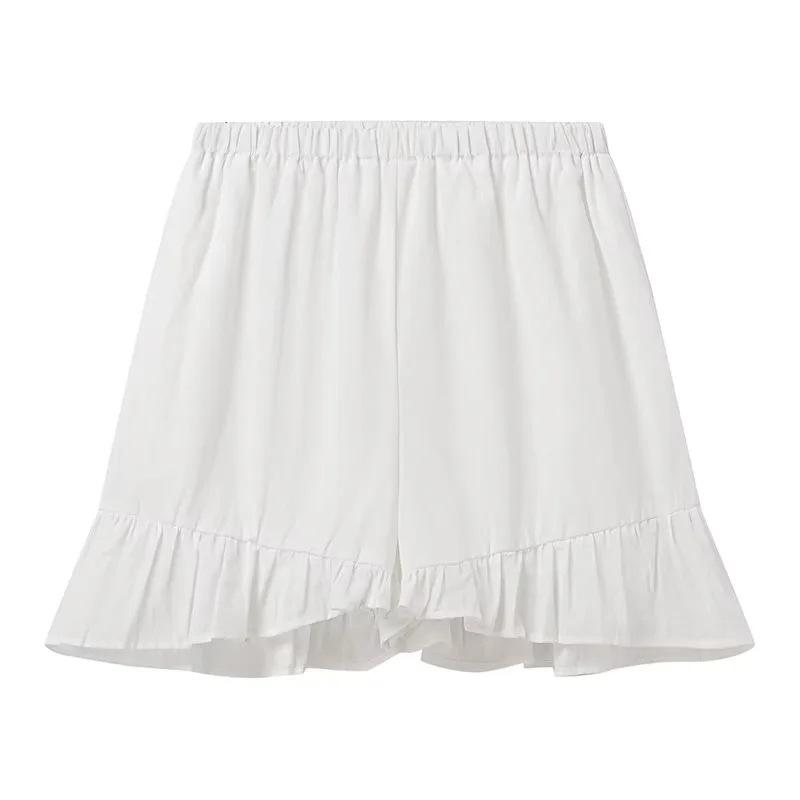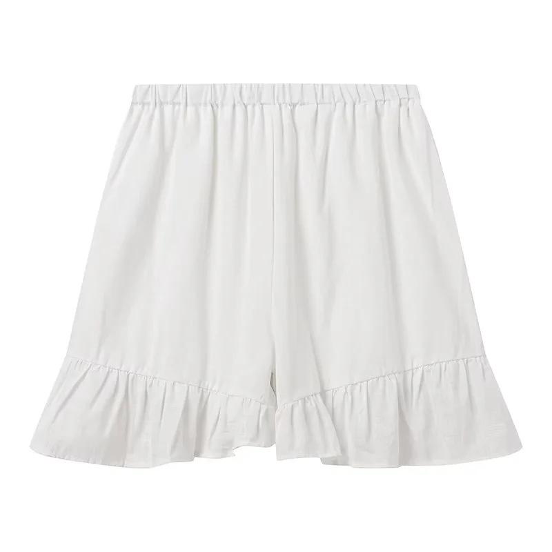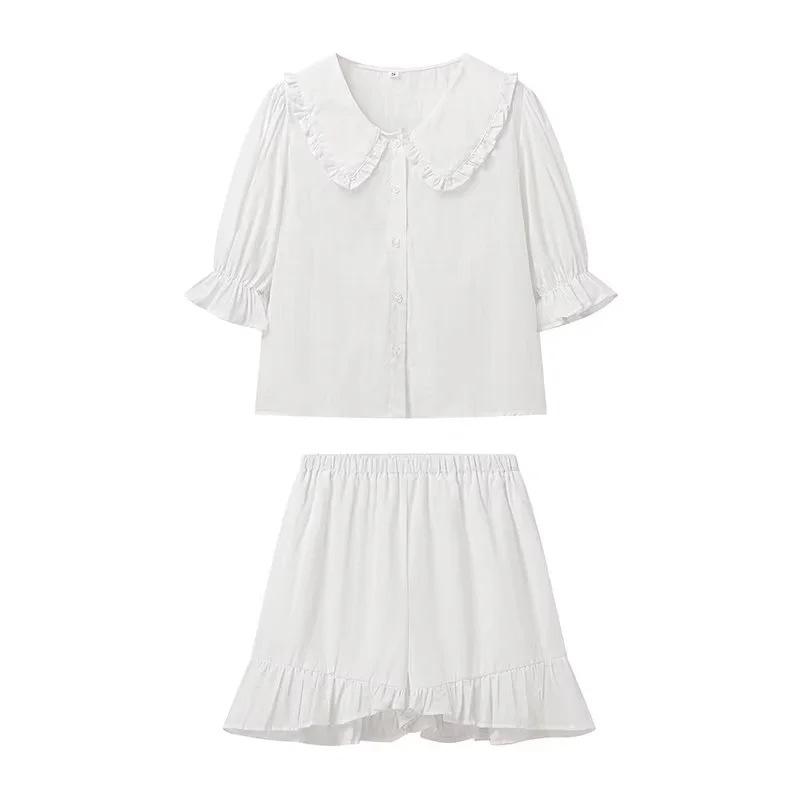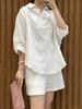 Ropa Europea y Americana 2024 Verano Nuevo Estilo Solapa con Volantes Camisa de Algodón y Lino de Manga Corta + Set de Shorts de Encaje de Algodón y Lino