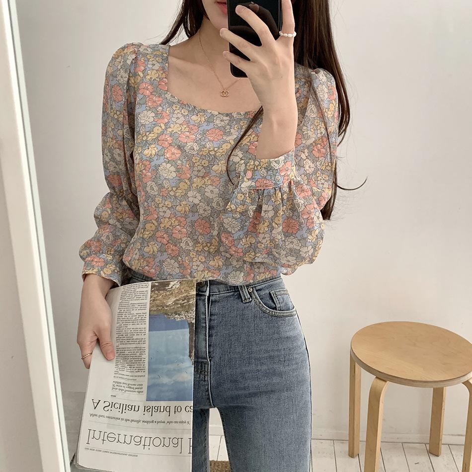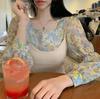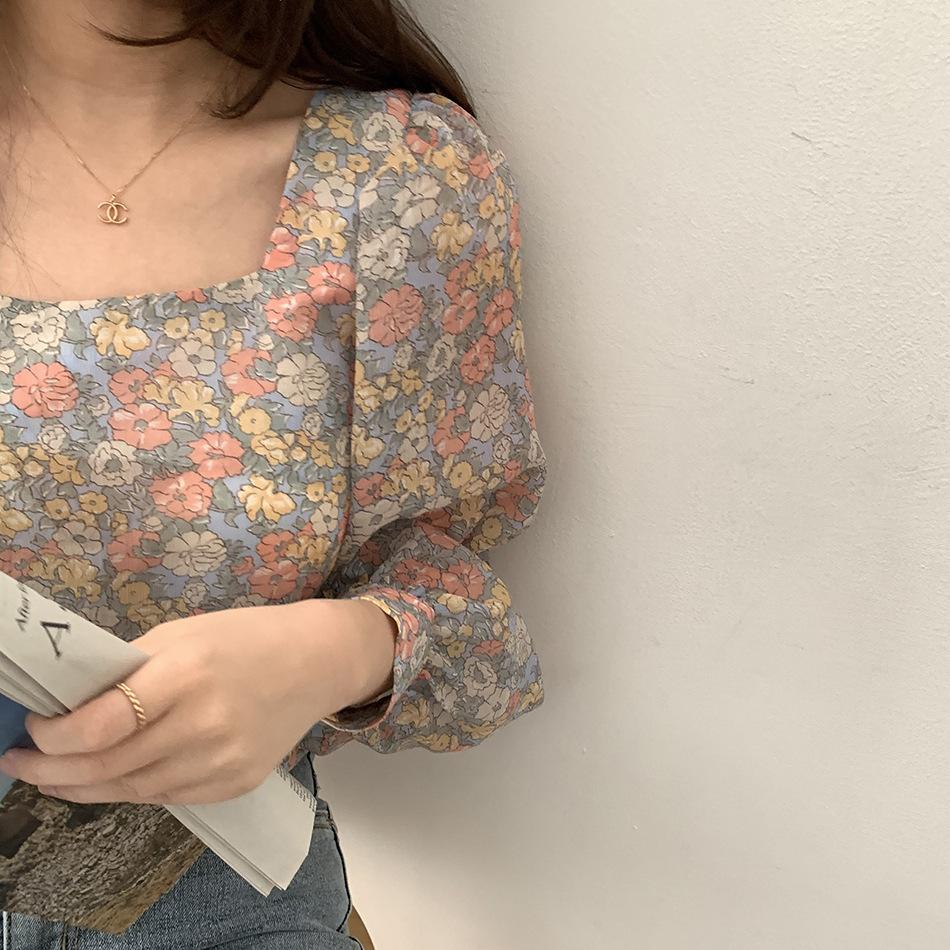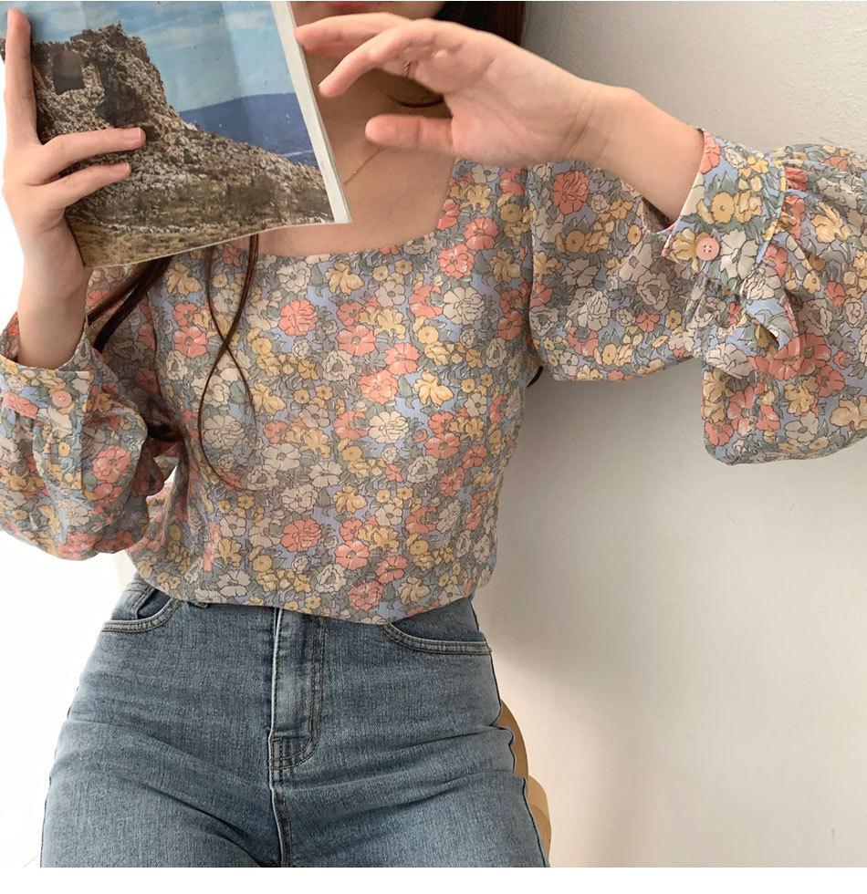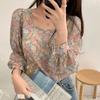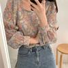 Blusa holgada de gasa con cuello cuadrado vintage floral, elegante y elegante de estilo coreano para chica, de otoño, dulce y antiedad.