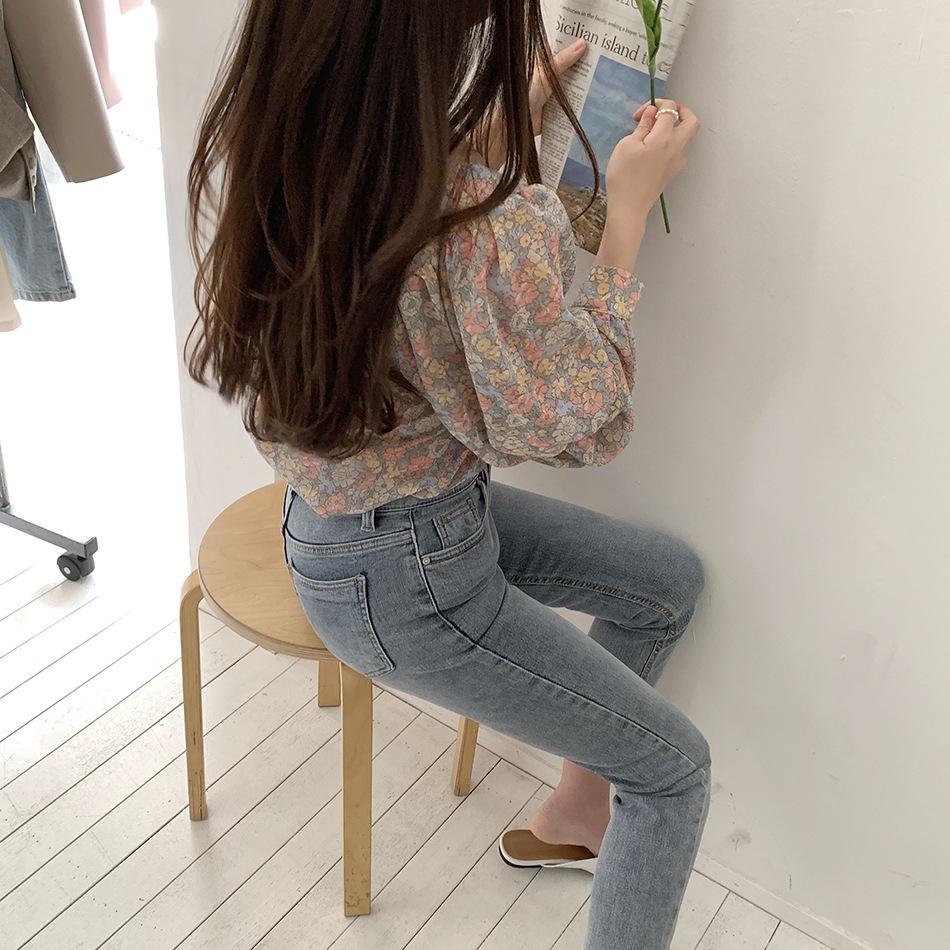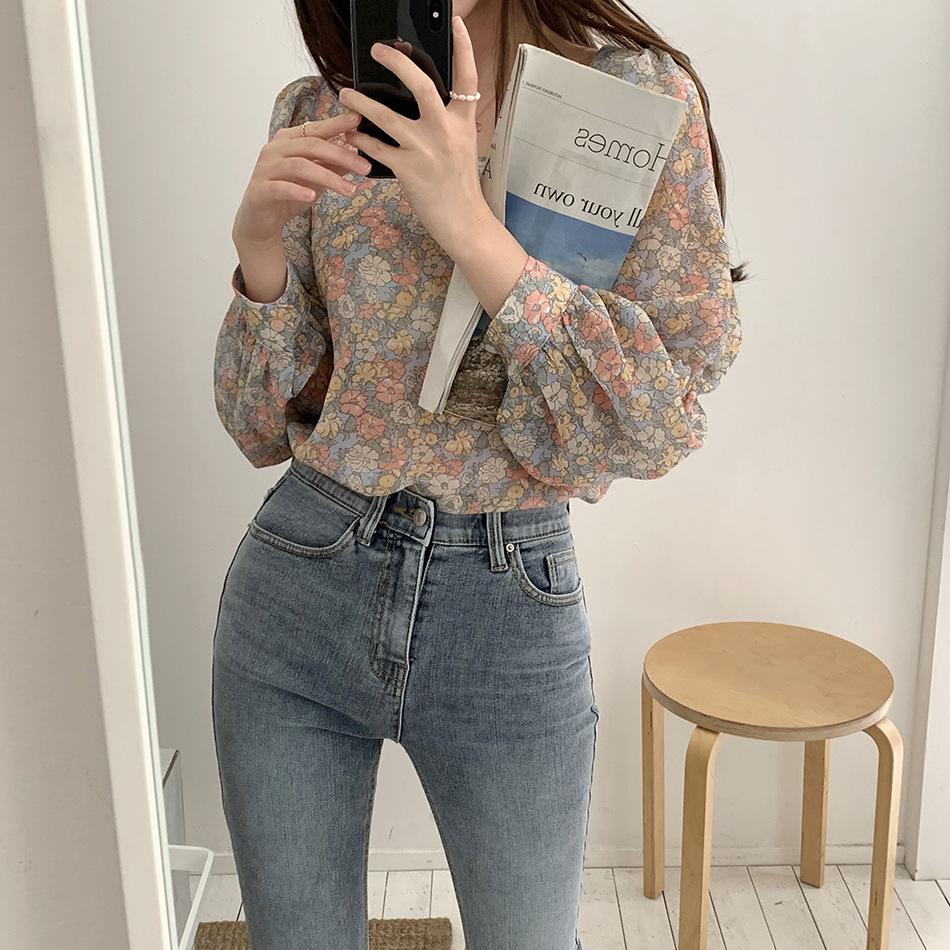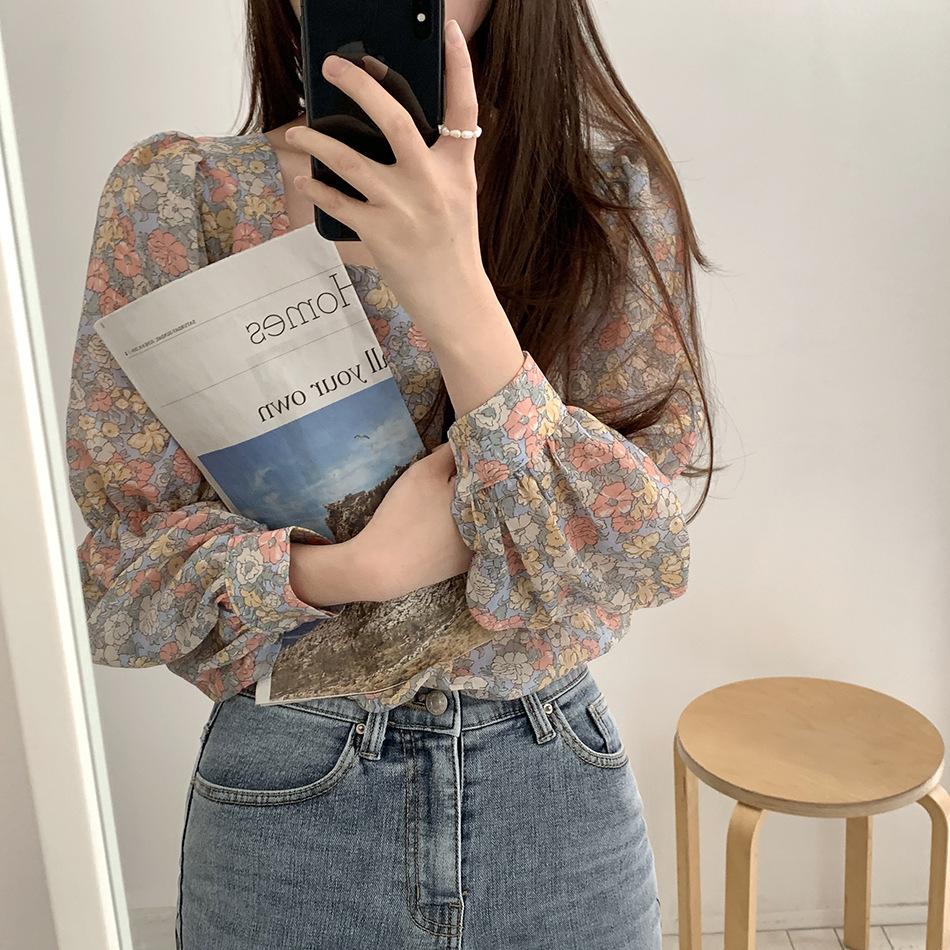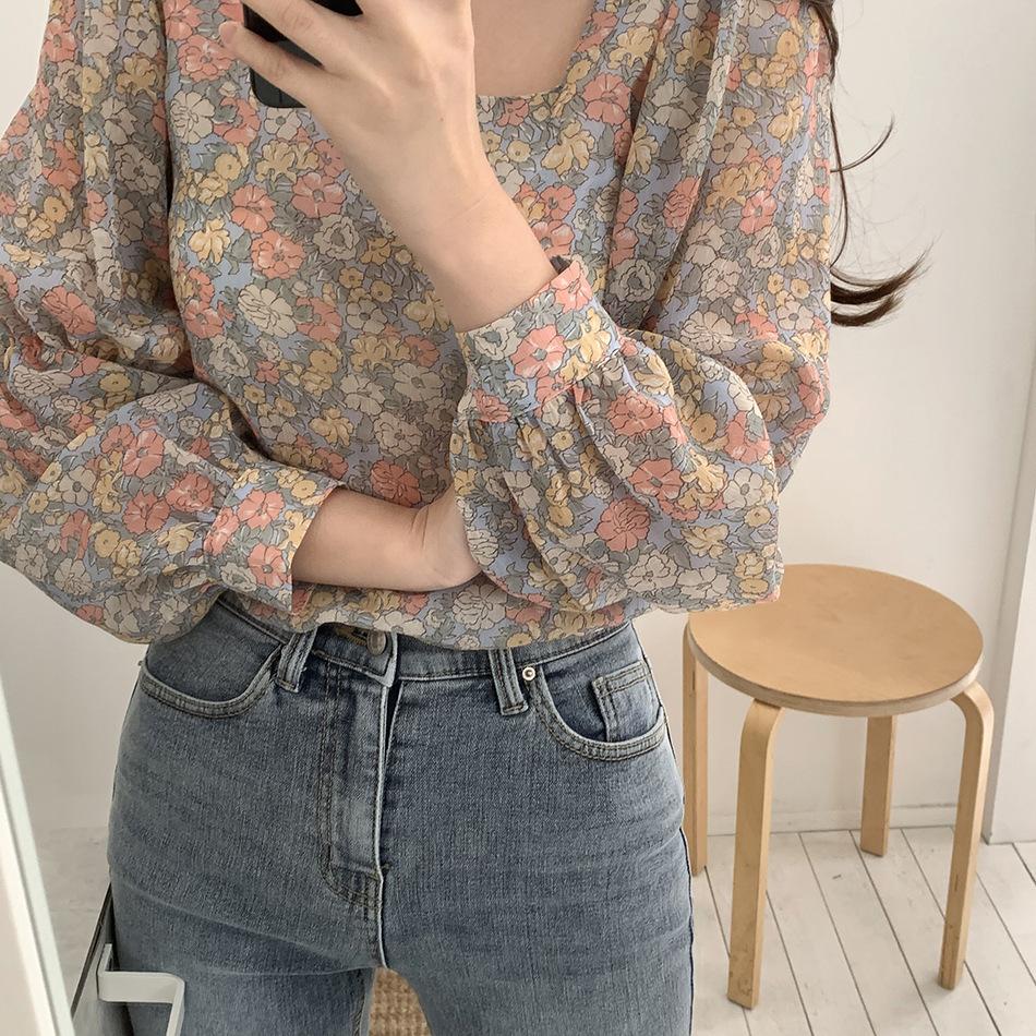 Blusa holgada de gasa con cuello cuadrado vintage floral, elegante y elegante de estilo coreano para chica, de otoño, dulce y antiedad.
