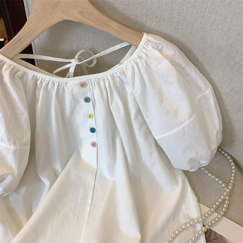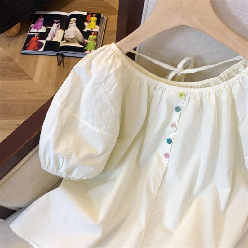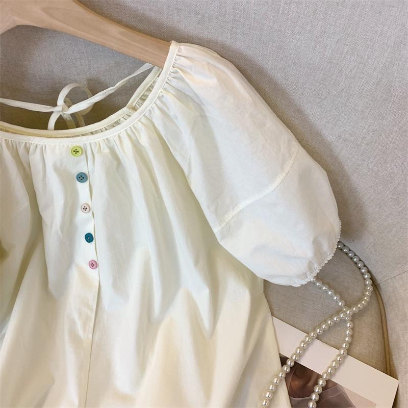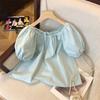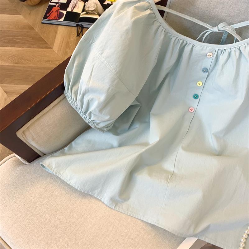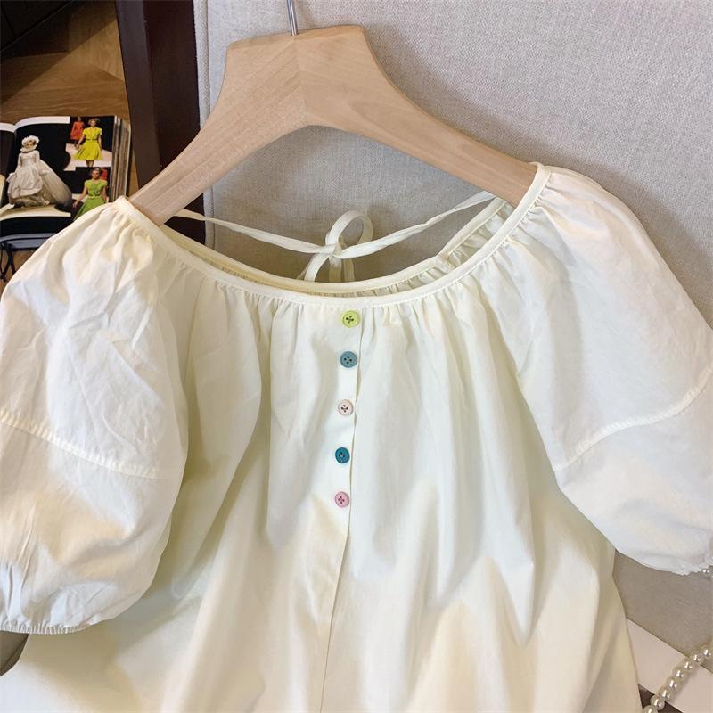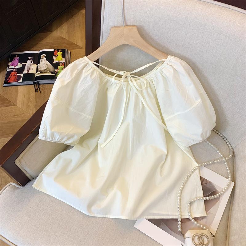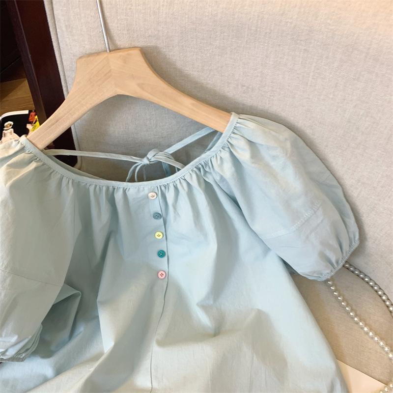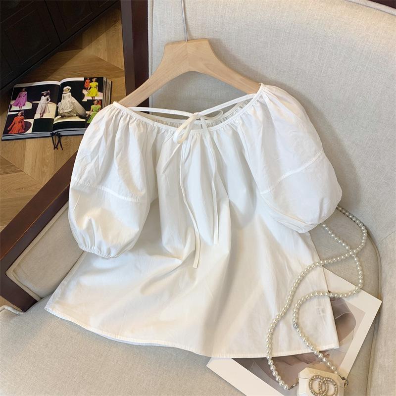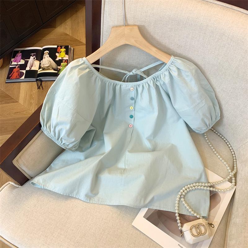 Foto real simple y versátil 2024 verano nuevo versión coreana de dulce manga abullonada color sólido delgada cuello redondo camiseta de manga corta para mujer