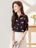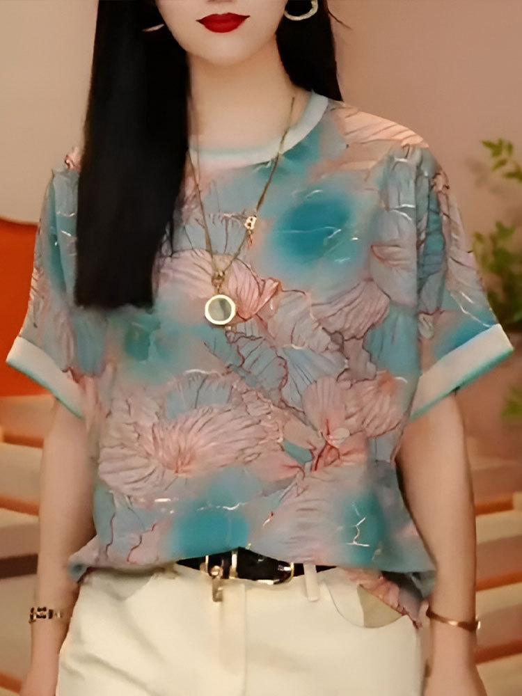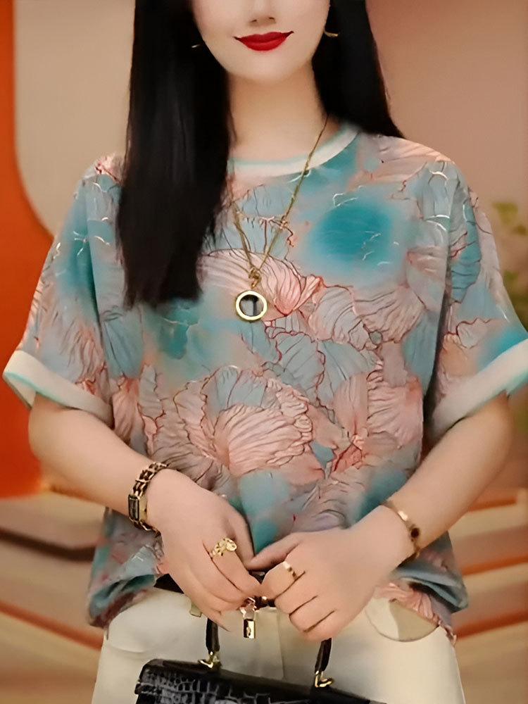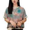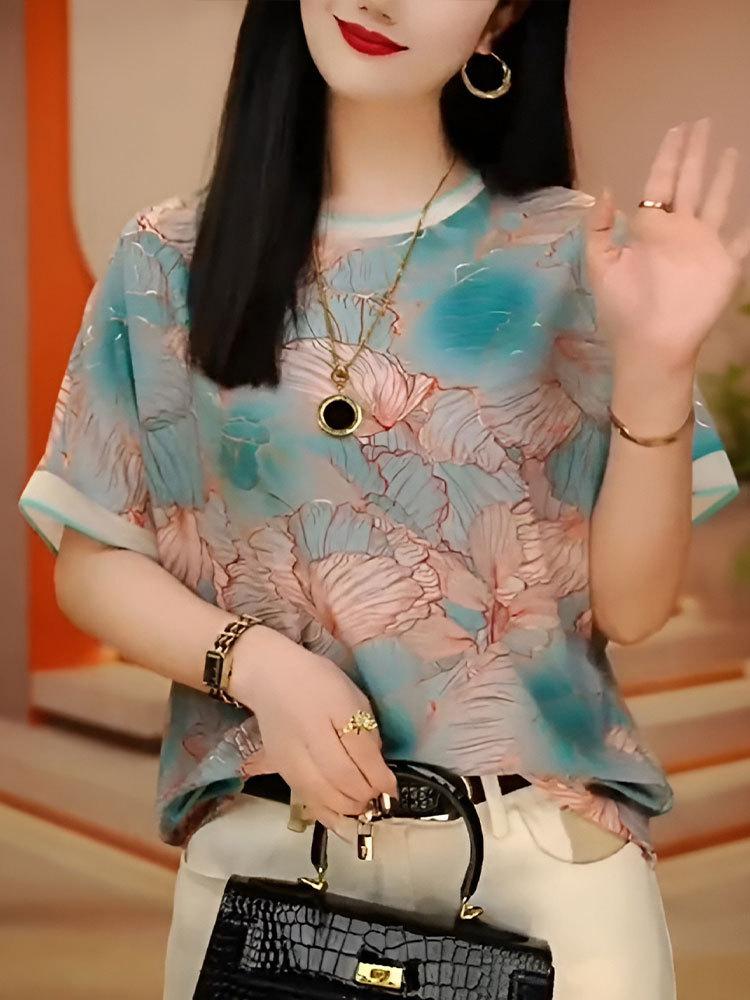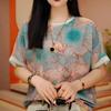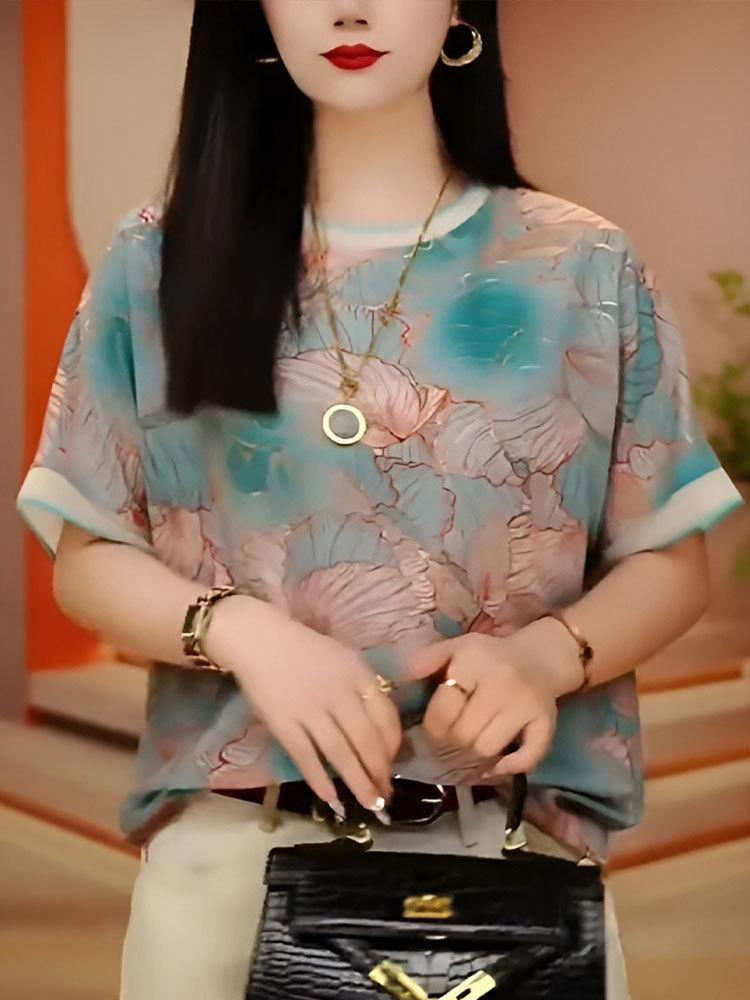 Camisa de Manga Corta de Moda para Mujer Verano Nuevo Estilo Diseño Estilo Mamá Camiseta de Gasa Estampada Top Holgado y Versátil