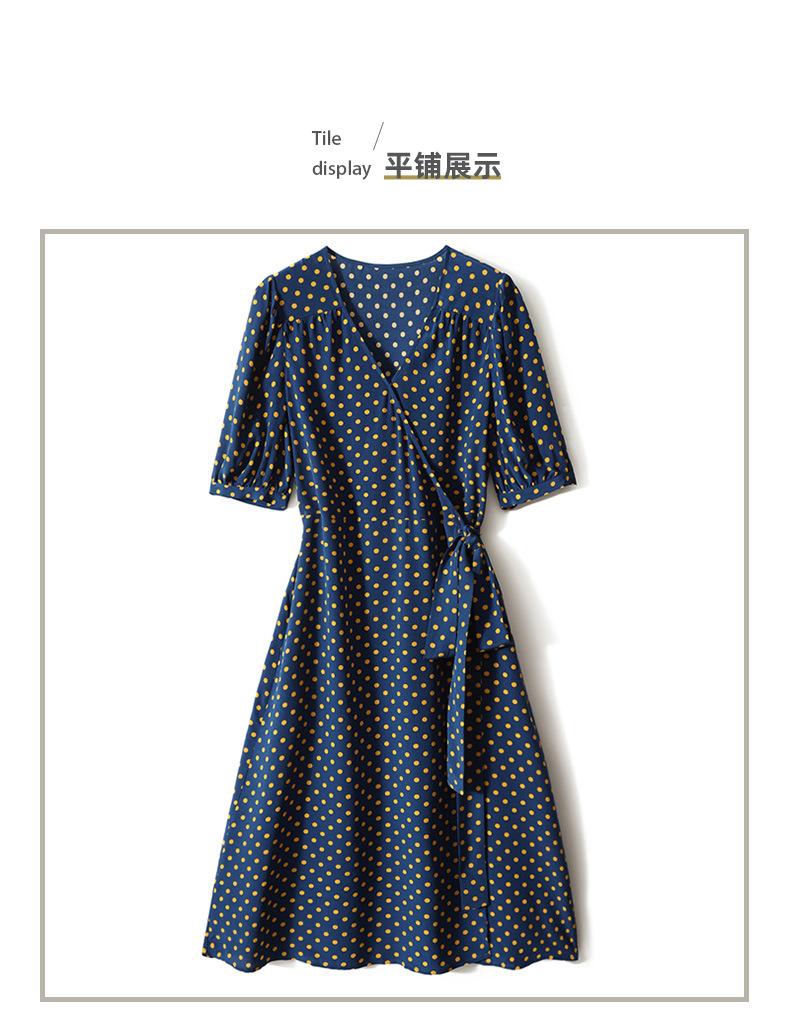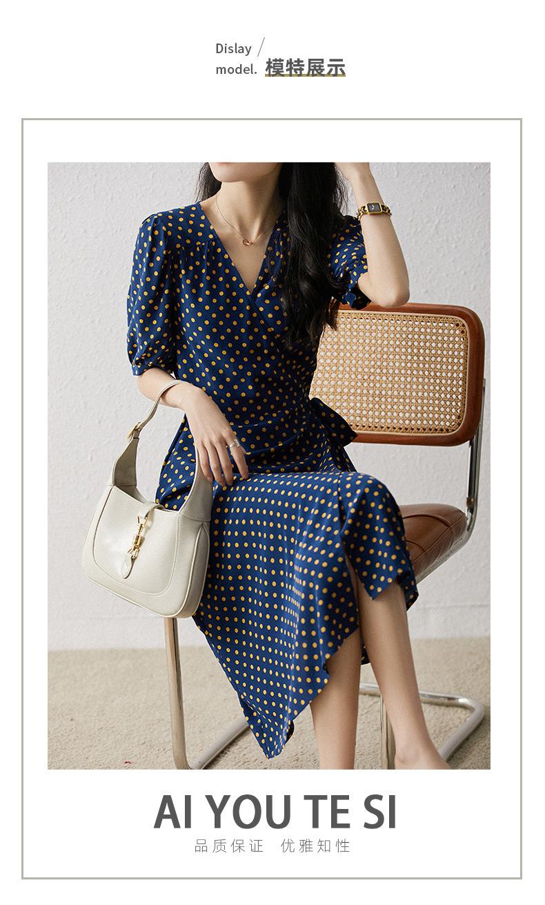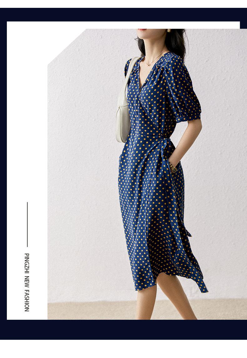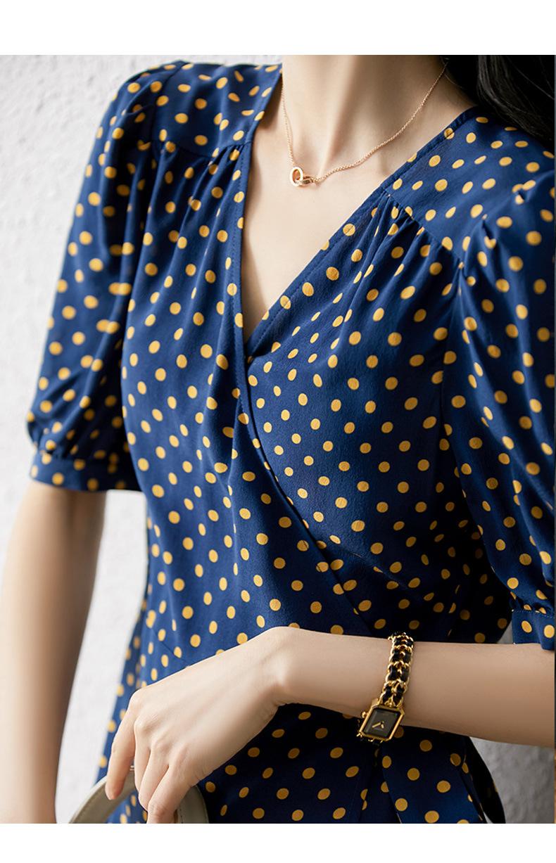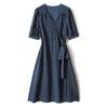 Vestido de Seda con Cordones y Lunares para Mujer Seda de Morera Cuello en V Falda para la Hora del Té de Gama Alta Largo Midi Verano Ropa de Mujer