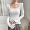 Camiseta Blanca de Base con Cuello Cuadrado, Camiseta de Manga Larga para Mujer, Primavera y Otoño, Petite, Canalé, Corte Ajustado, Camiseta Favorecedora para Usar en Capas