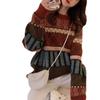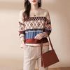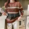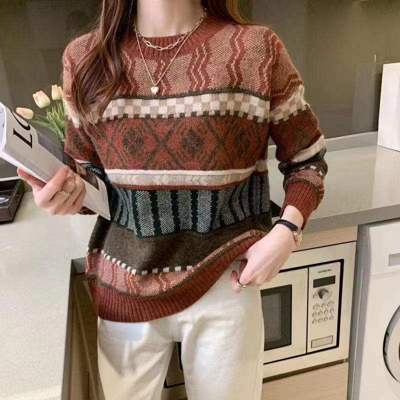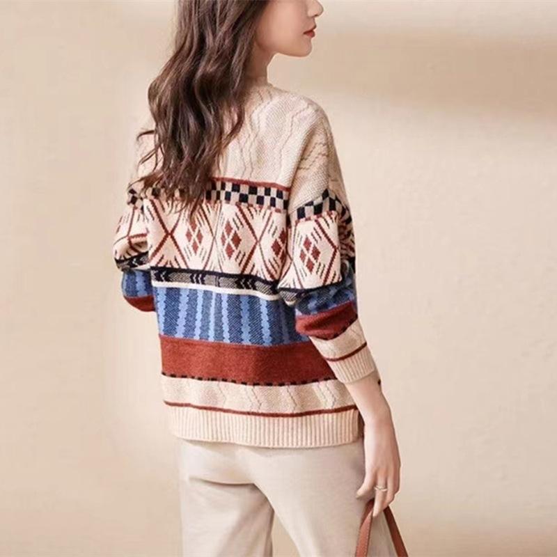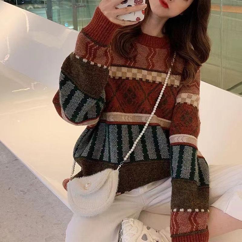 Otoño e Invierno nuevo cuello redondo ropa exterior patrón de color contrastante suéter vintage jersey de mujer holgado estilo perezoso estilo occidental top para llevar debajo