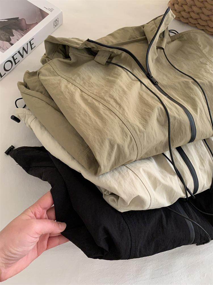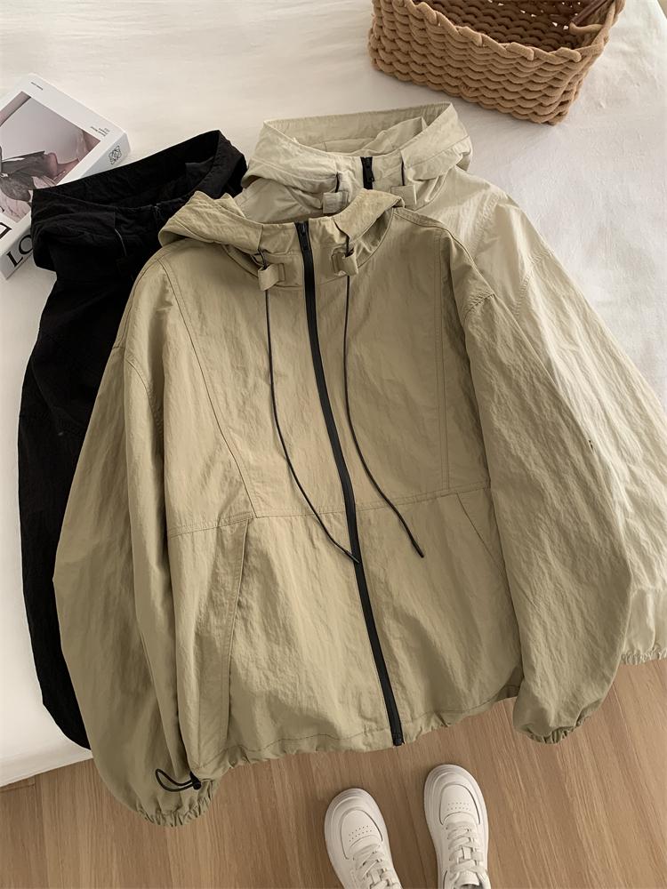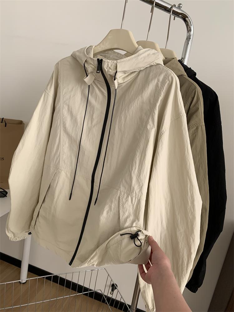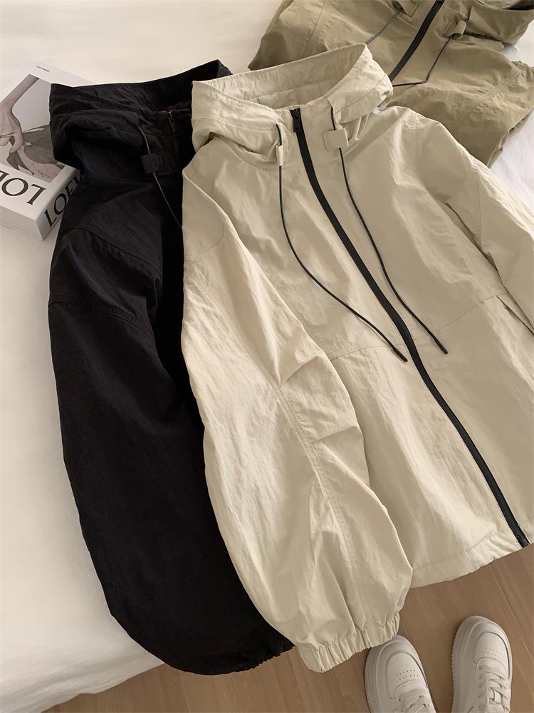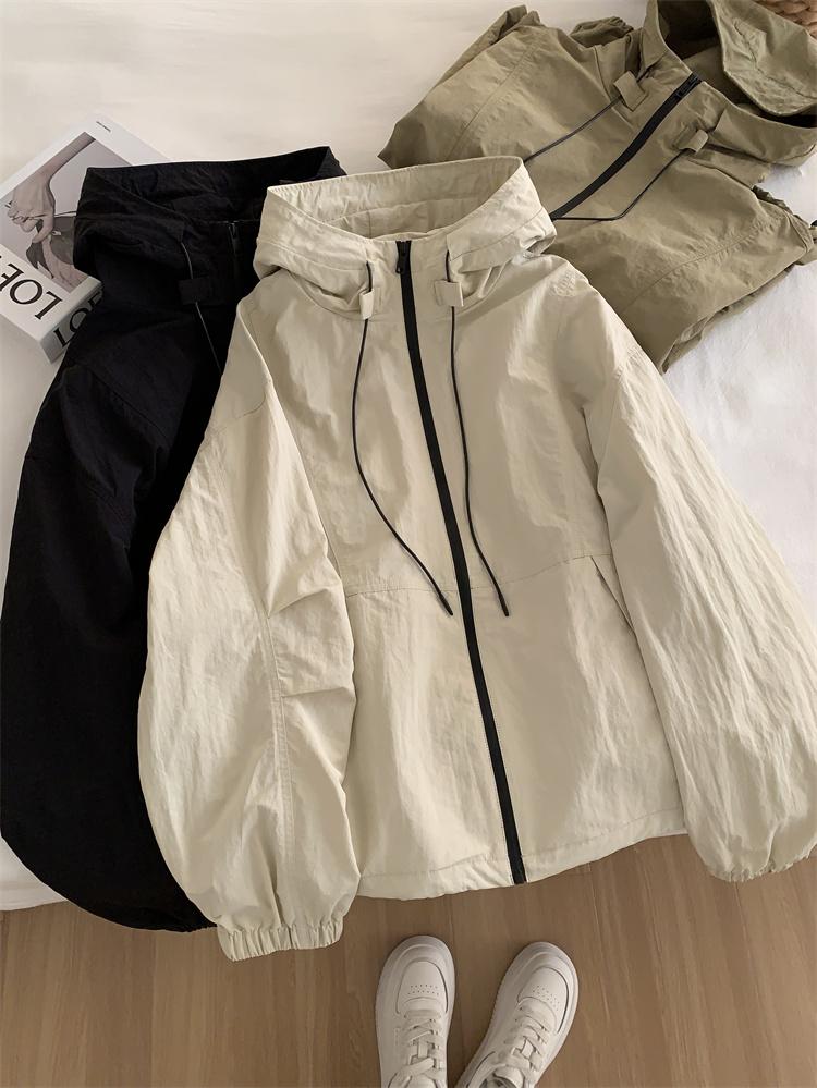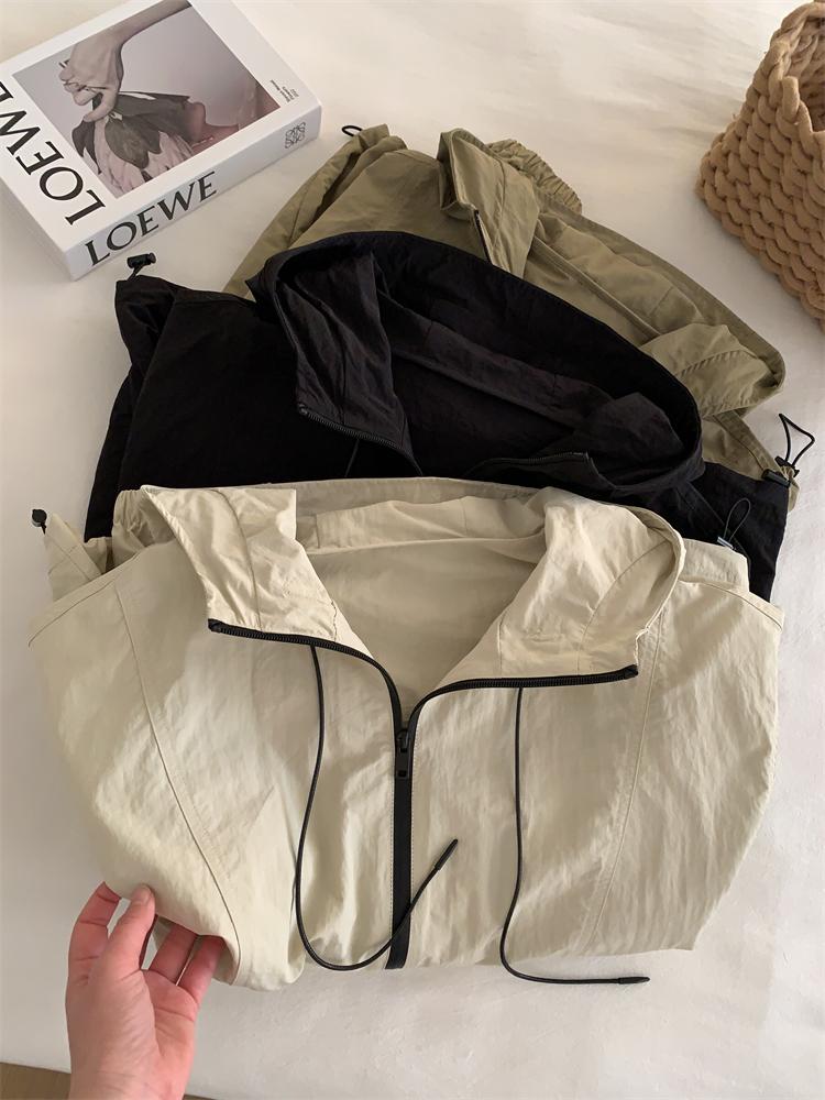 Chaqueta Casual para Exterior con Protección Solar de Primavera para Mujer, Corte Holgado Adelgazante, Cuello Alto, con Capucha, Cortavientos, Cierre de Cremallera, Camisa Moderna