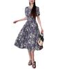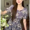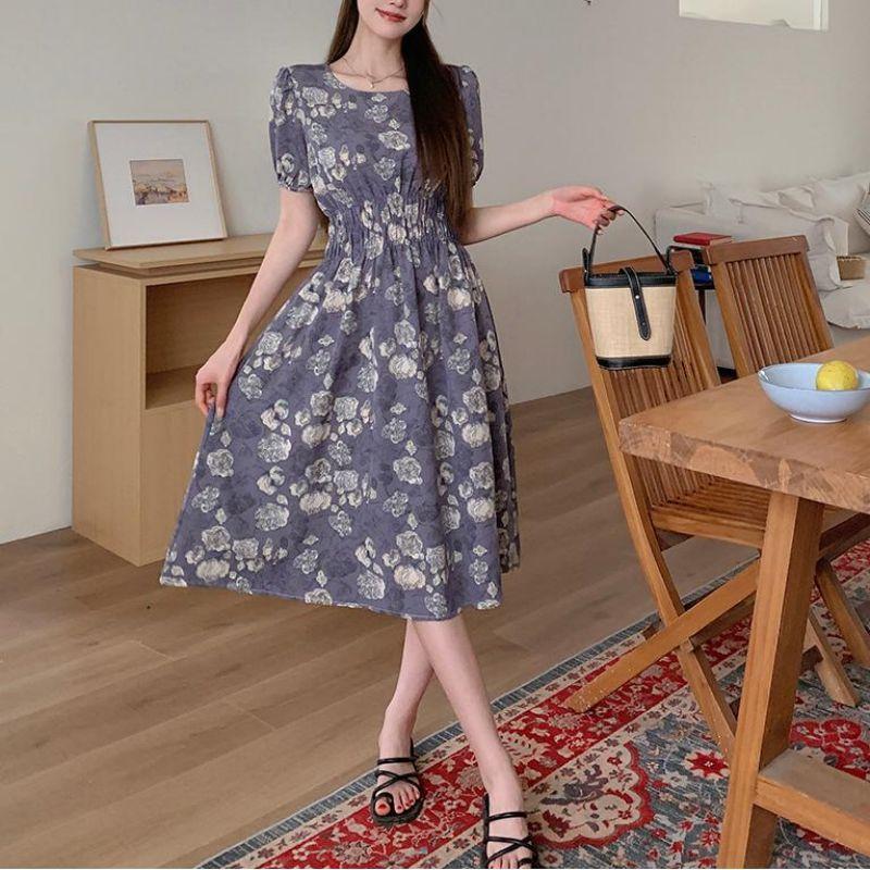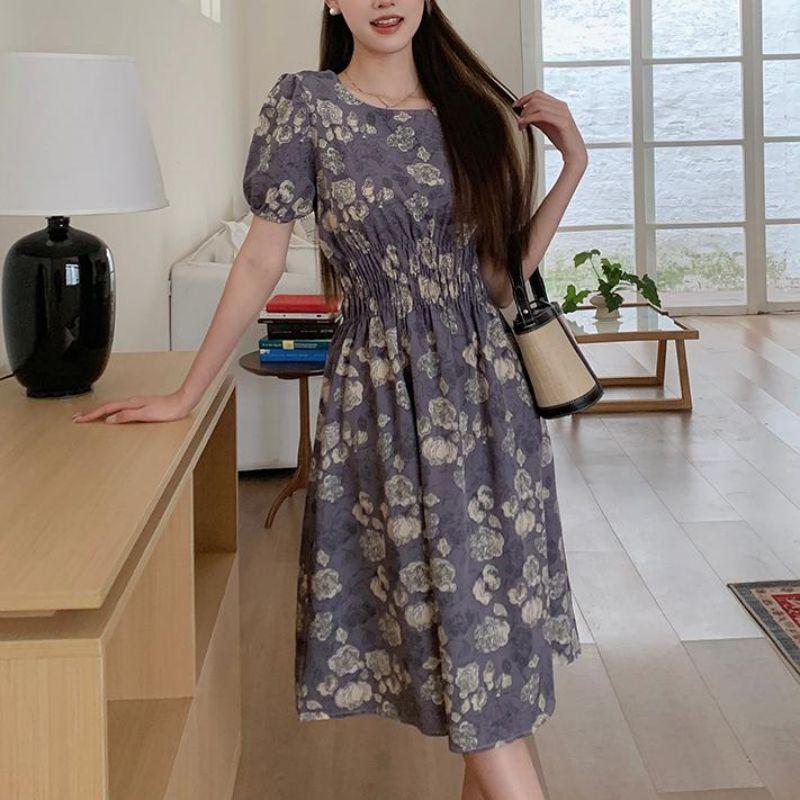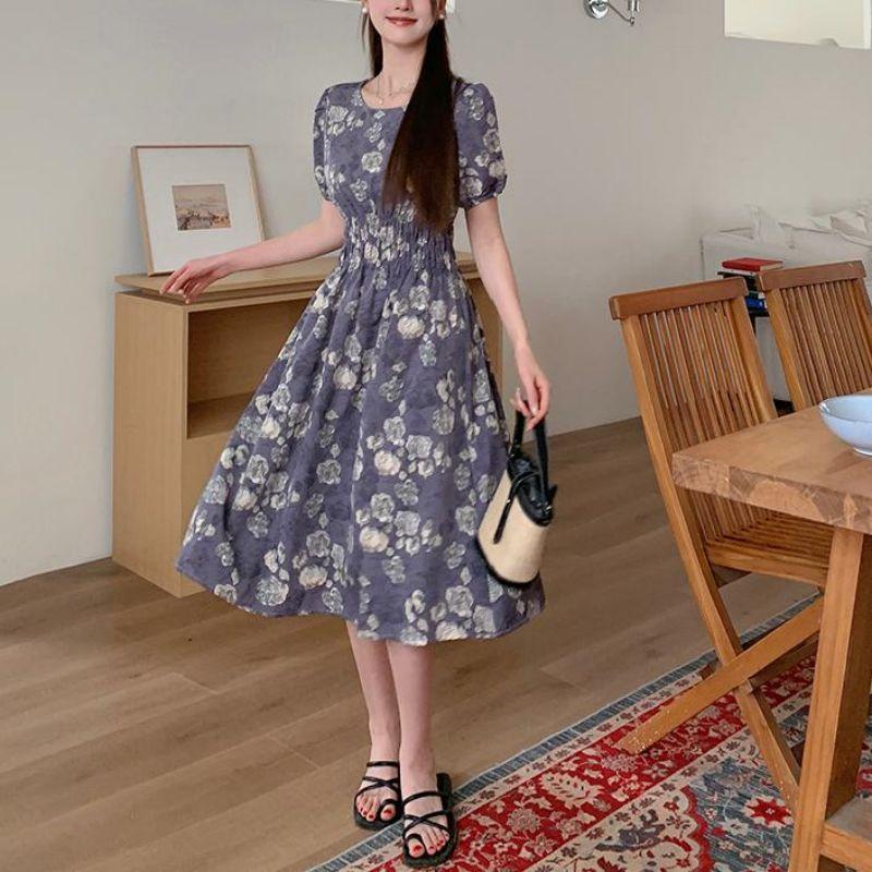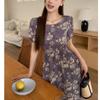 Vestido Floral Púrpura Francés para la Hora del Té para Mujer Verano Nuevo Estilo de Alta Gama y Hermoso Cintura Falda Larga de Hada Temperamento