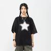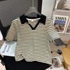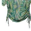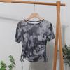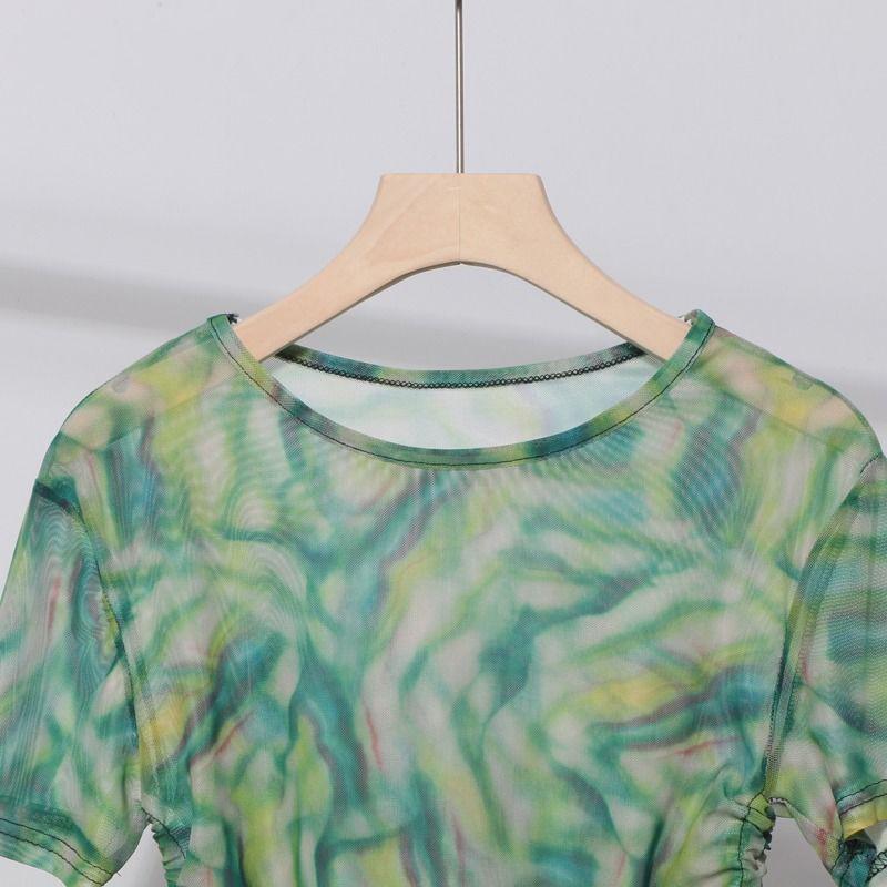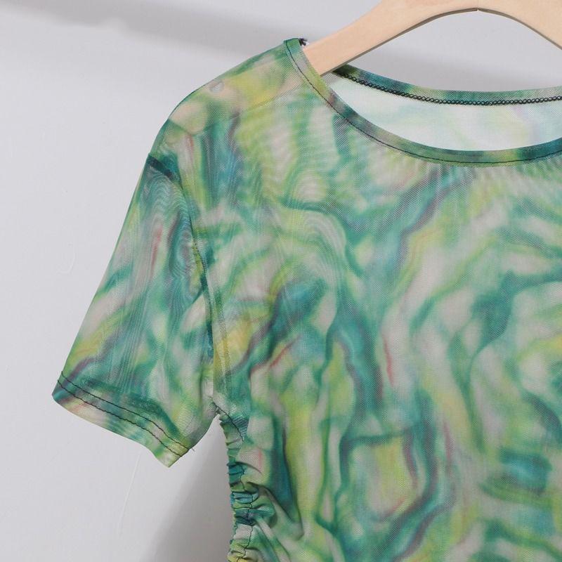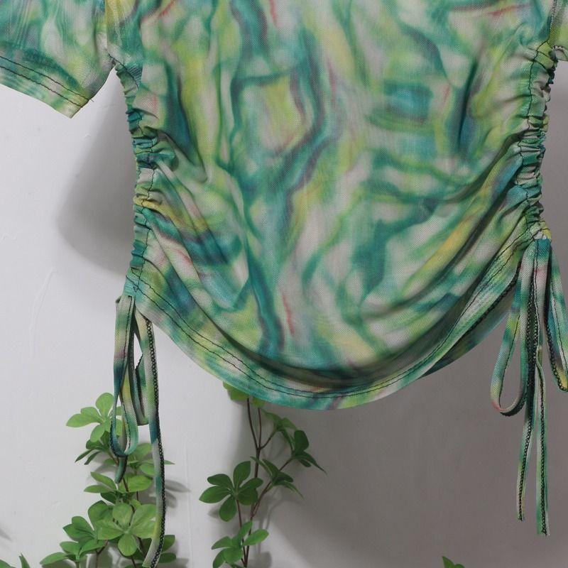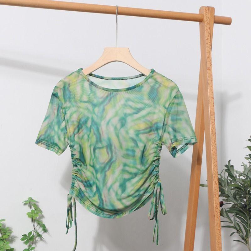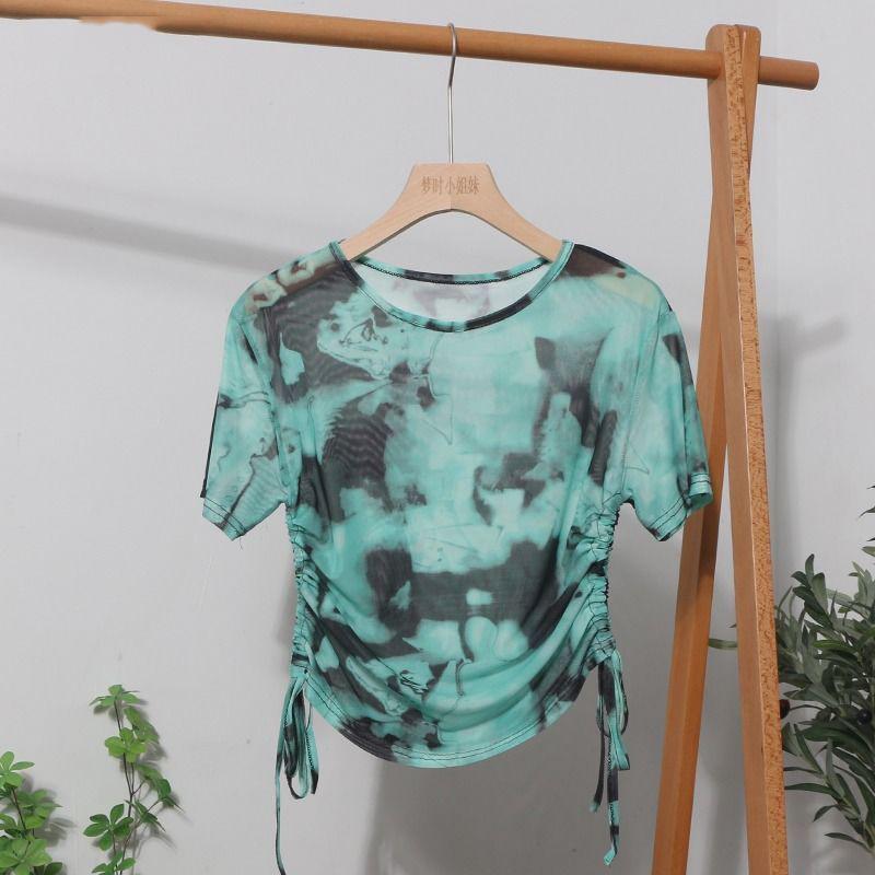 Camisa de verano de malla fina y ajustada con cuello redondo, manga corta y cordón ajustable, diseño vintage de nicho, para mujer