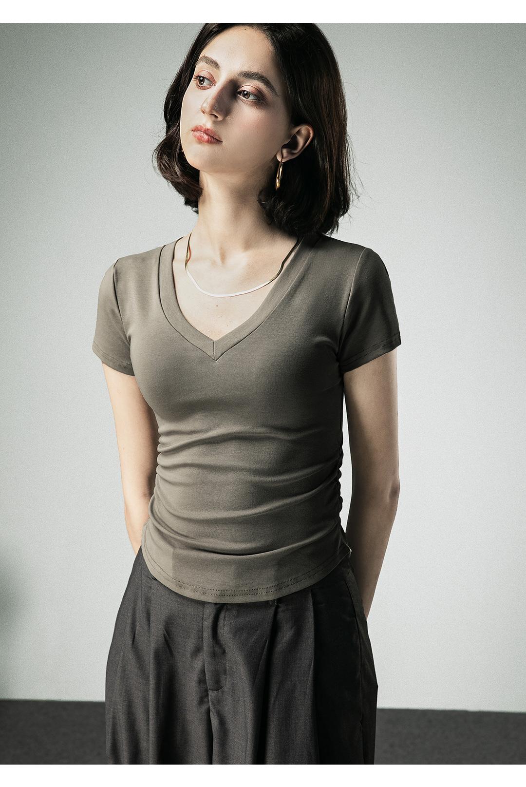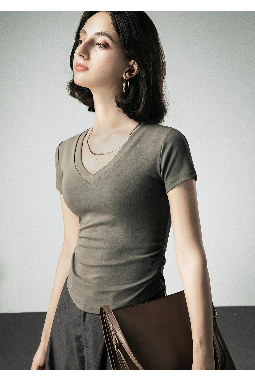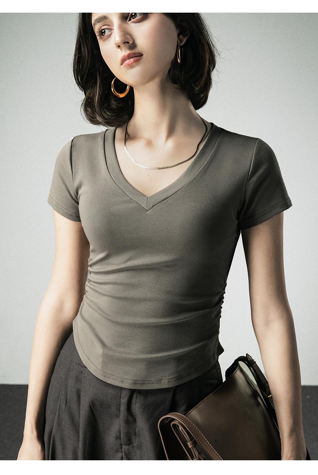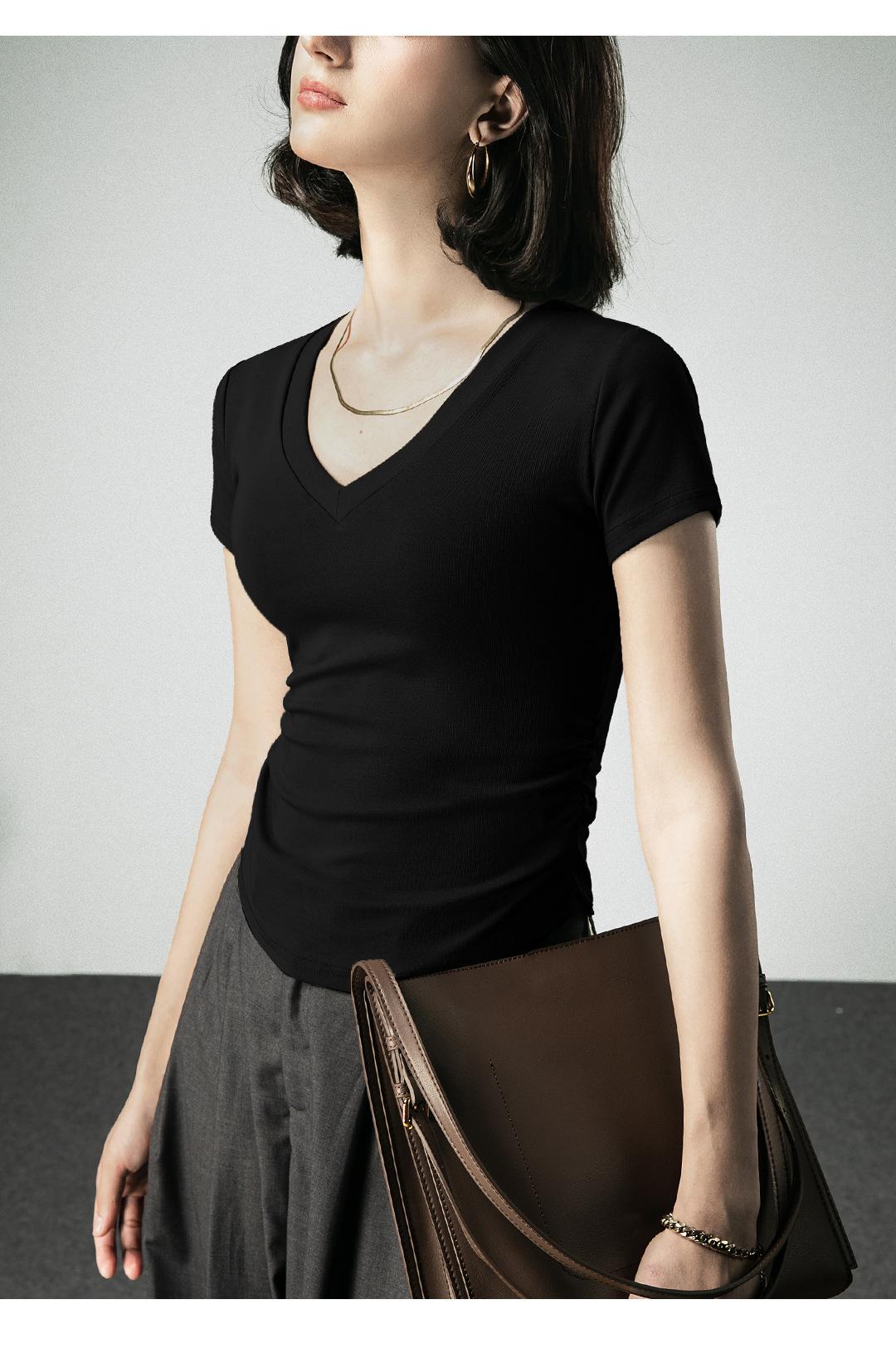 Camiseta básica de verano con cuello en V y manga corta, diseño de cintura, color liso, corte ajustado