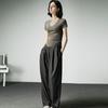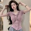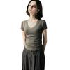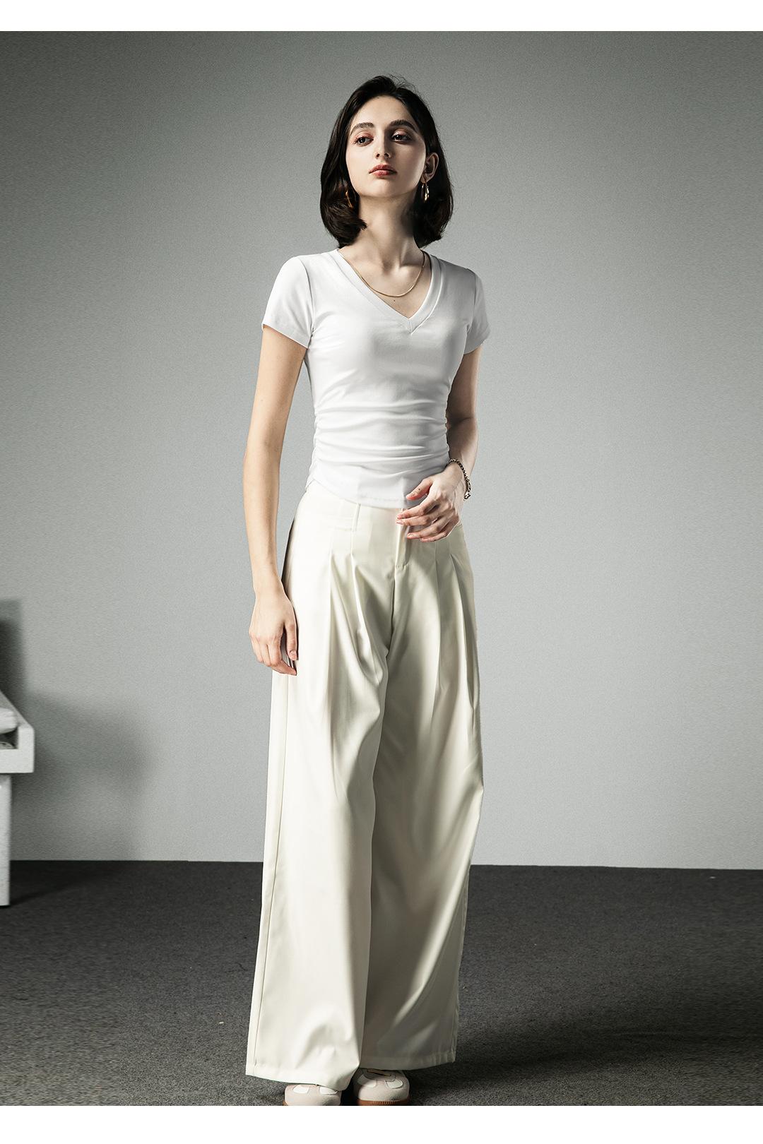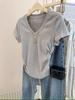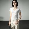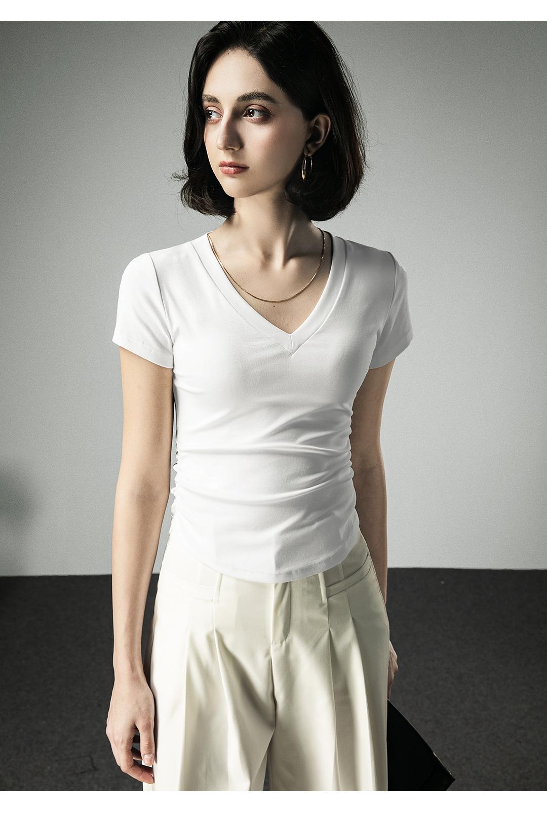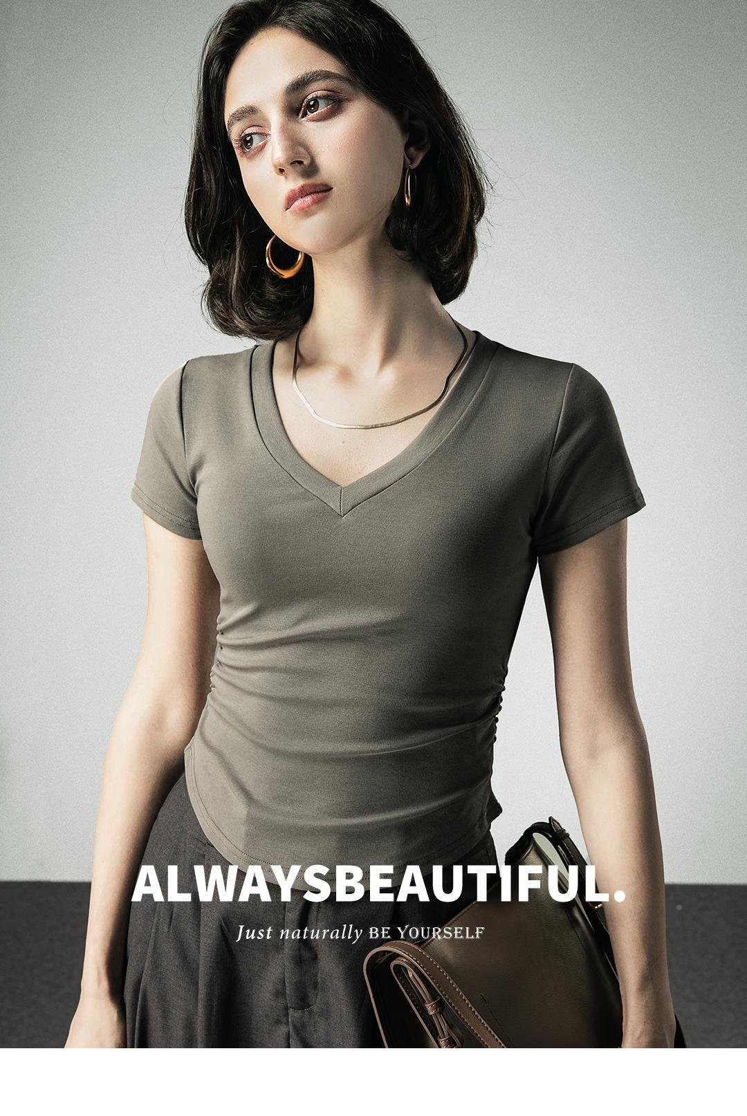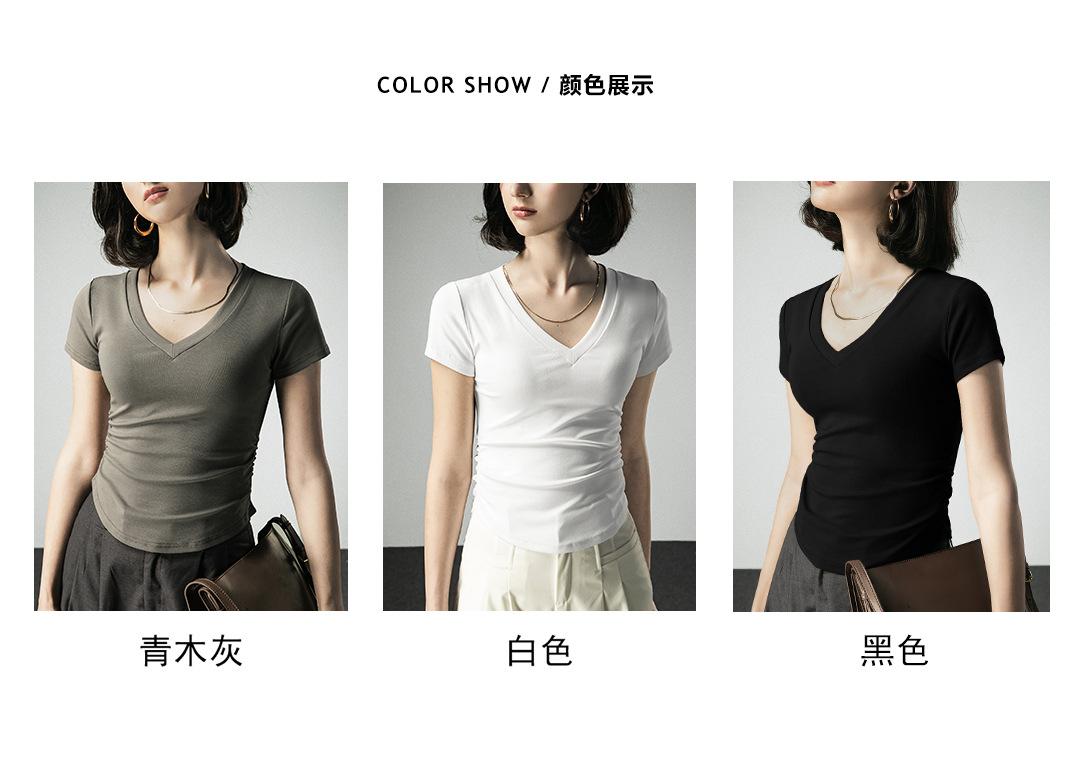 Camiseta básica de verano con cuello en V y manga corta, diseño de cintura, color liso, corte ajustado
