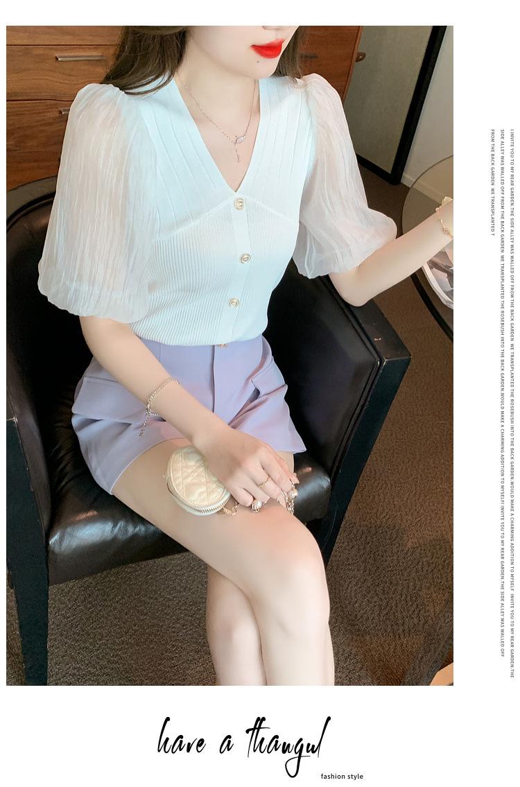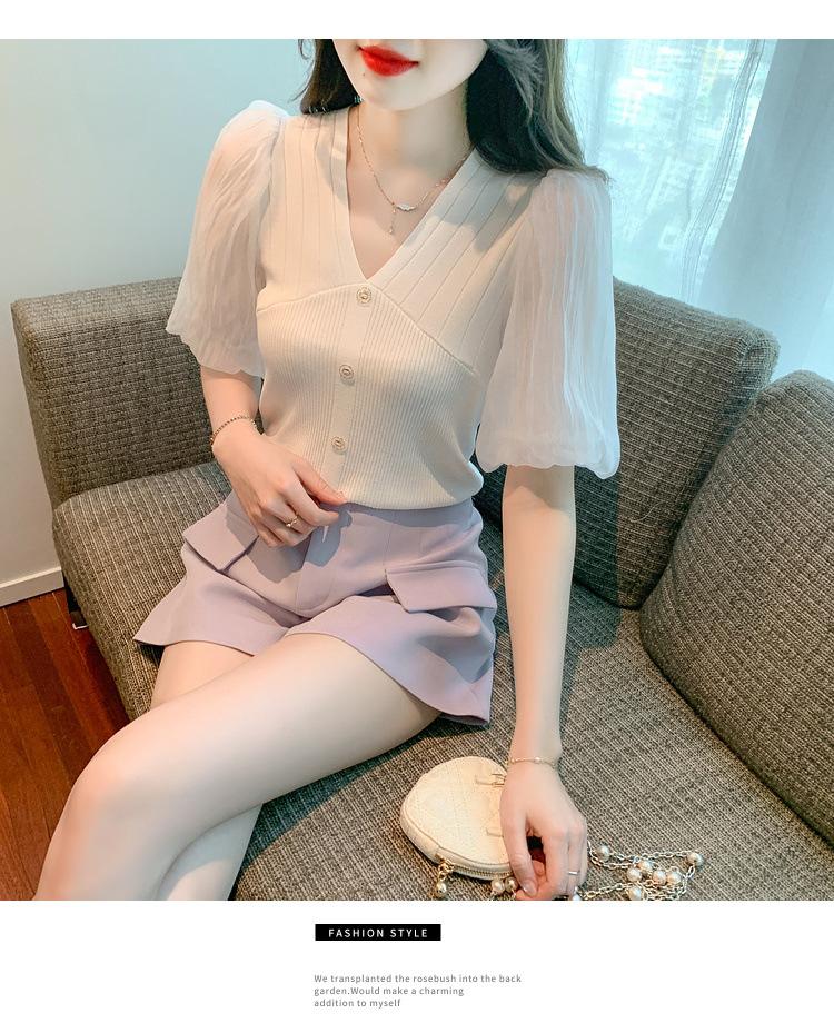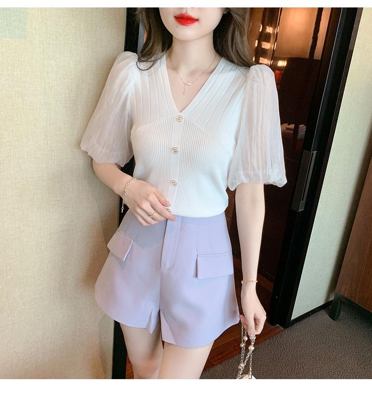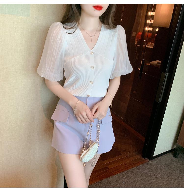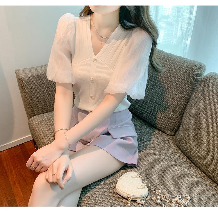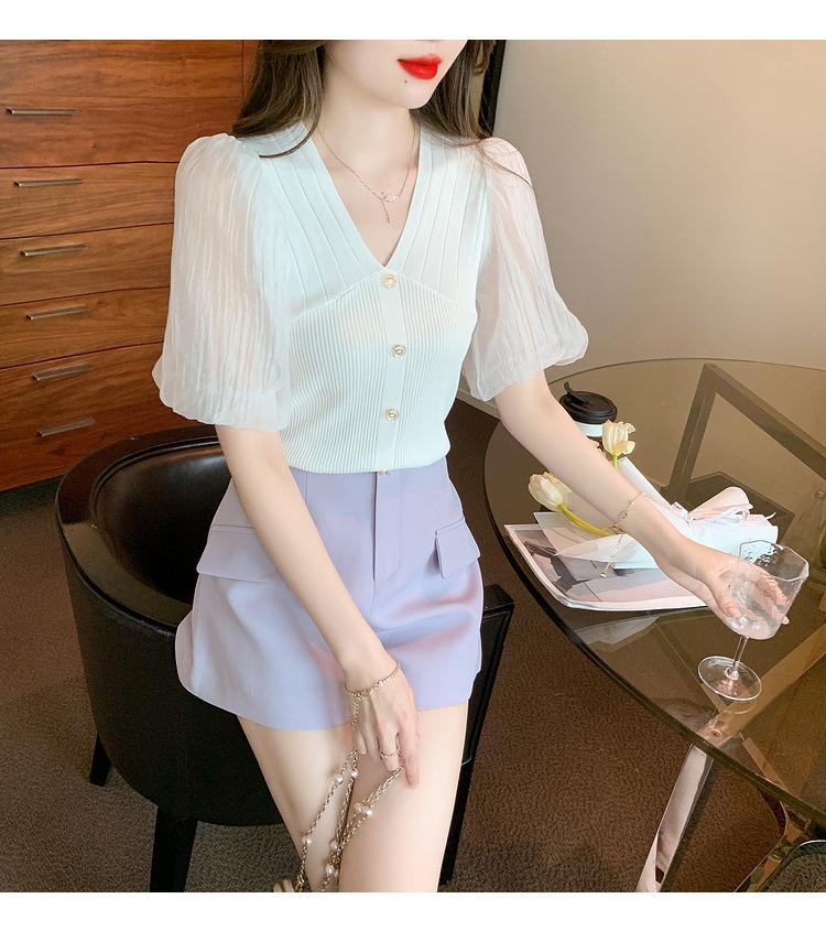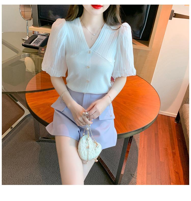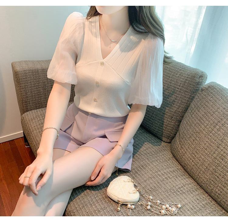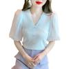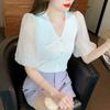2024 Nuevo Estilo de Verano Color Puro Manga Corta Empalmada Camisa de Gasa Top Cuello en V Delgada Simple Versátil Camisa Reductora de Edad para Mujer