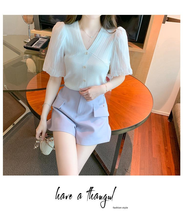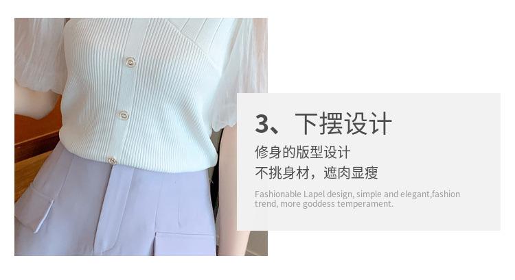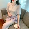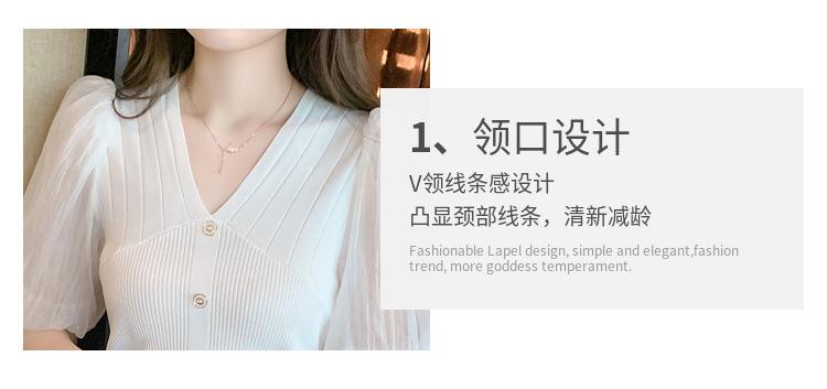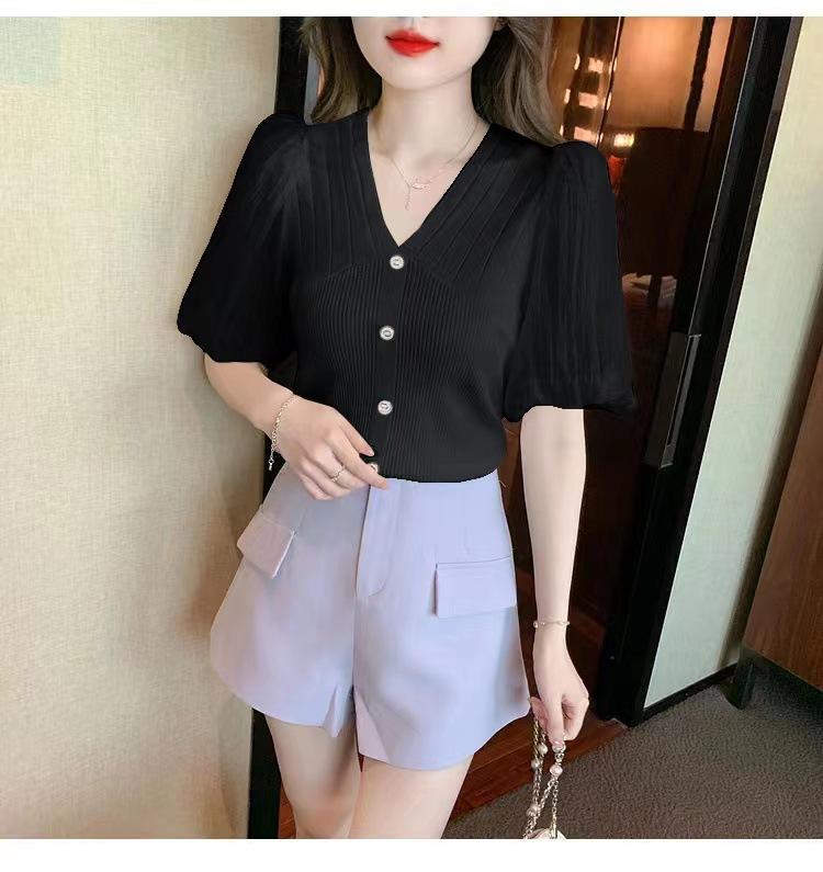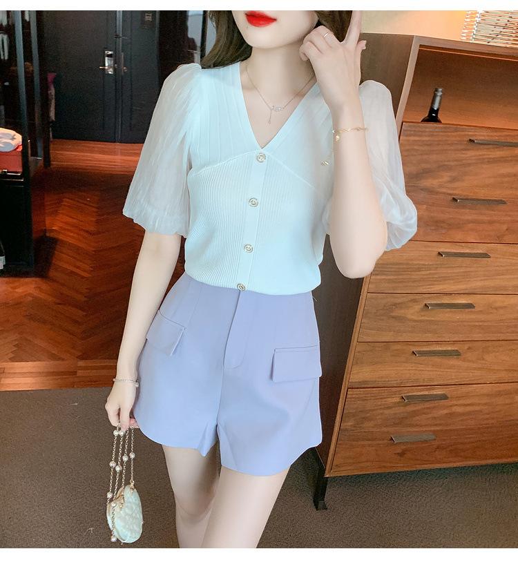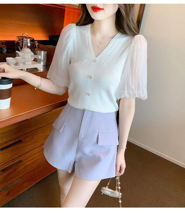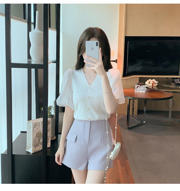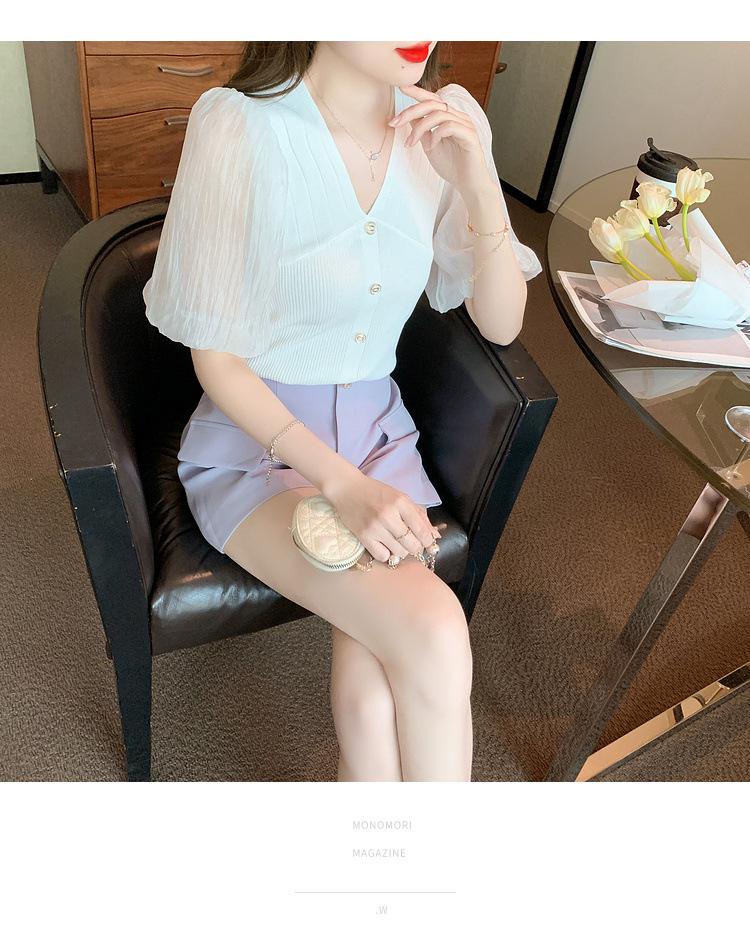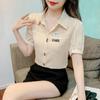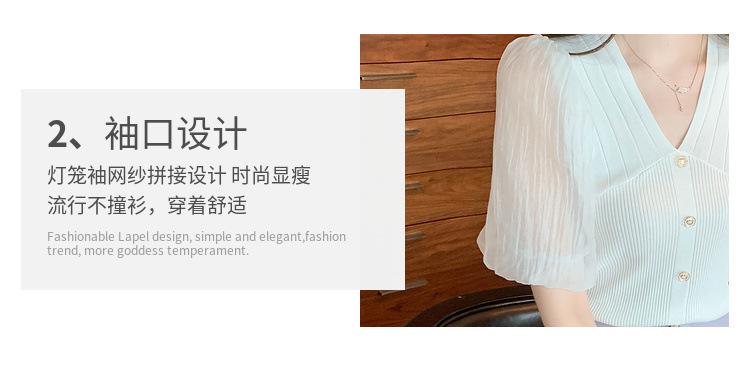 2024 Nuevo Estilo de Verano Color Puro Manga Corta Empalmada Camisa de Gasa Top Cuello en V Delgada Simple Versátil Camisa Reductora de Edad para Mujer