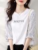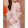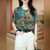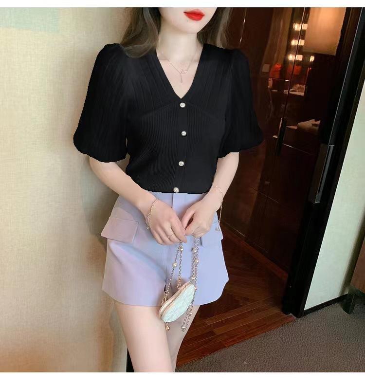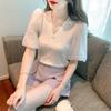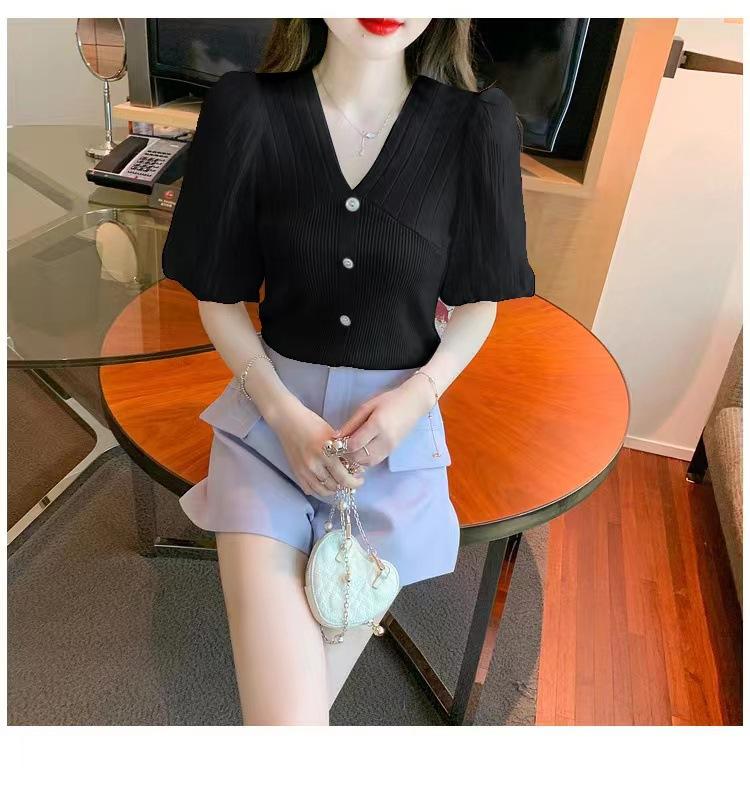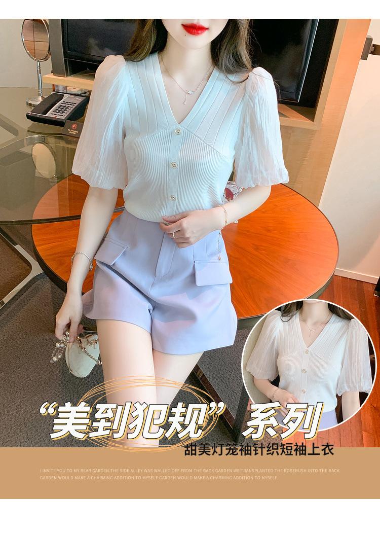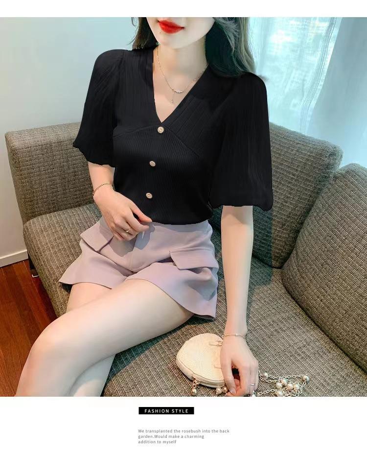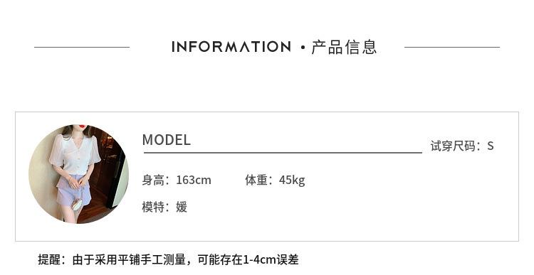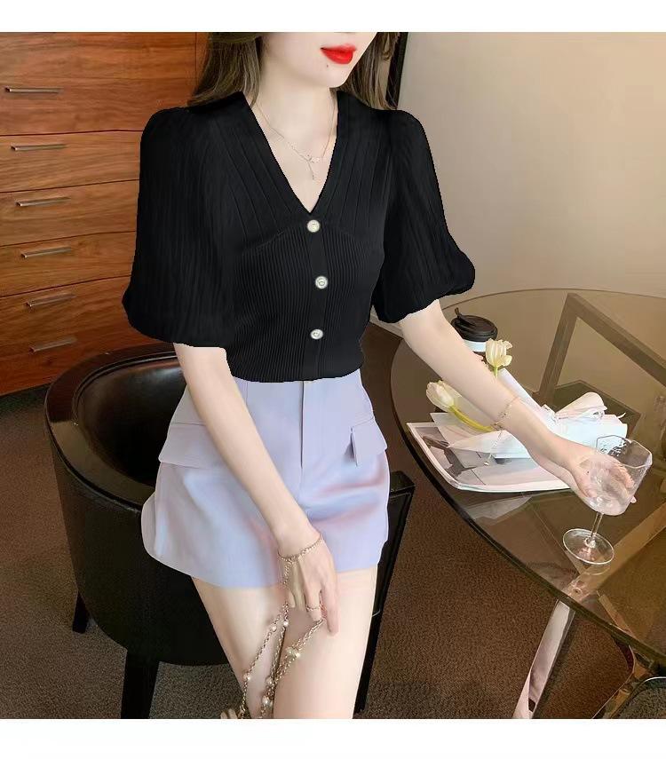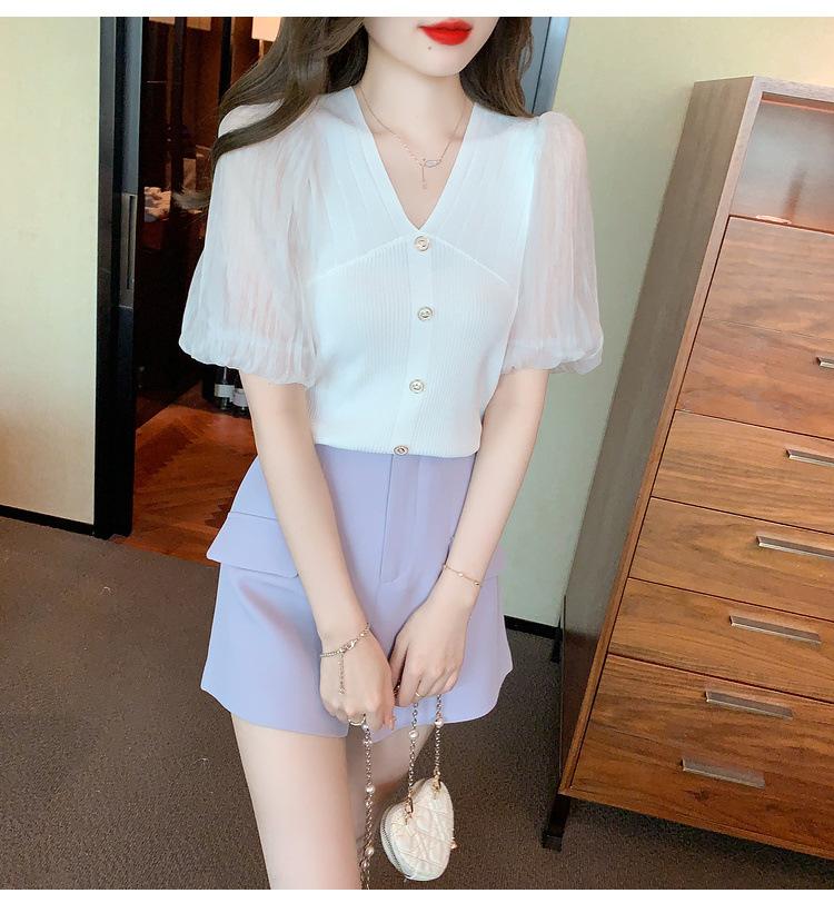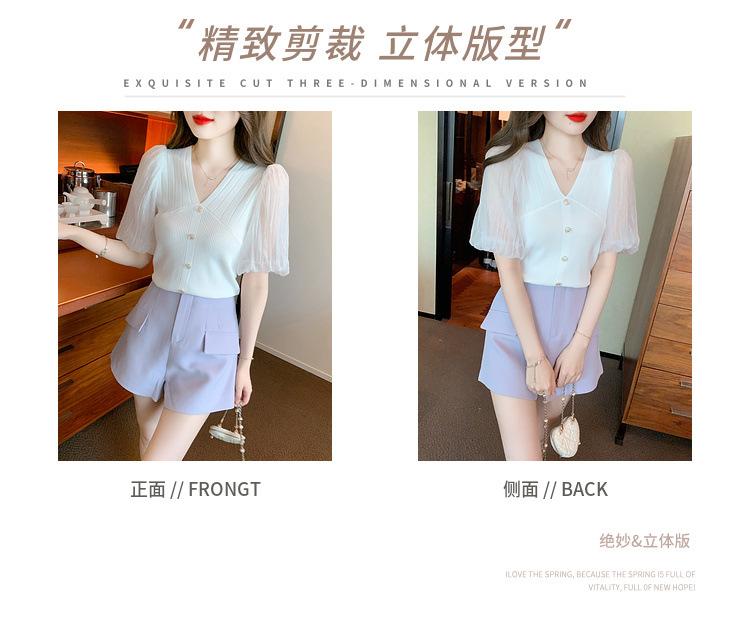 2024 Nuevo Estilo de Verano Color Puro Manga Corta Empalmada Camisa de Gasa Top Cuello en V Delgada Simple Versátil Camisa Reductora de Edad para Mujer