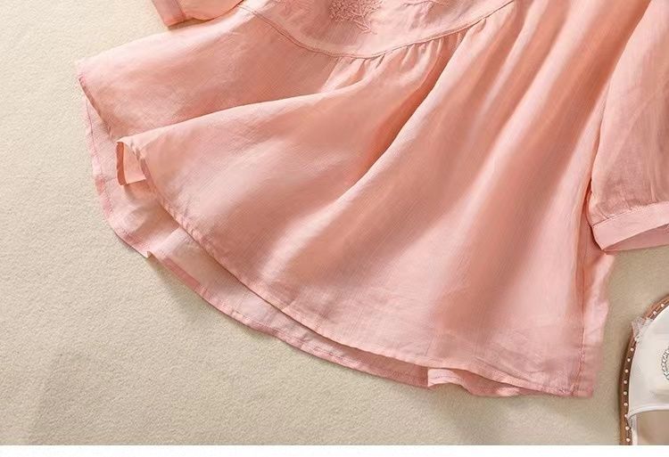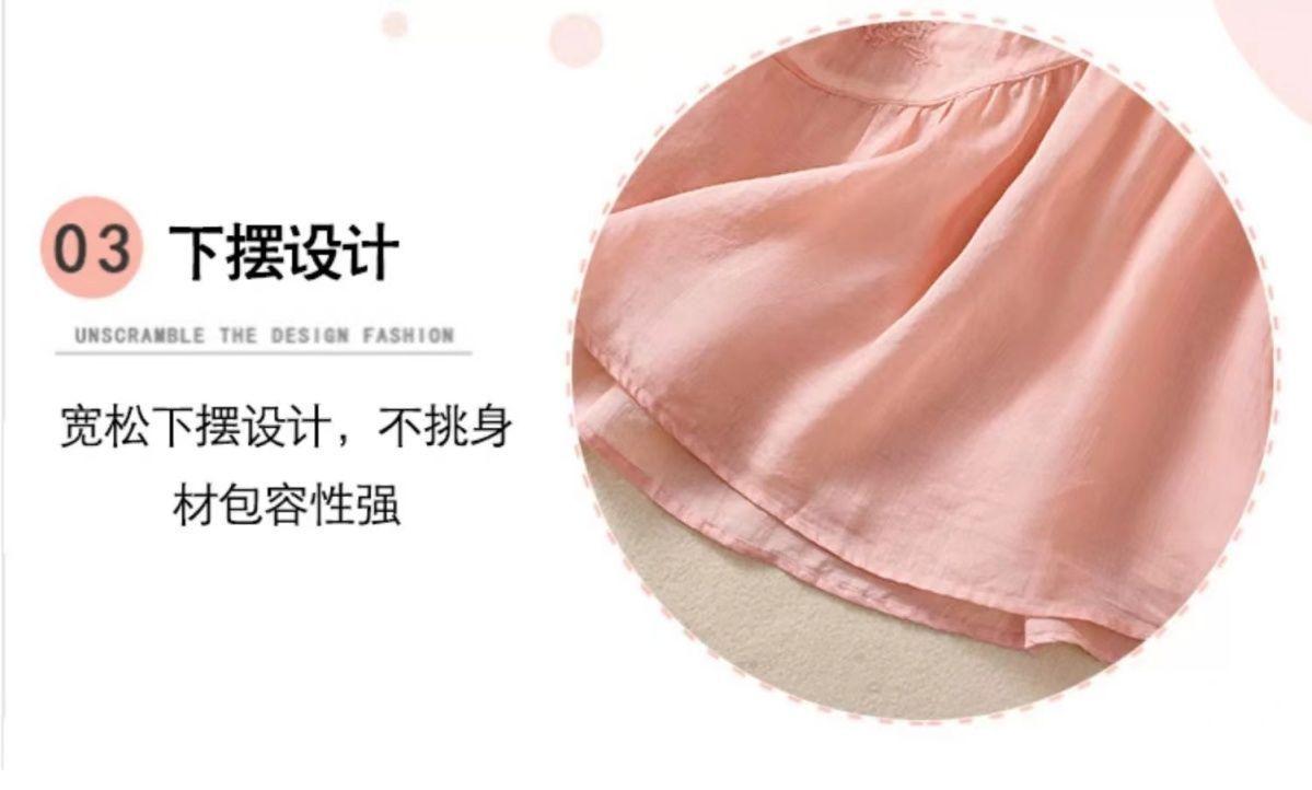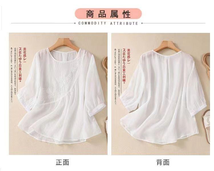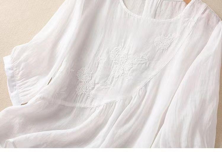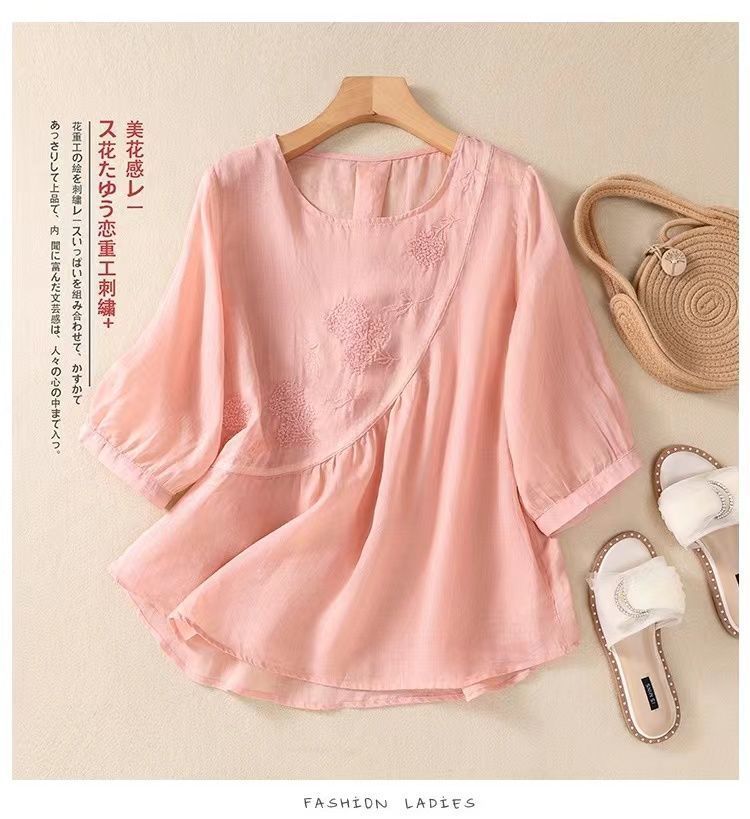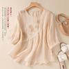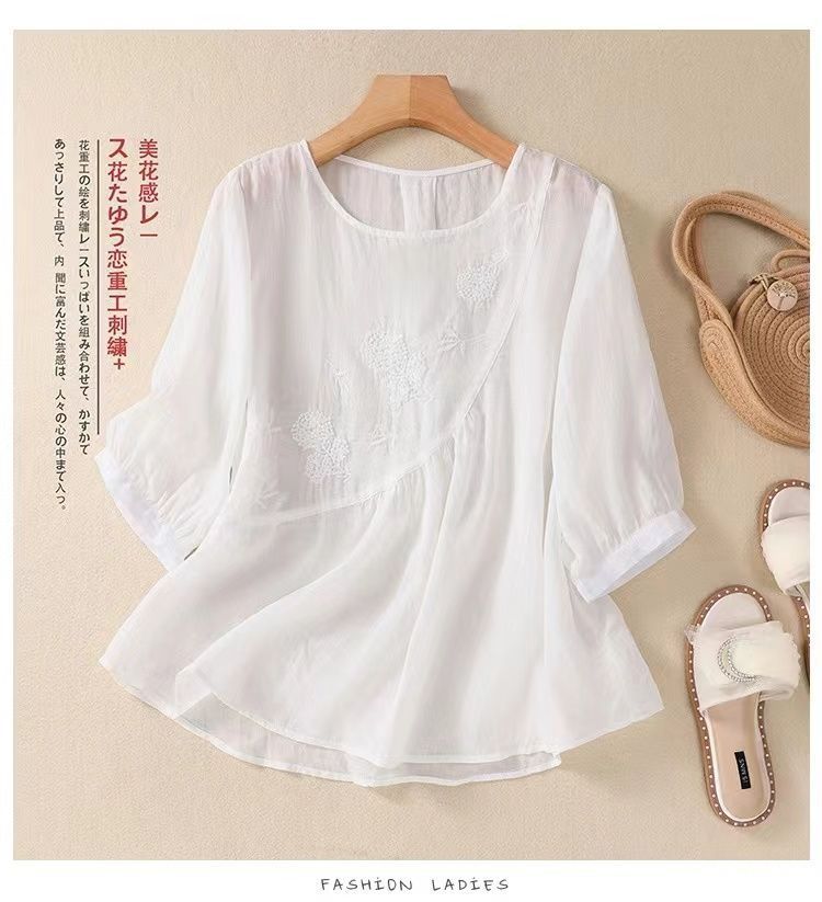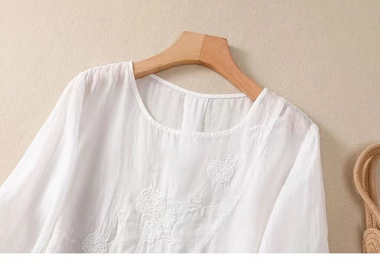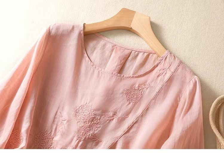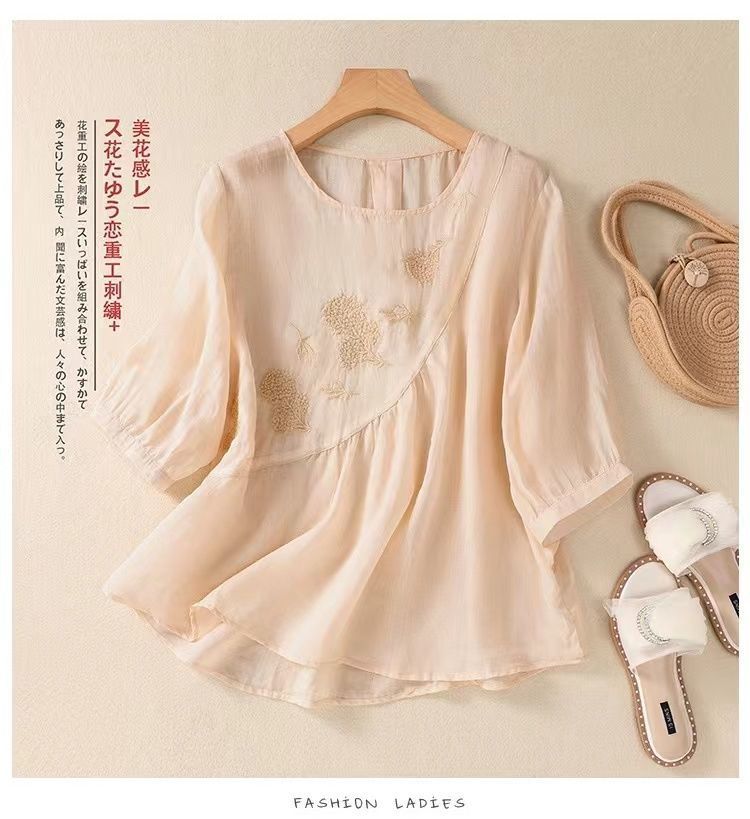 Camiseta de verano de nuevo estilo, color liso, estilo retro artístico, bordada en algodón y lino, camisa pequeña, holgada, cuello redondo.