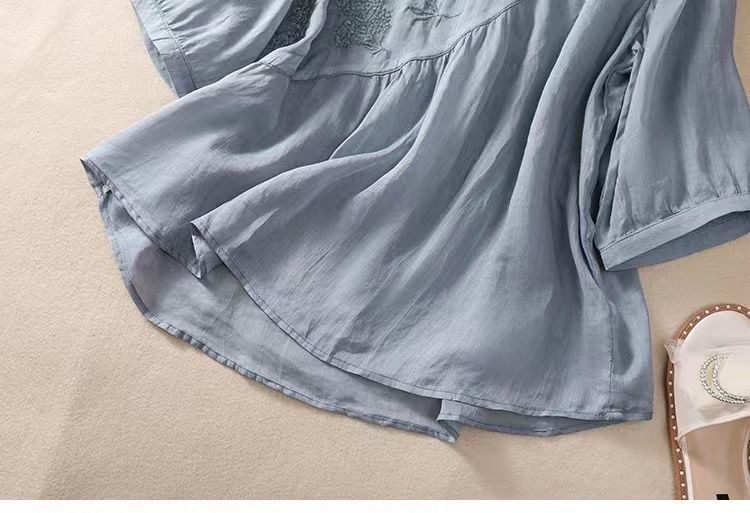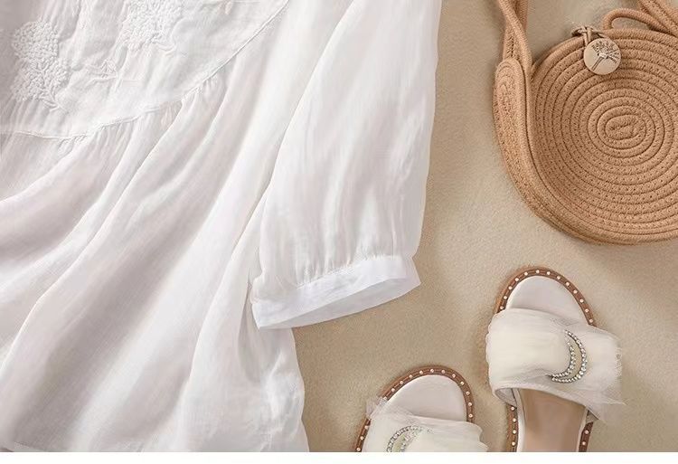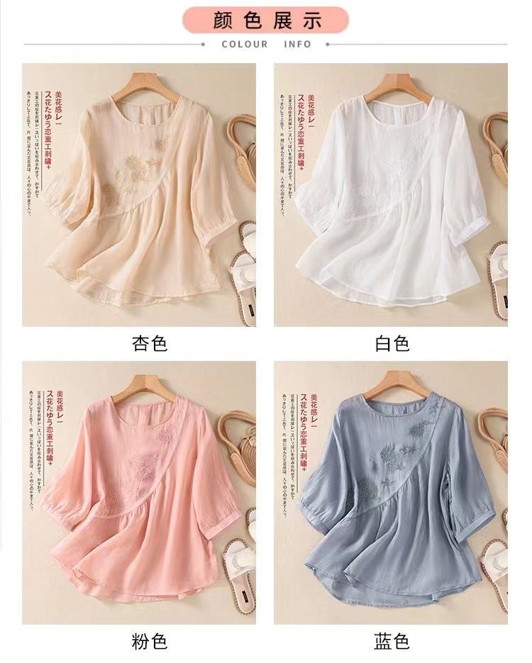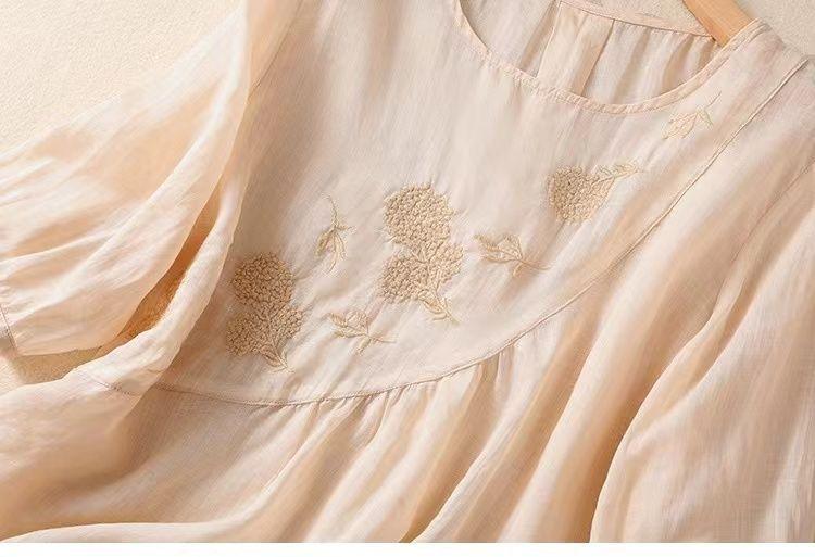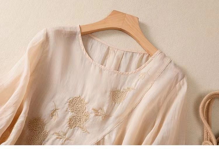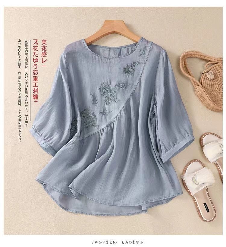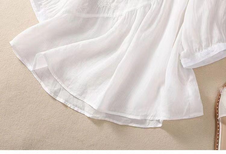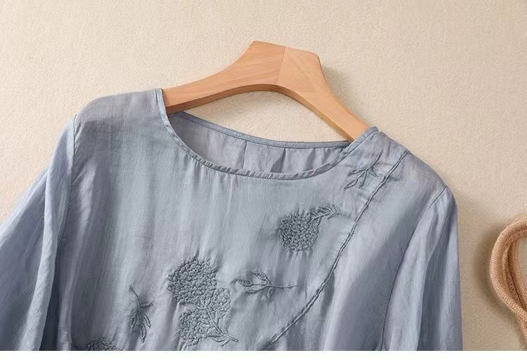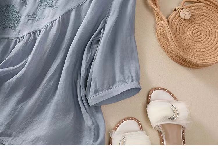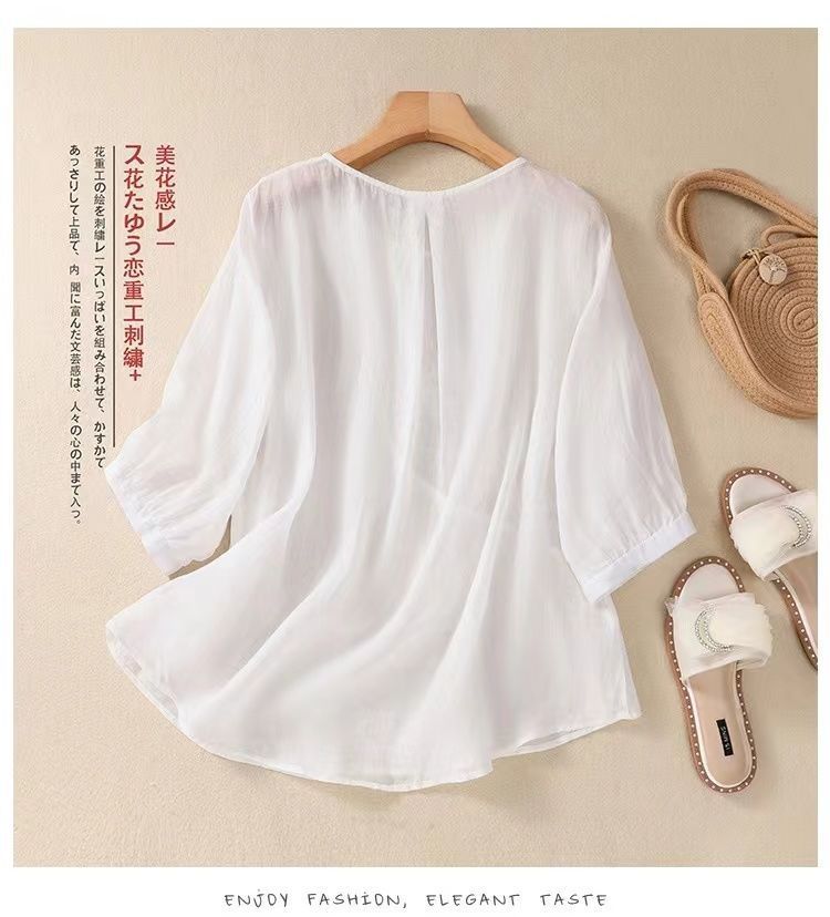 Camiseta de verano de nuevo estilo, color liso, estilo retro artístico, bordada en algodón y lino, camisa pequeña, holgada, cuello redondo.