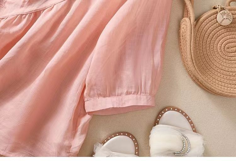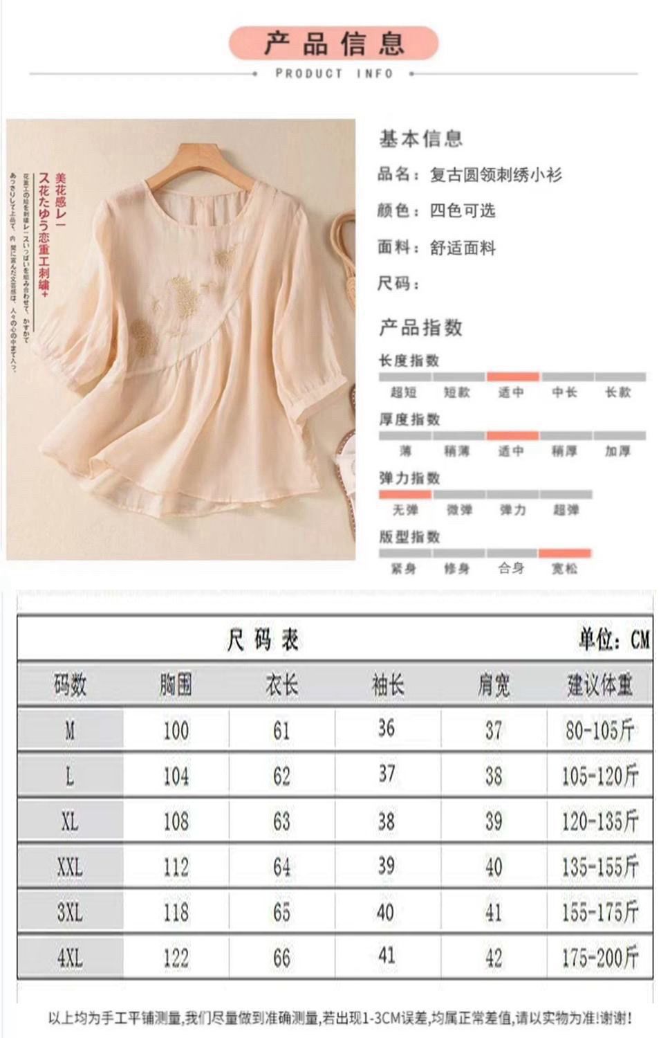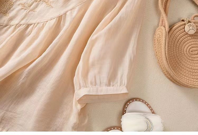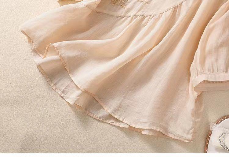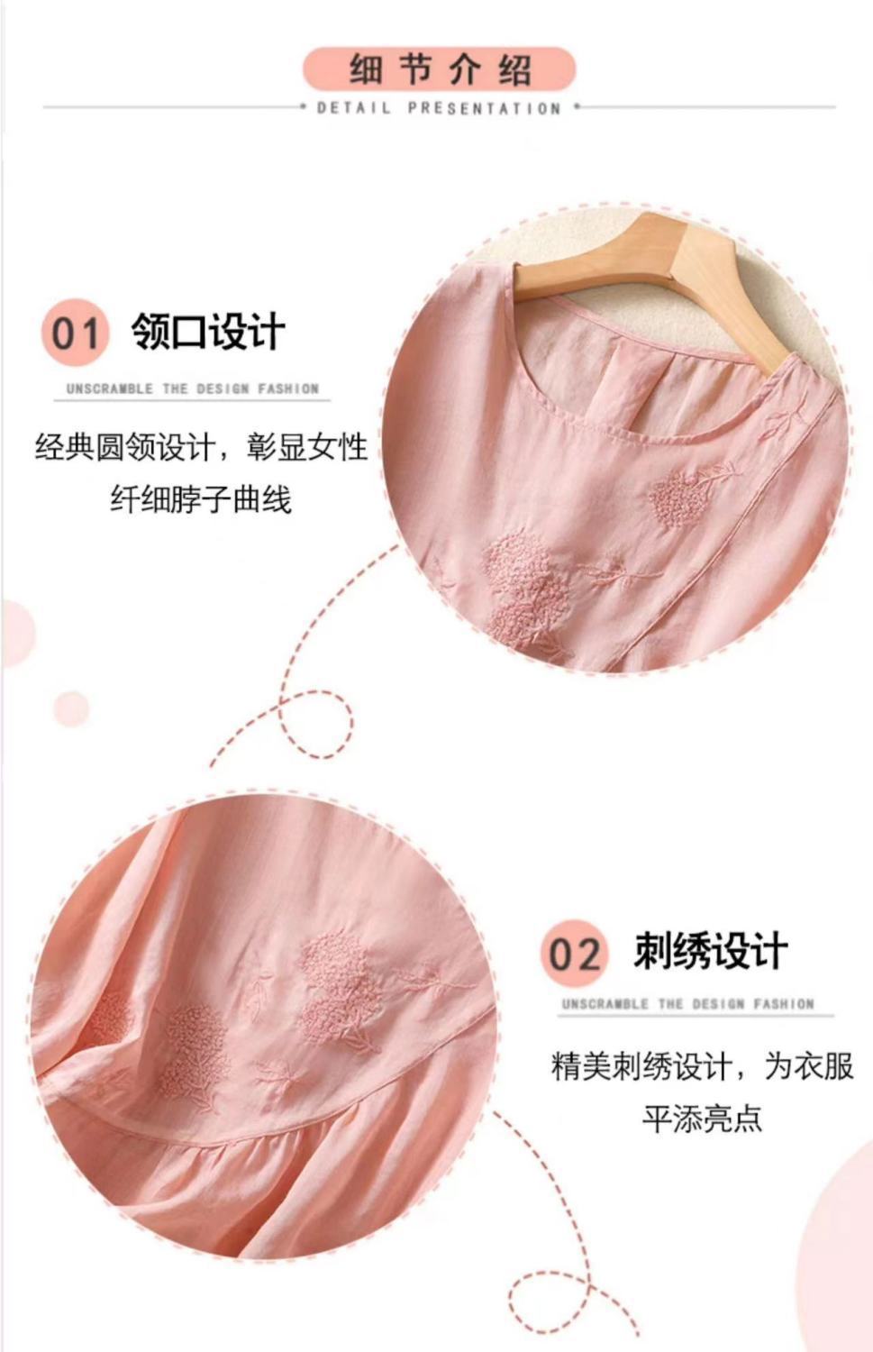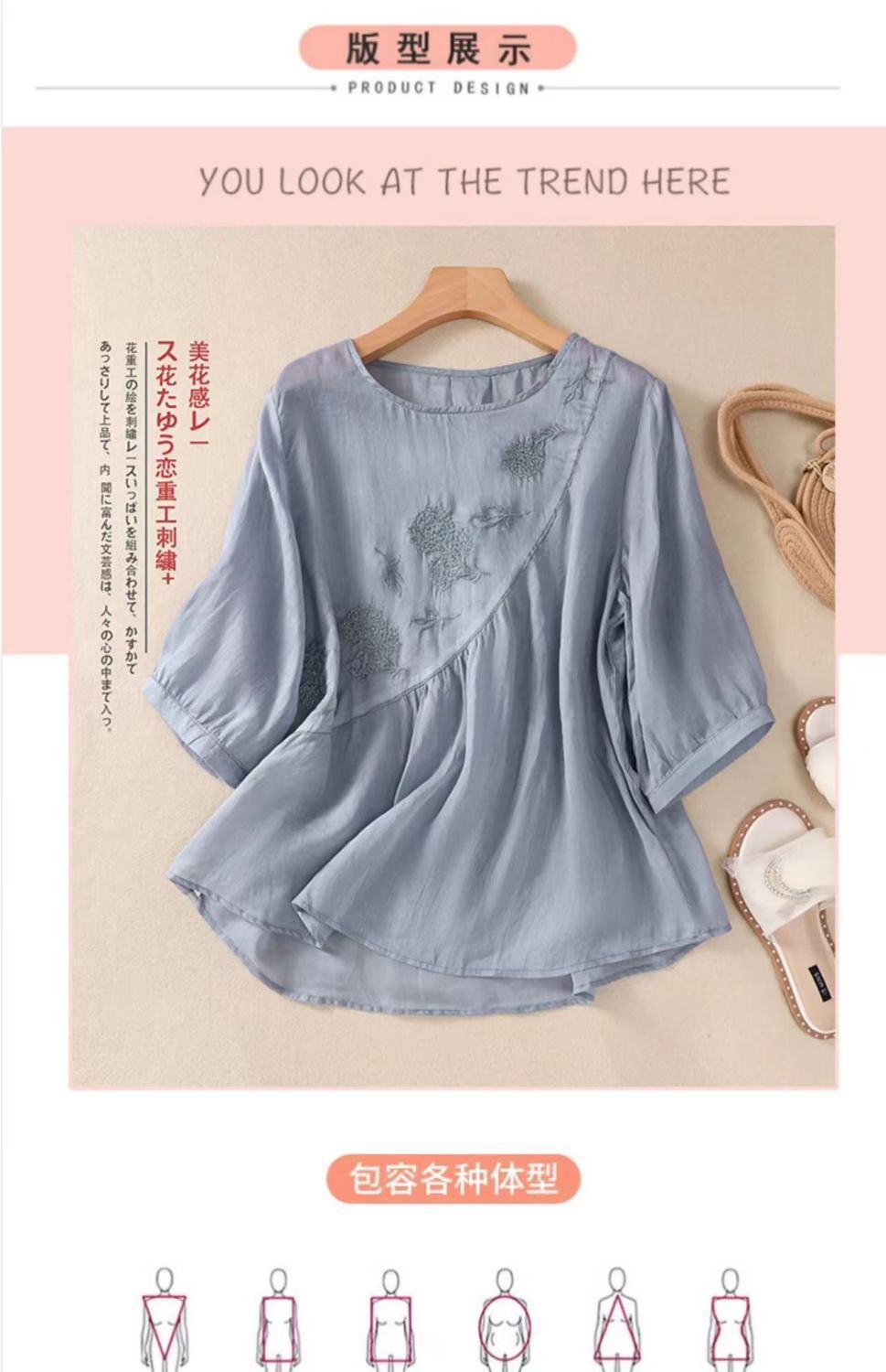 Camiseta de verano de nuevo estilo, color liso, estilo retro artístico, bordada en algodón y lino, camisa pequeña, holgada, cuello redondo.