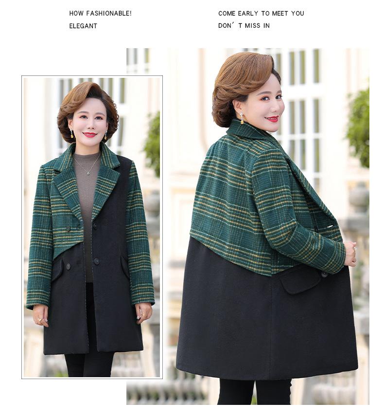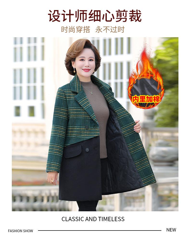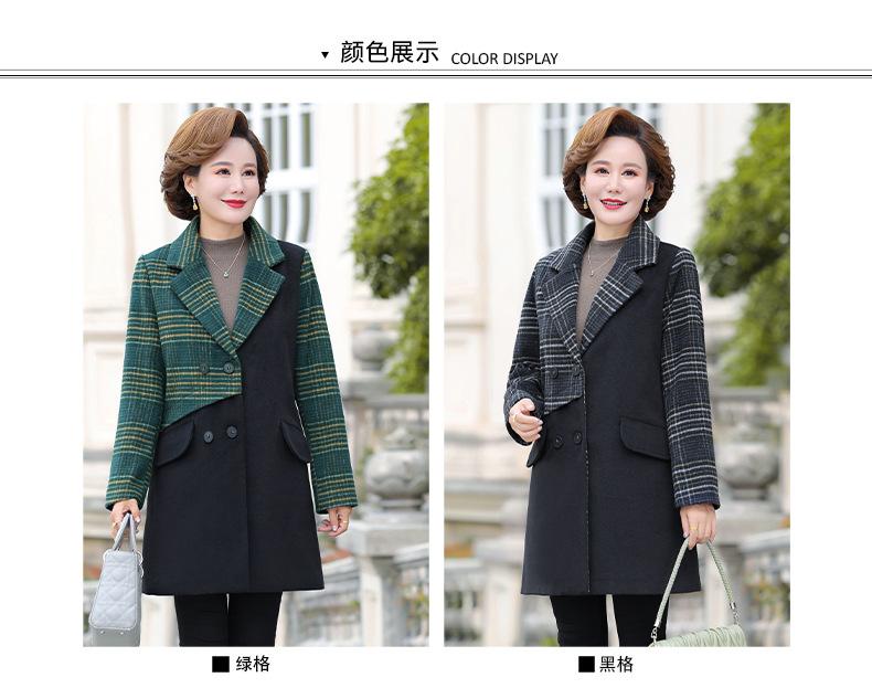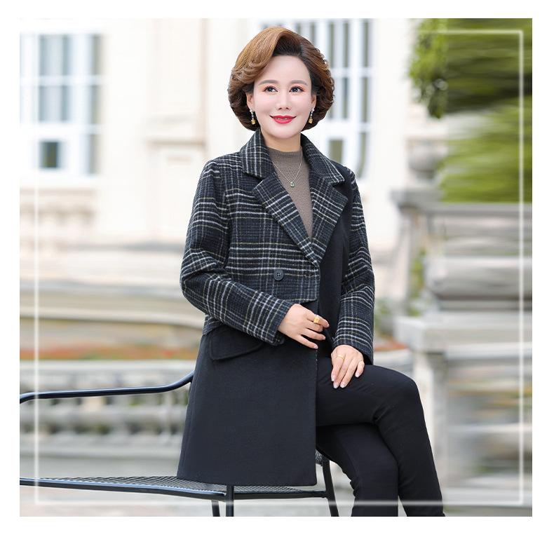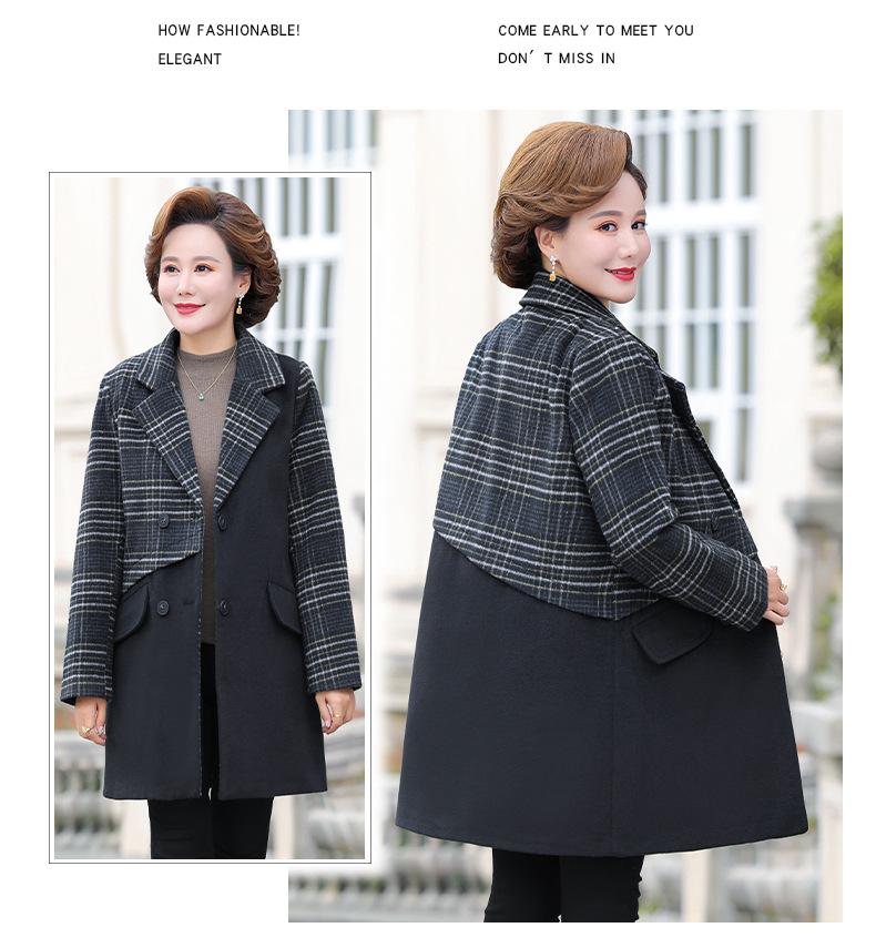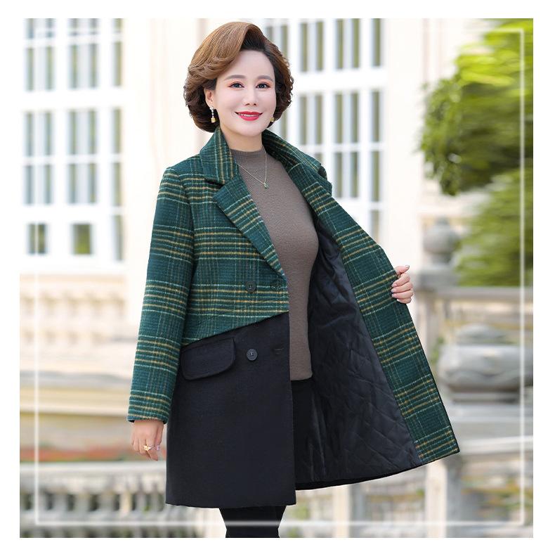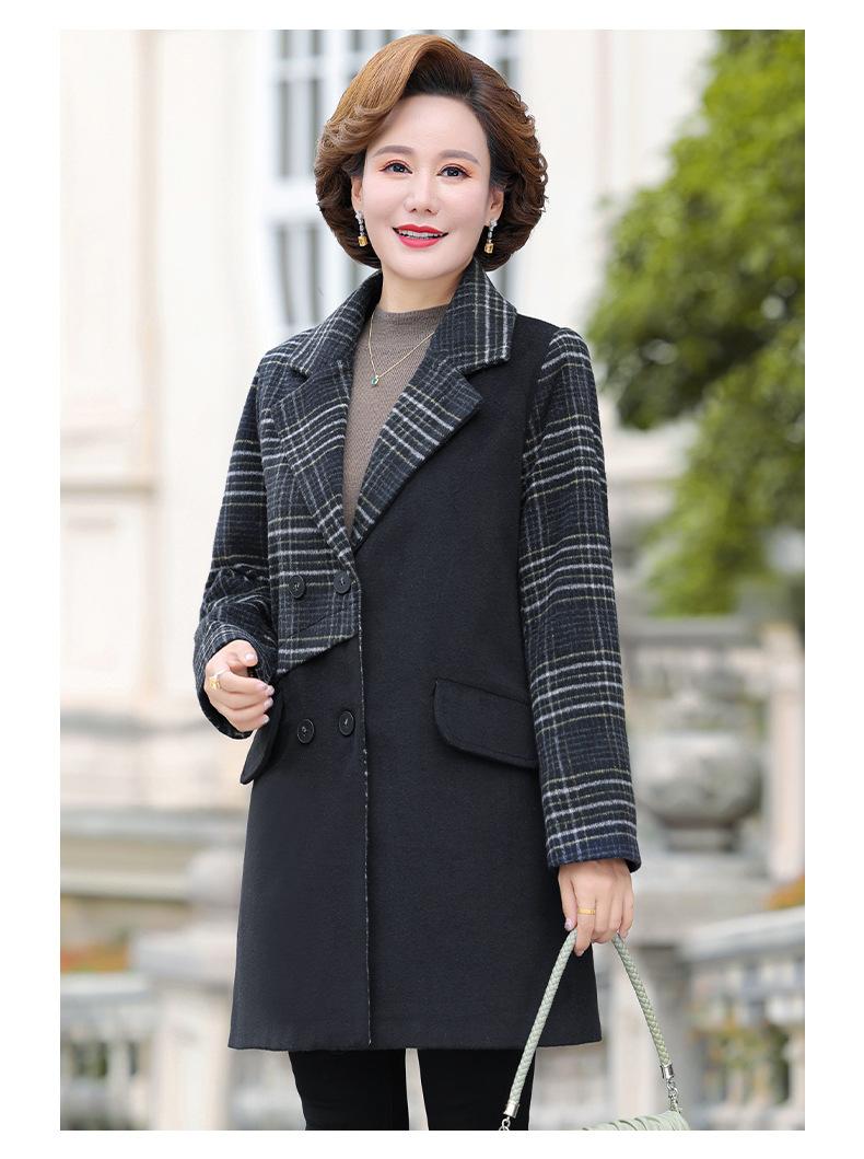 Abrigo de lana de invierno de longitud media con solapa de algodón y costura a cuadros para mujer de mediana edad y mayor, de talla grande, a la moda