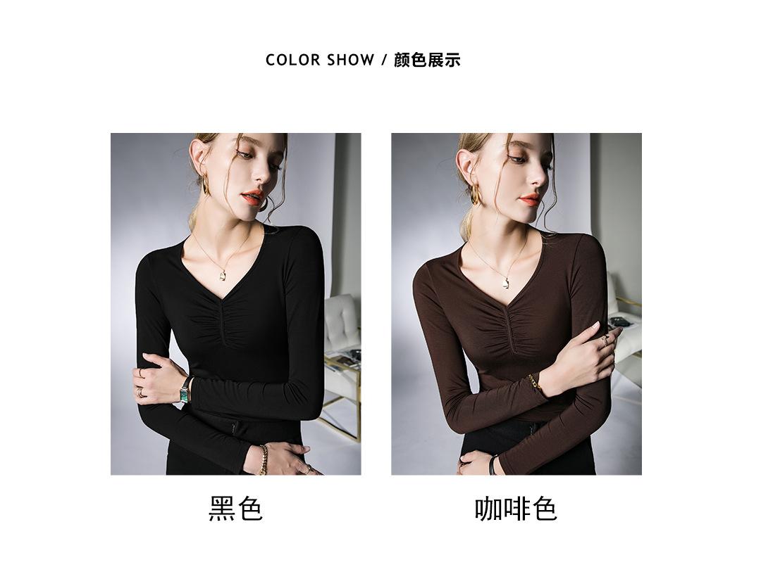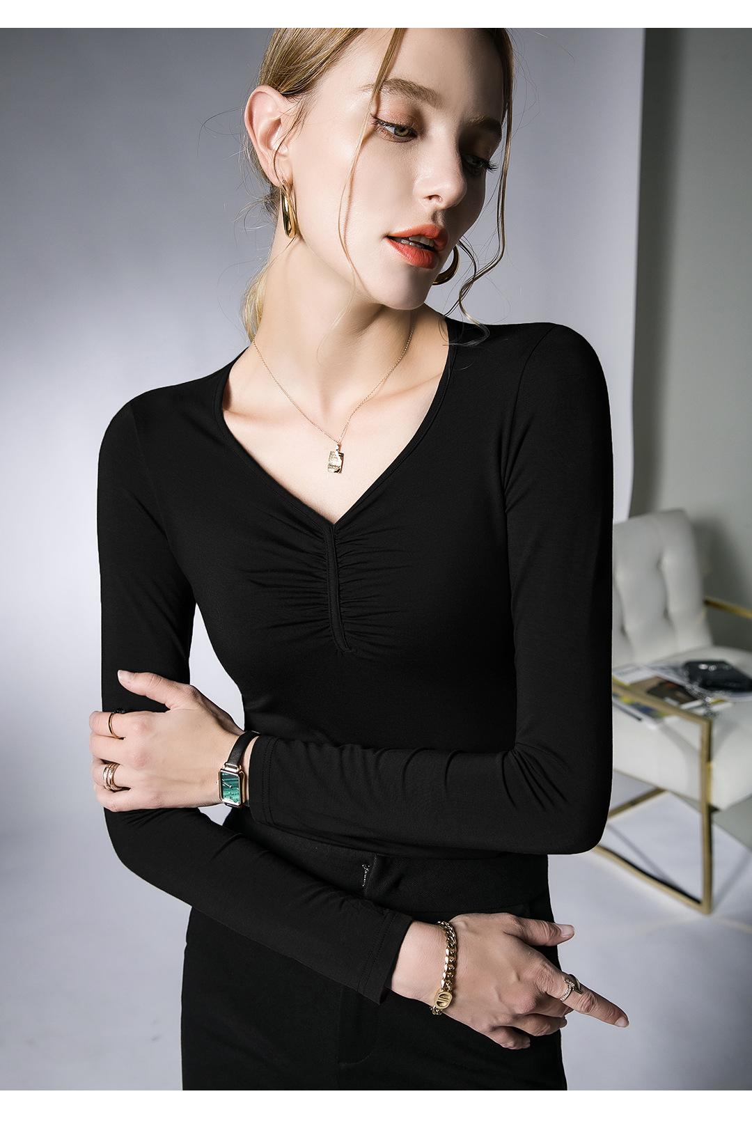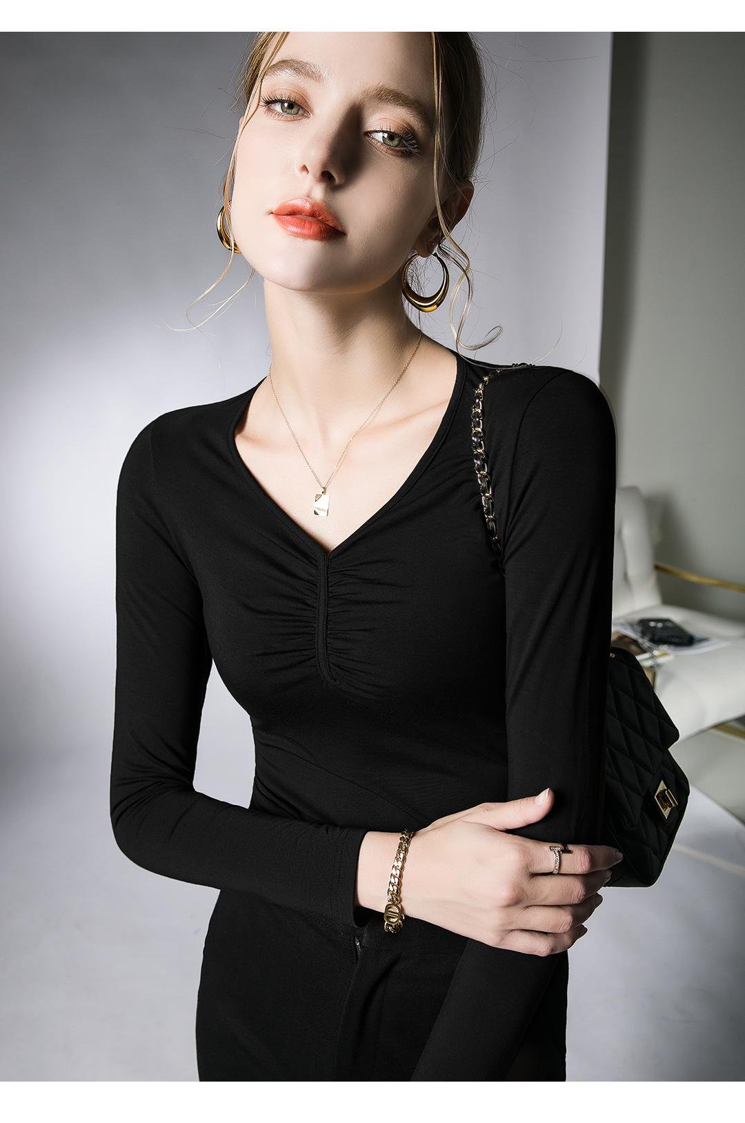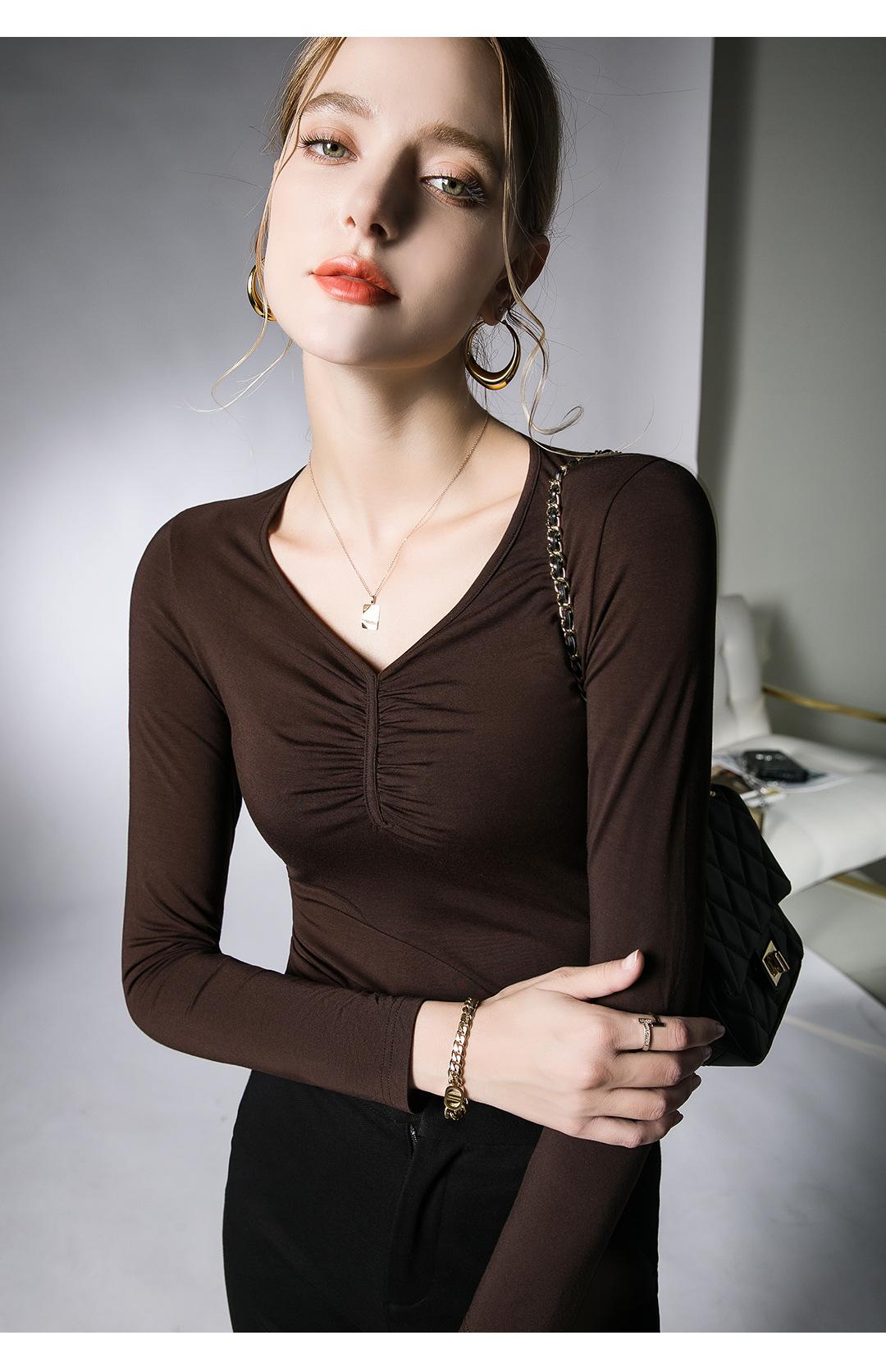 Camiseta interior sencilla de color liso que combina con todo, ajustada, elástica, con cuello en V, pequeña, de otoño, con nuevo diseño plisado, camiseta de fondo.