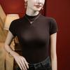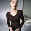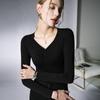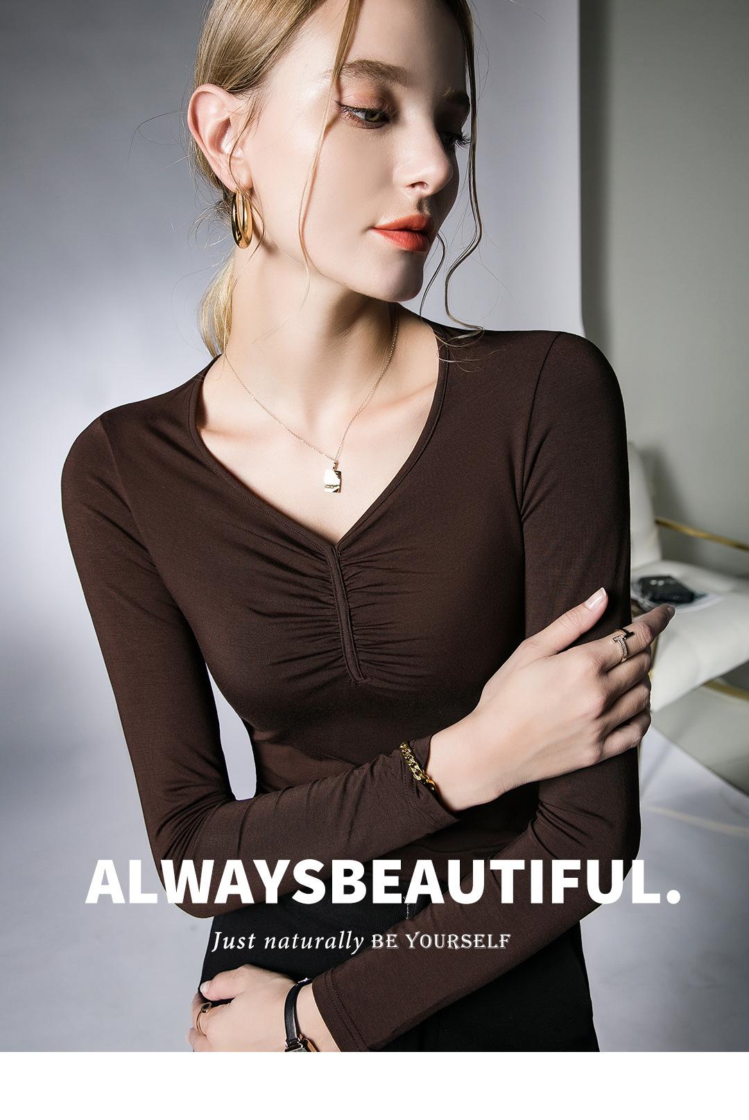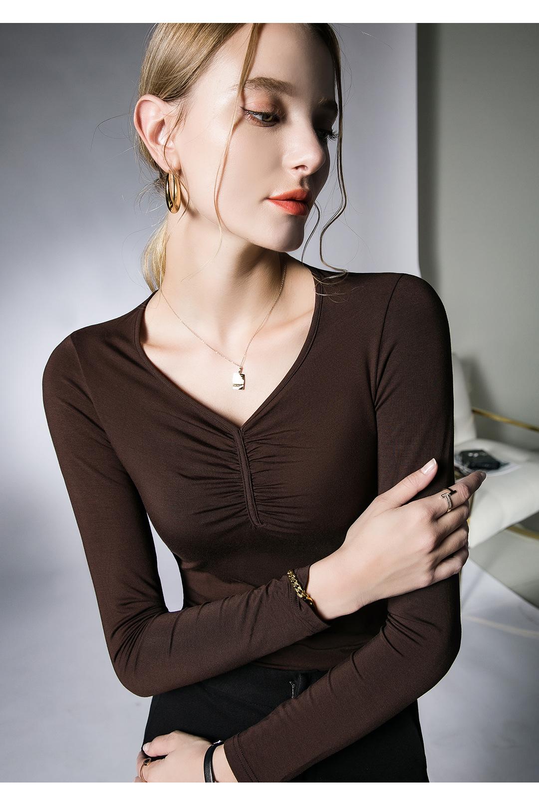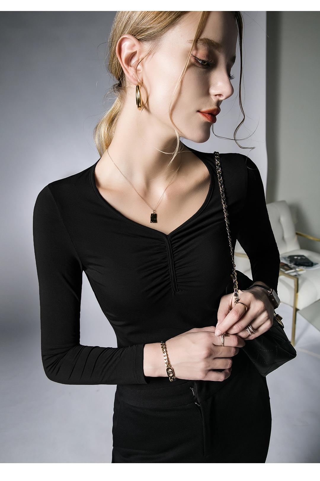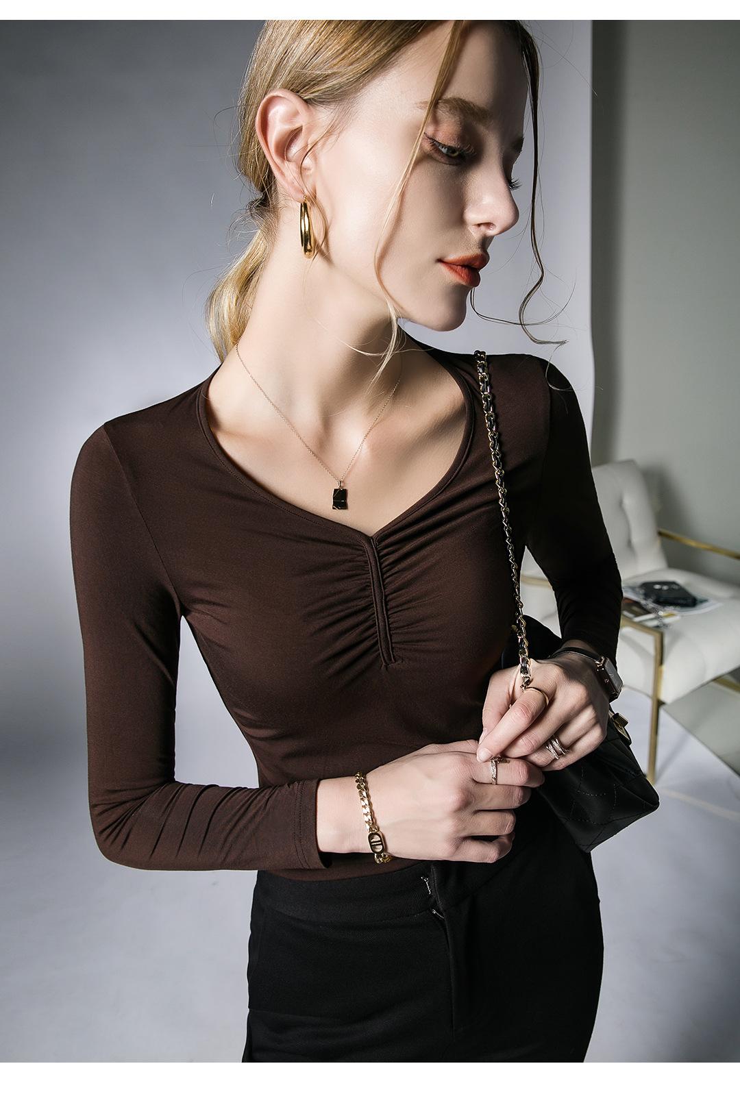 Camiseta interior sencilla de color liso que combina con todo, ajustada, elástica, con cuello en V, pequeña, de otoño, con nuevo diseño plisado, camiseta de fondo.