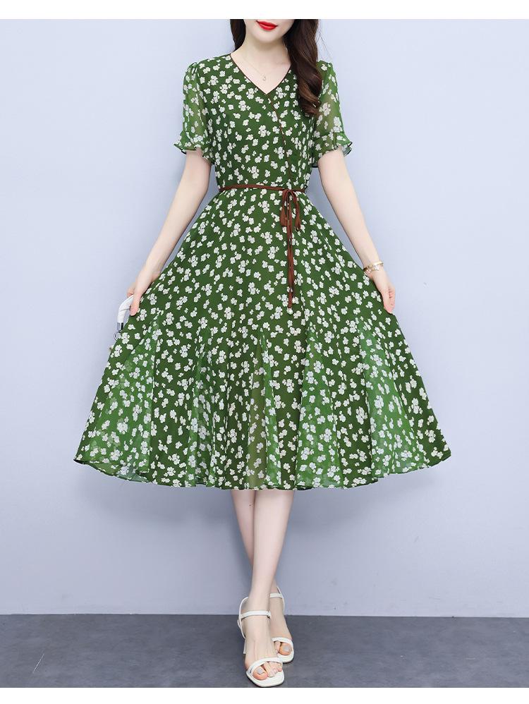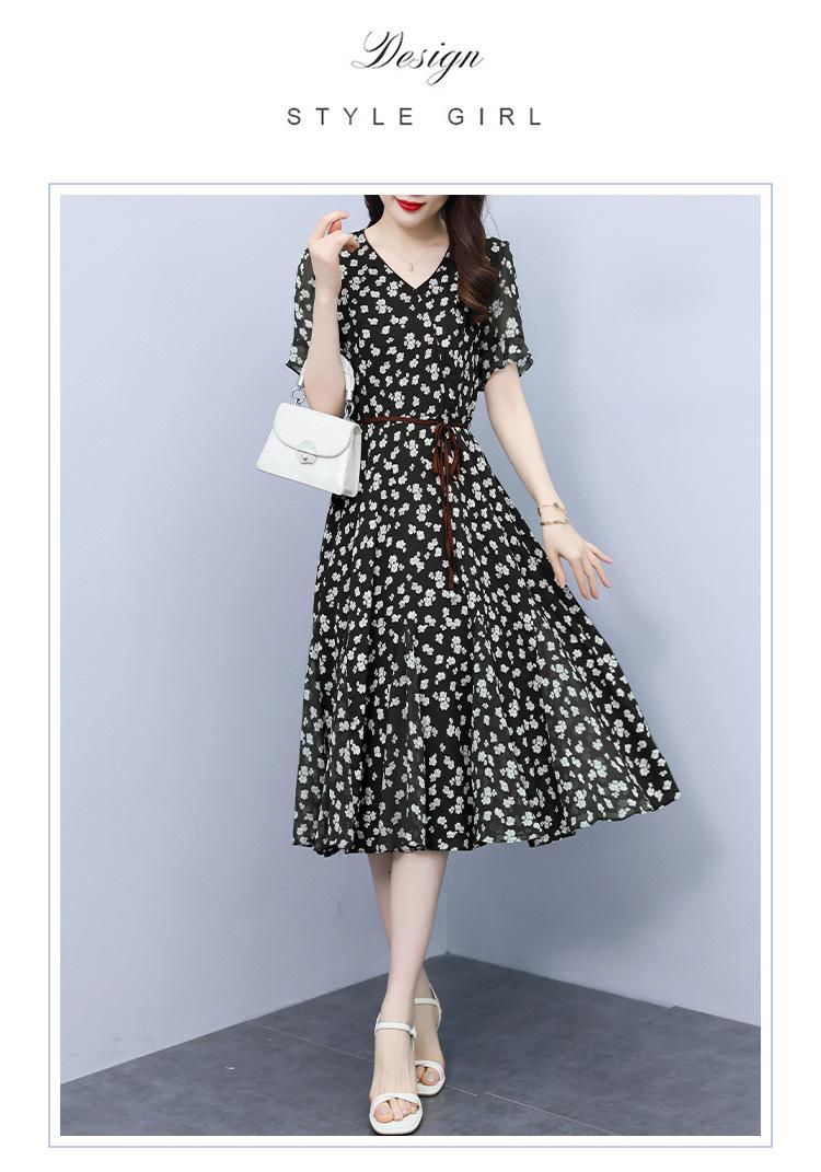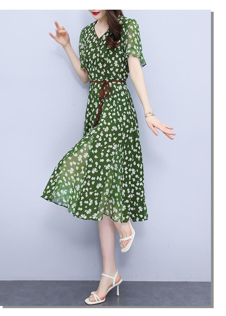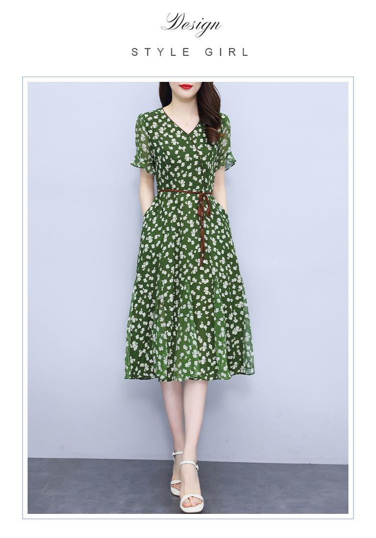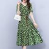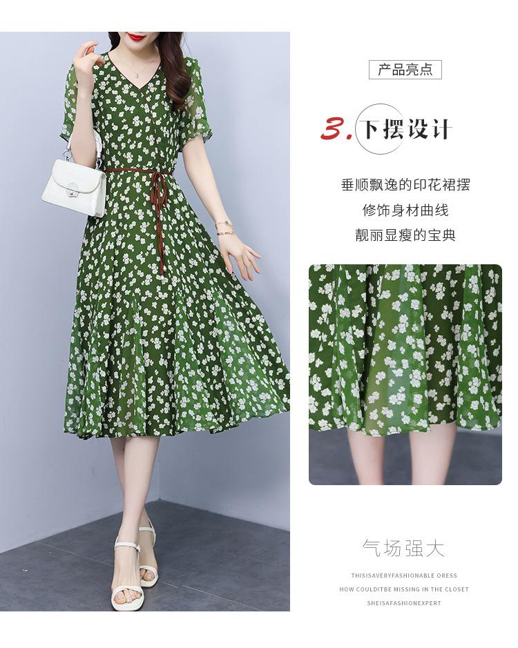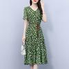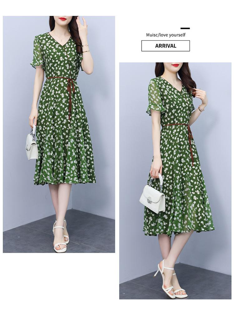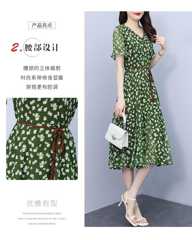 Foto Real de Estilo Lunares Cuello en V Floral 2024 Nuevo Verano Elegante Vestido de Chifón de Moda para Mujer que Cubre la Carne y Adelgaza