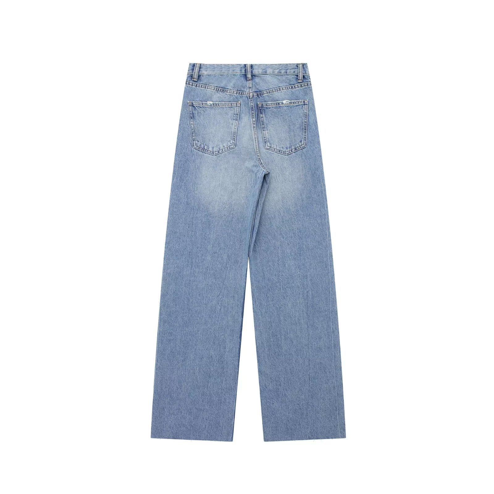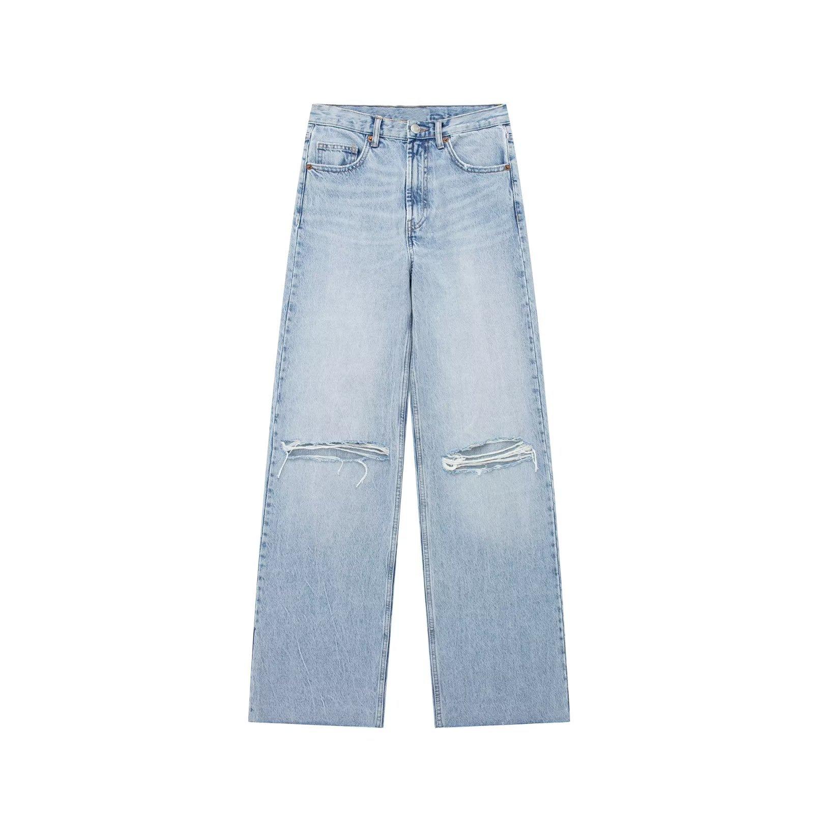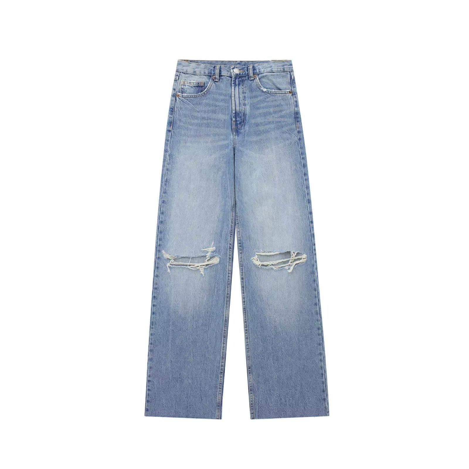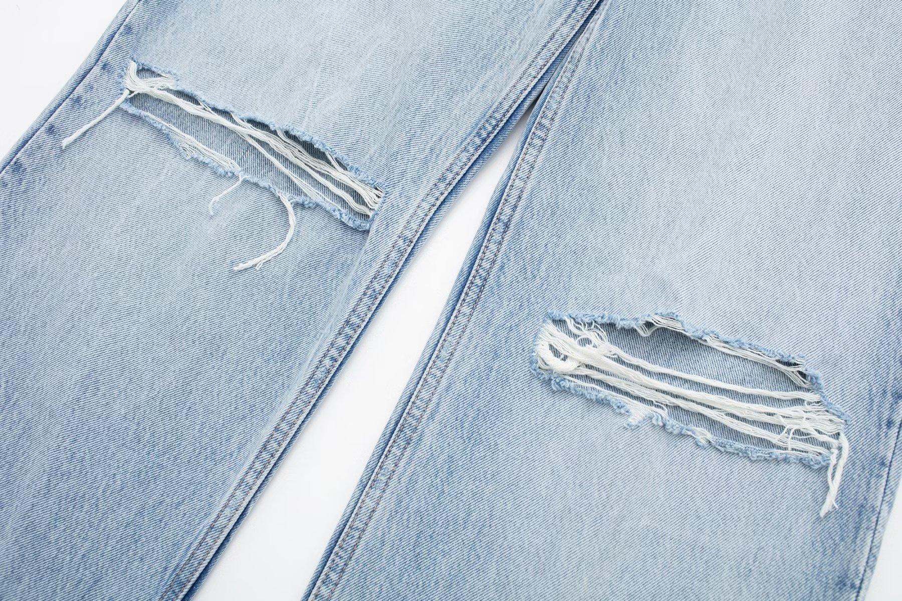 Ropa de mujer de estilo europeo y americano, novedad de 2023, pantalones vaqueros ajustados de cintura alta y pierna ancha con decoración rasgada y temperamento de chica sexy