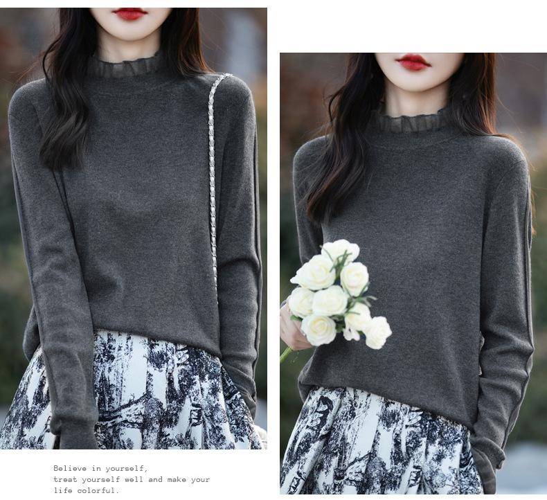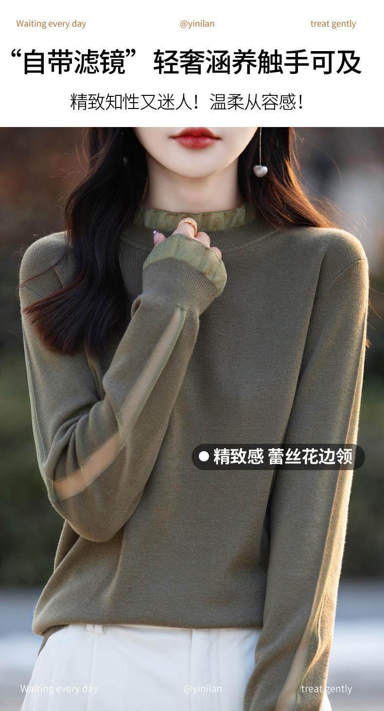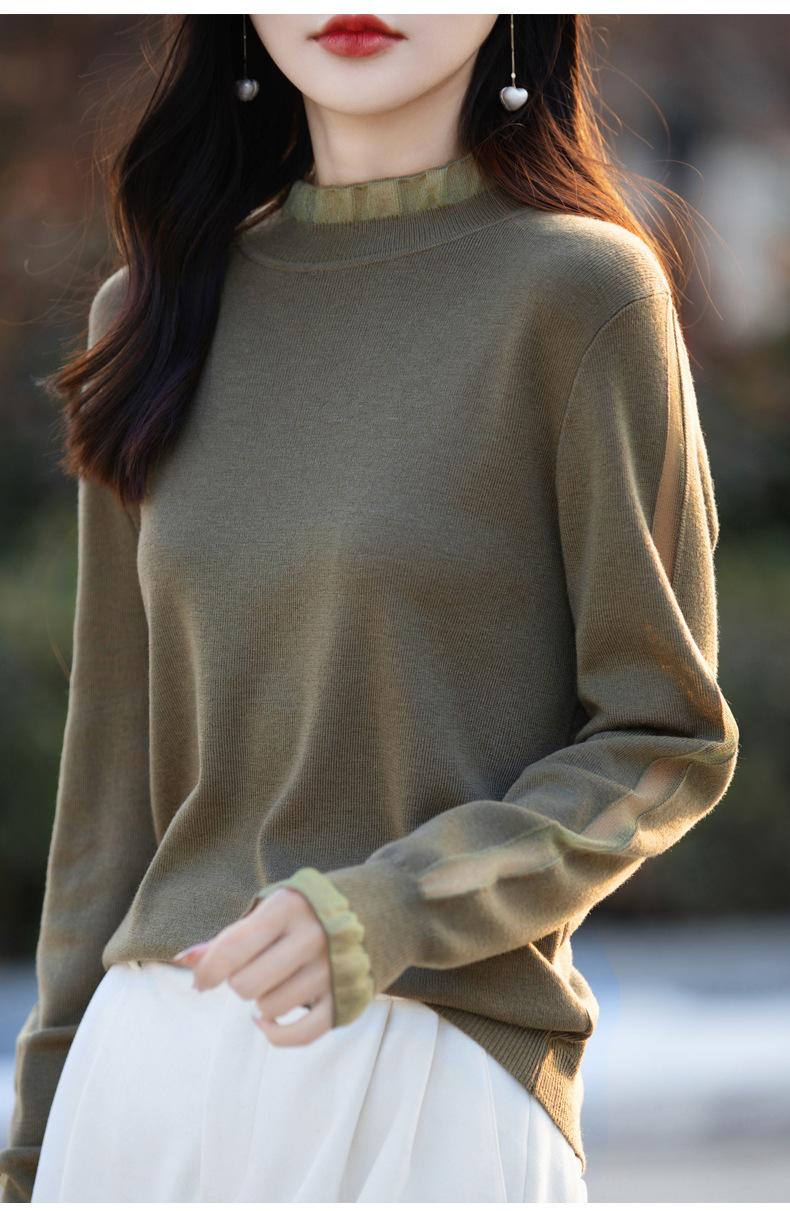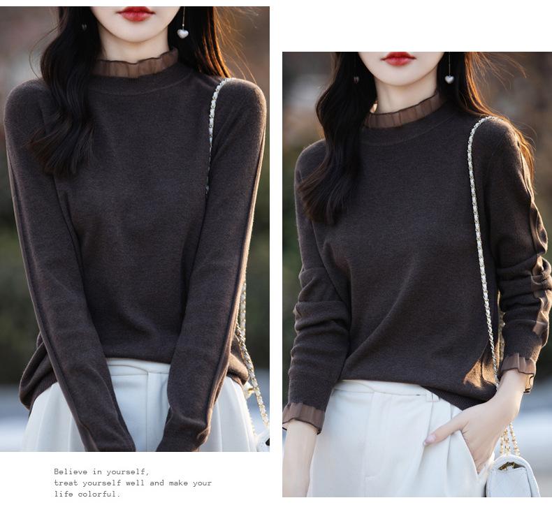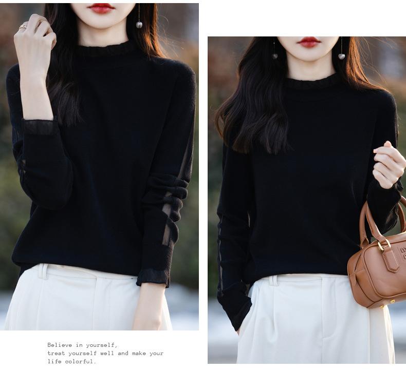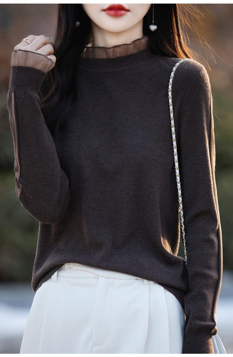 Suéter con cuello de oreja de madera redondo y costura de encaje para mujer, suéter retro holgado, suéter para mujer, primavera 2024