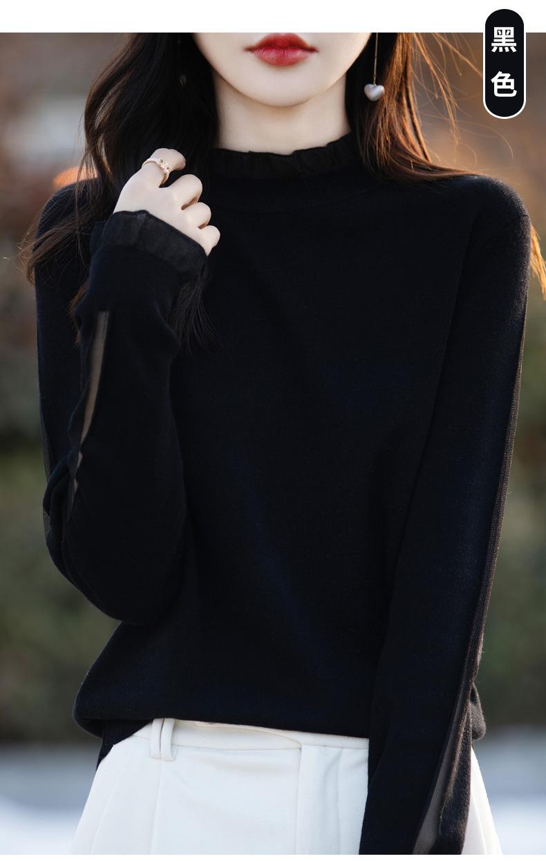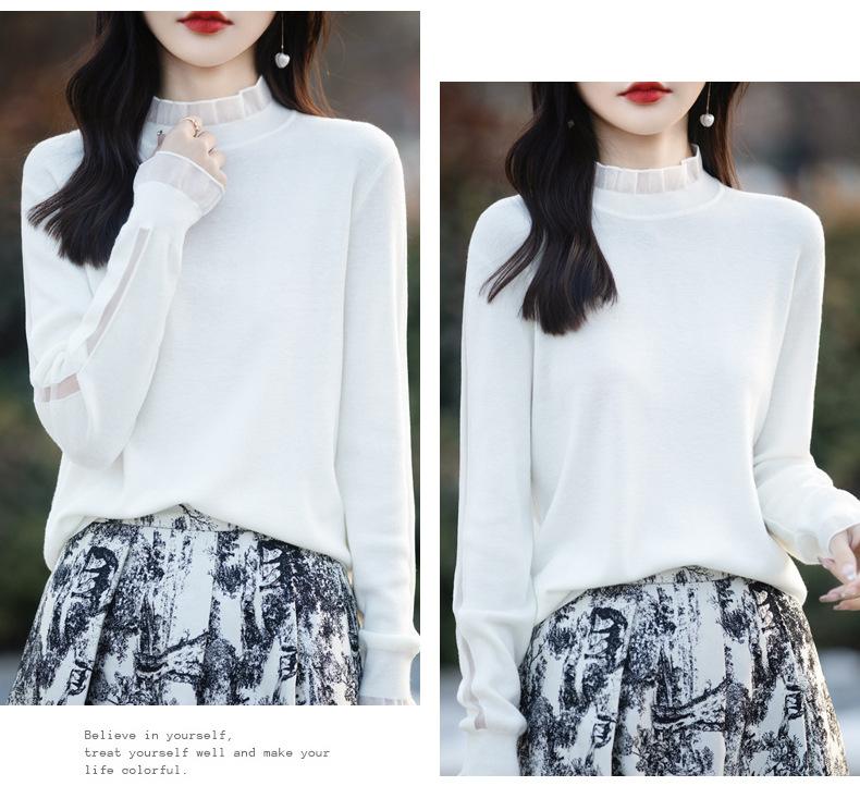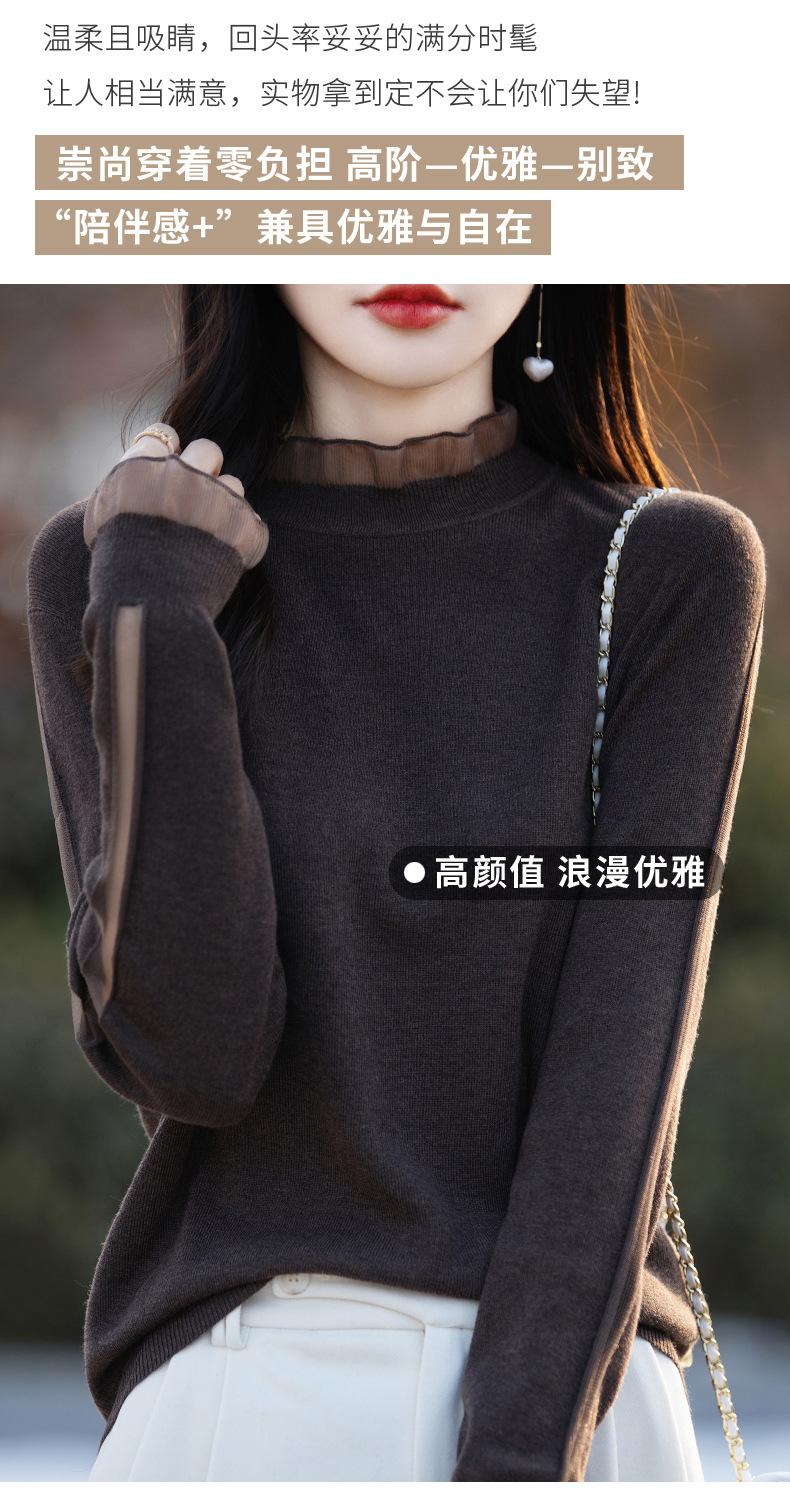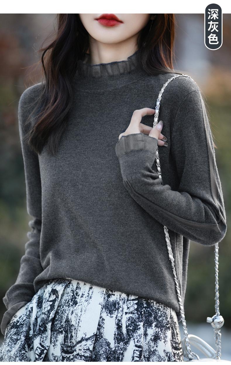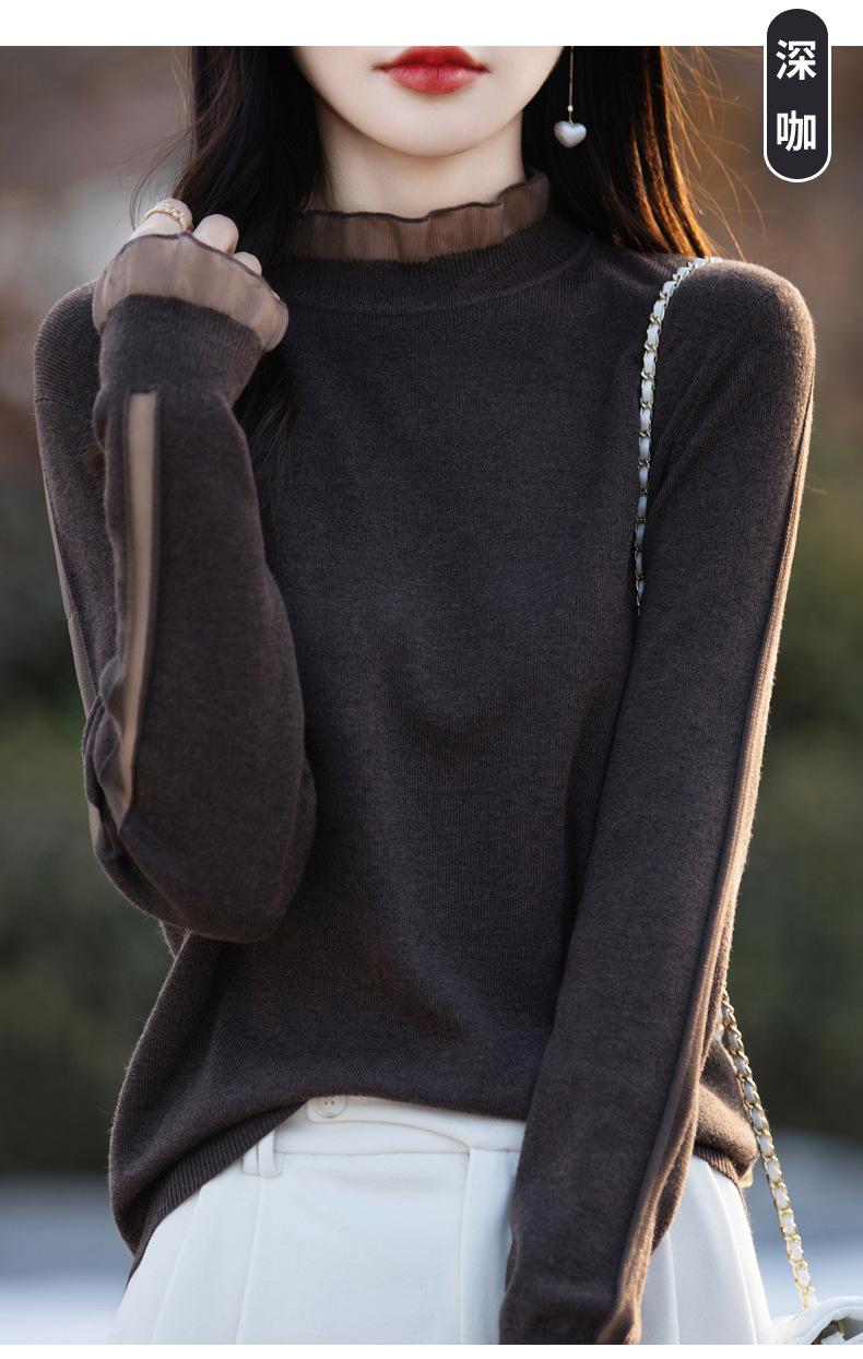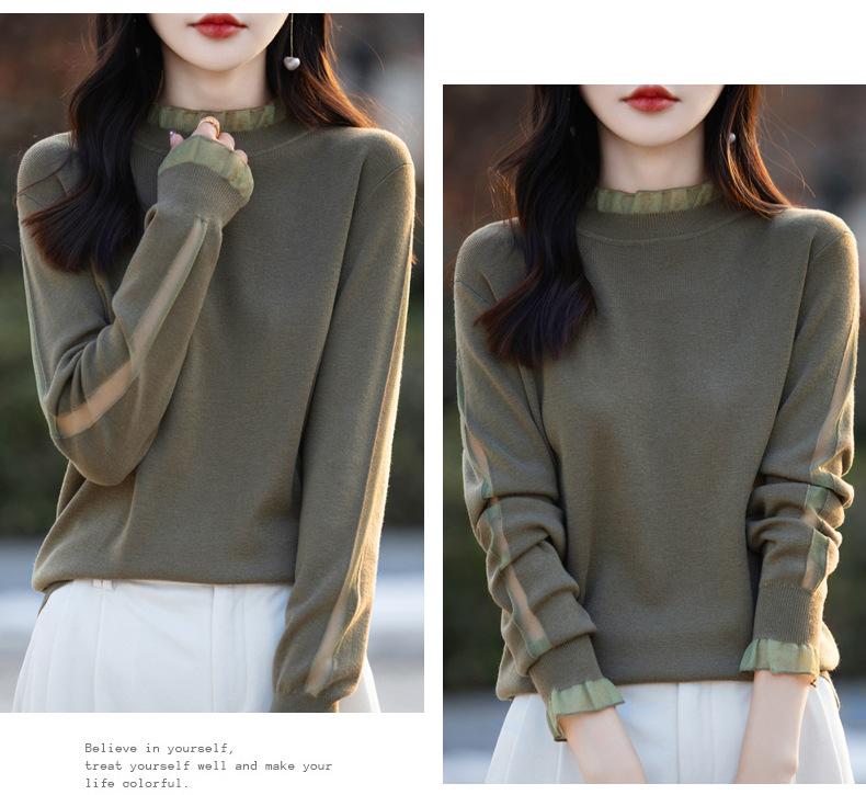 Suéter con cuello de oreja de madera redondo y costura de encaje para mujer, suéter retro holgado, suéter para mujer, primavera 2024