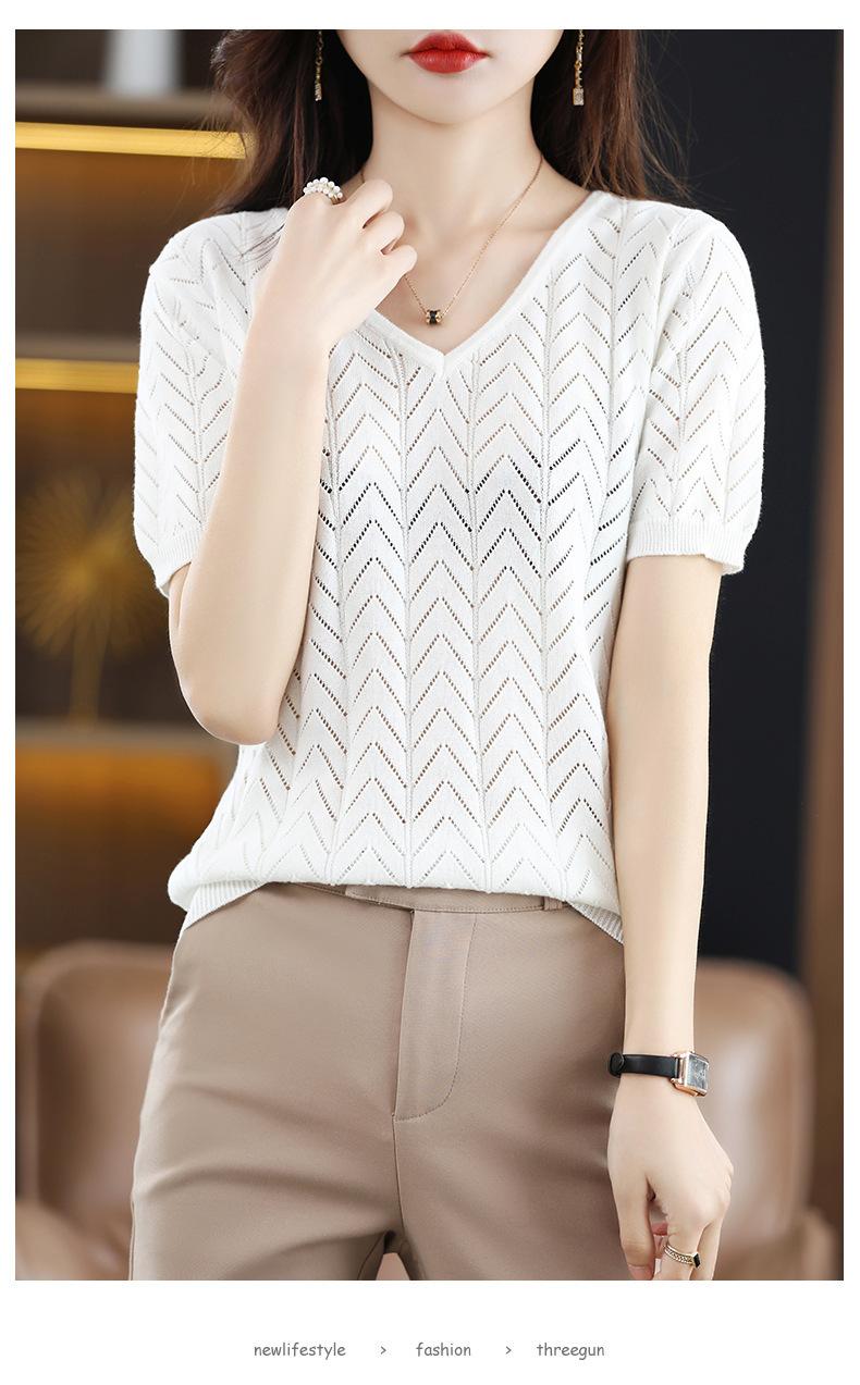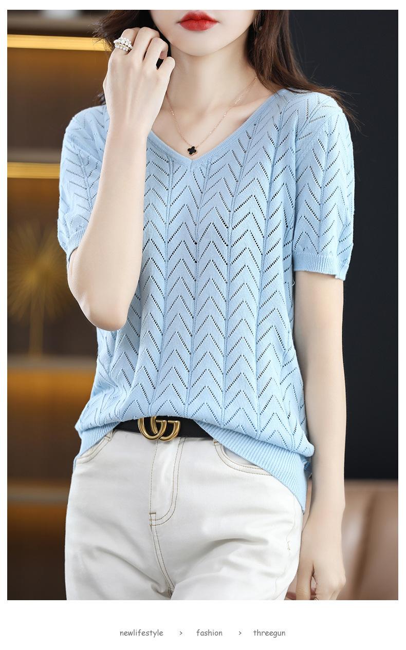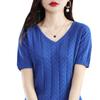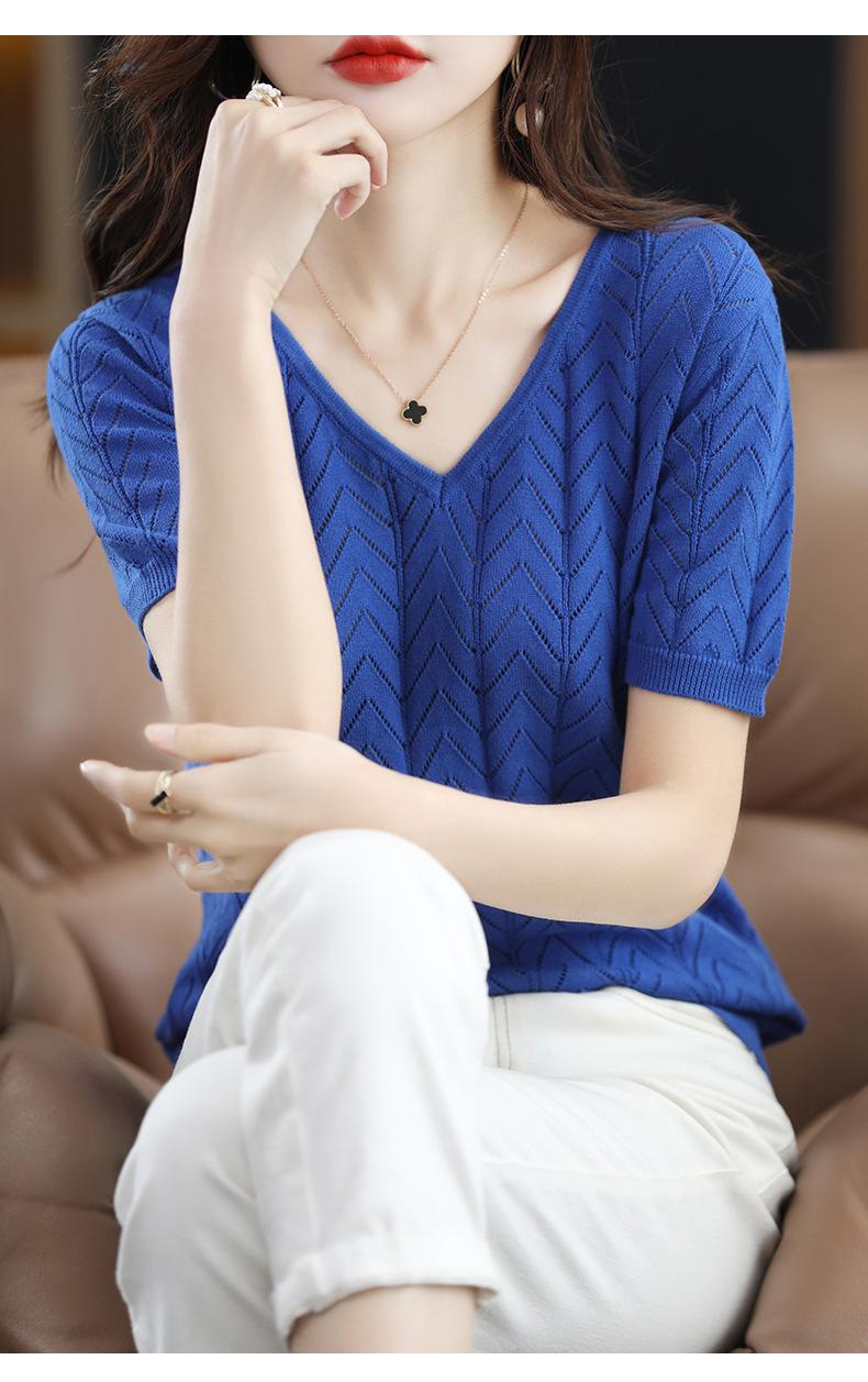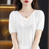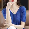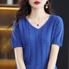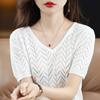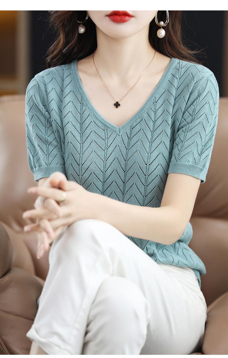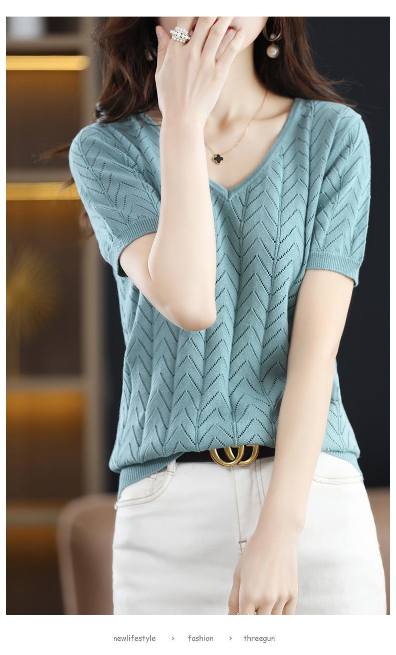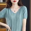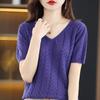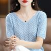 Suéter de manga corta para mujer, novedad de 2024, jersey holgado de color liso con cuello en V, camiseta de seda helada, top fino de verano para mujer