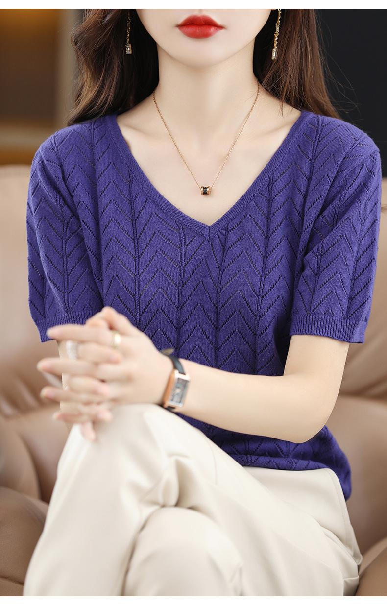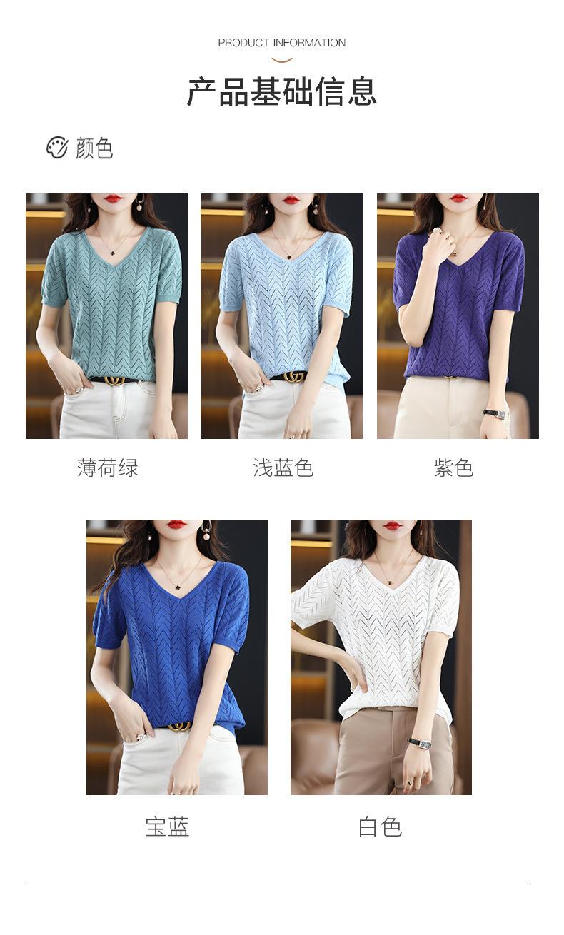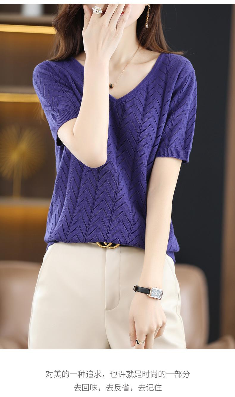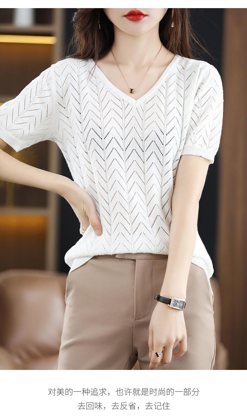Suéter de manga corta para mujer, novedad de 2024, jersey holgado de color liso con cuello en V, camiseta de seda helada, top fino de verano para mujer