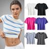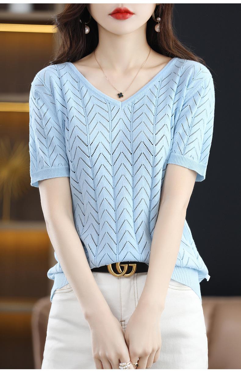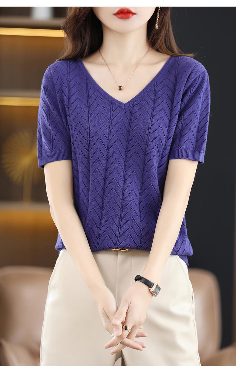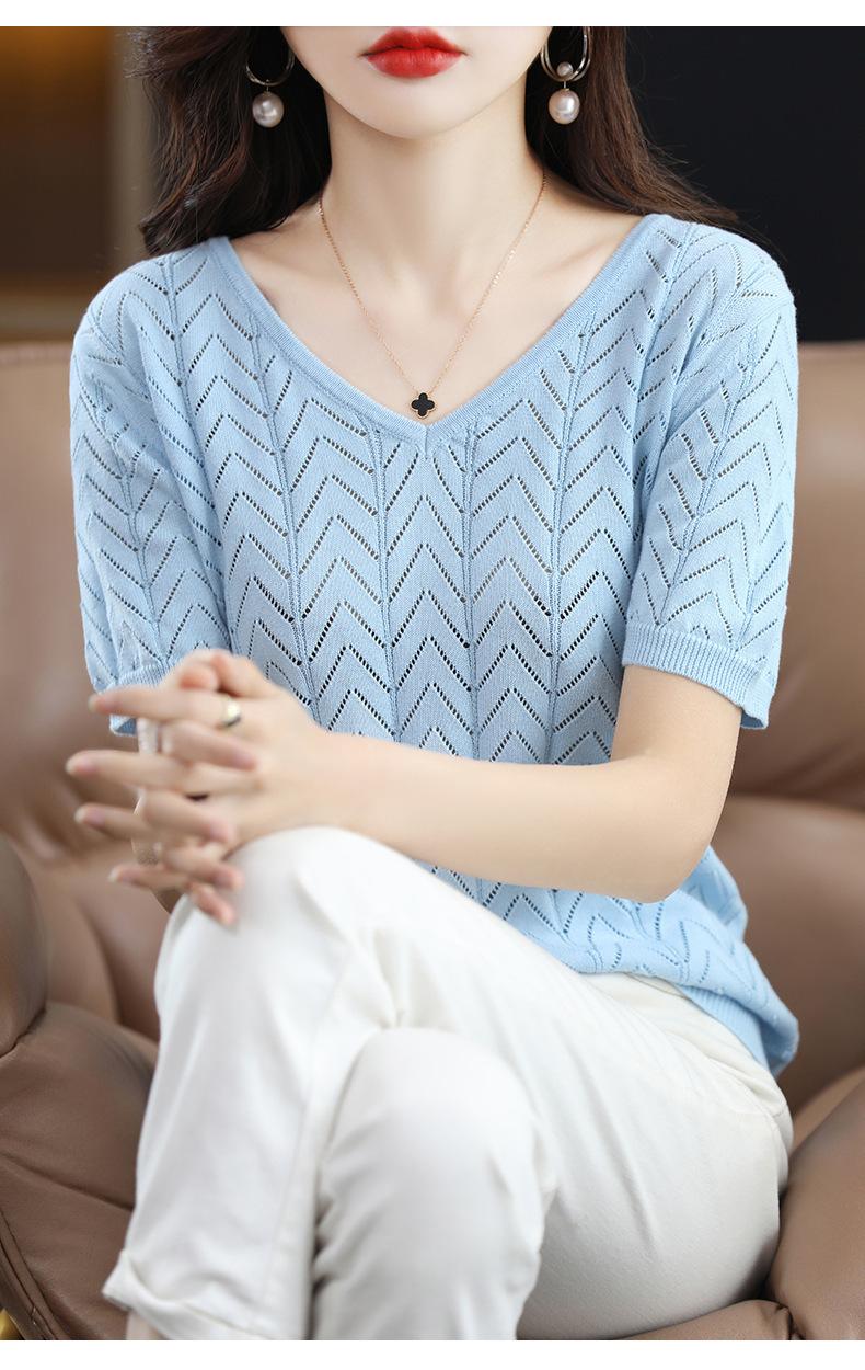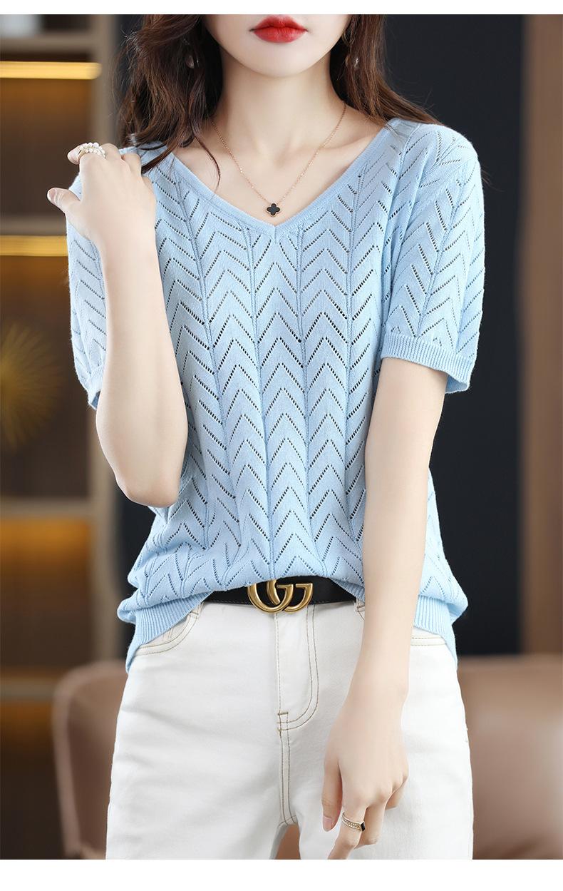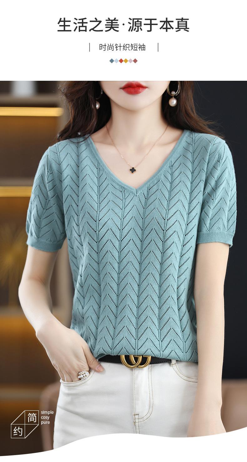 Suéter de manga corta para mujer, novedad de 2024, jersey holgado de color liso con cuello en V, camiseta de seda helada, top fino de verano para mujer