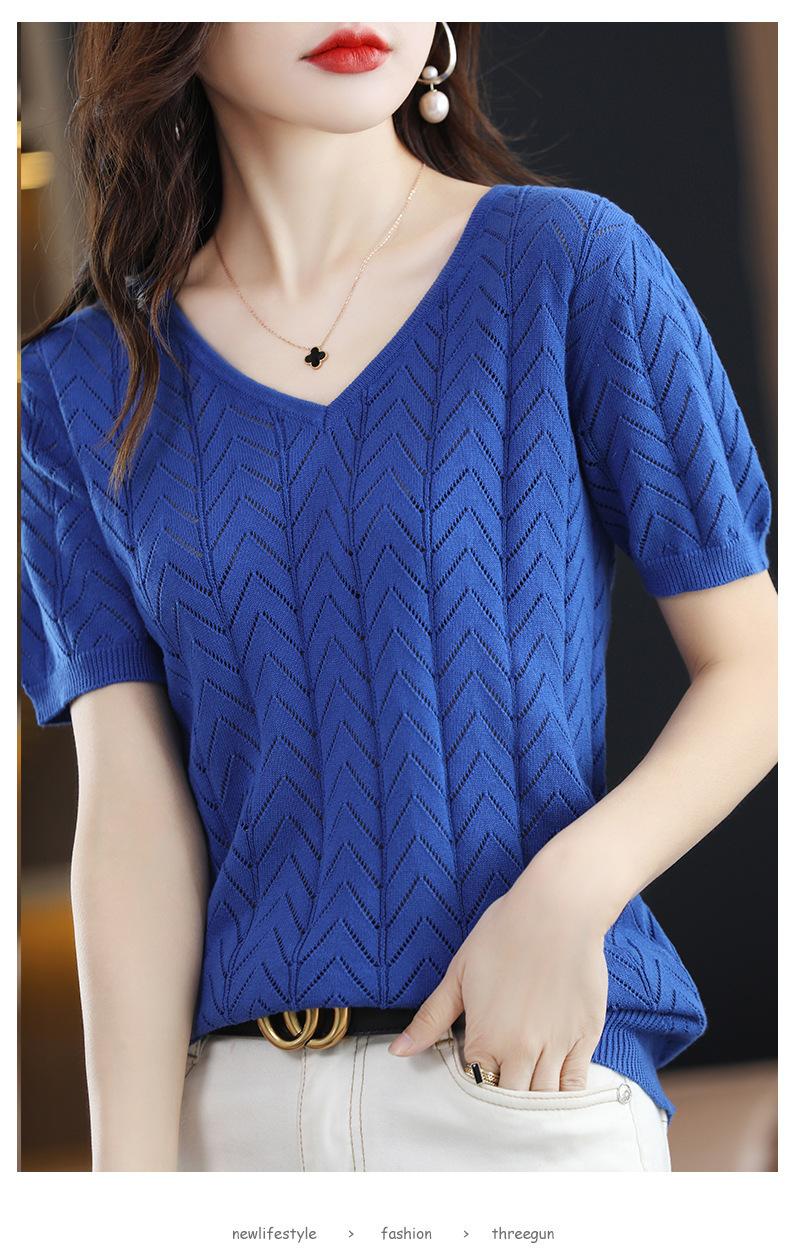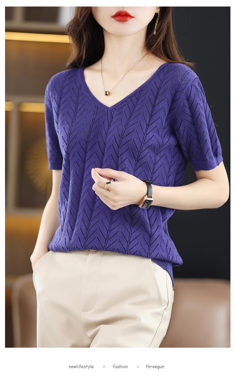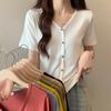 Suéter de manga corta para mujer, novedad de 2022, jersey holgado de color liso con cuello en V, camiseta de seda helada, tops finos para mujer, verano