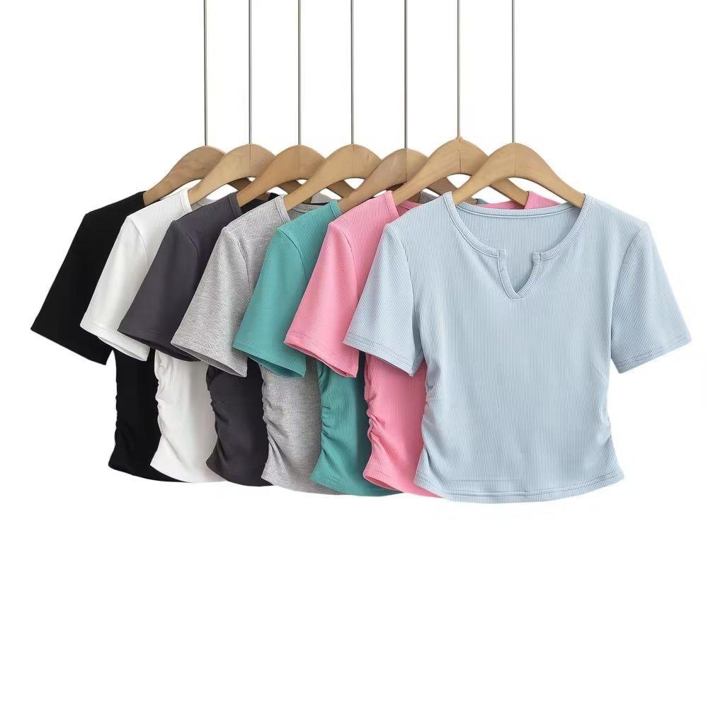 Camiseta de manga corta plisada de doble cara con cuello en V pequeño de estilo europeo y americano para mujer, nueva camiseta de verano sexy y ajustada para chica.