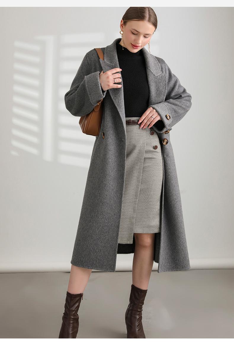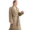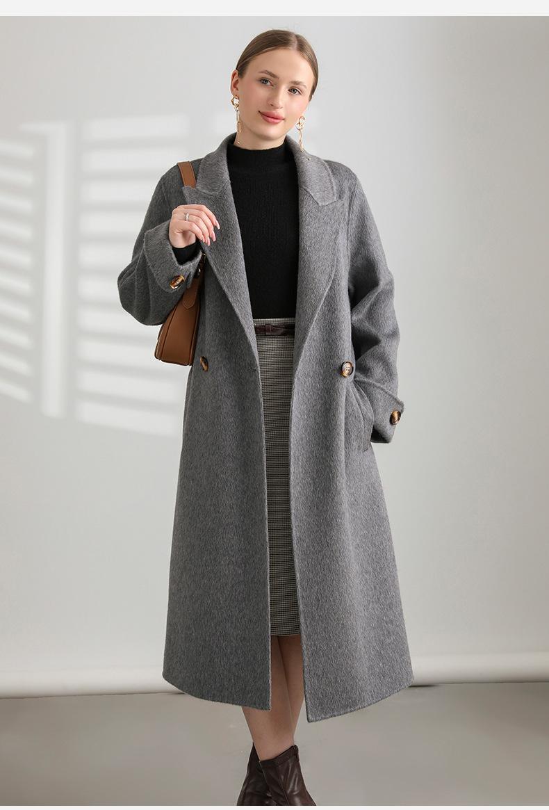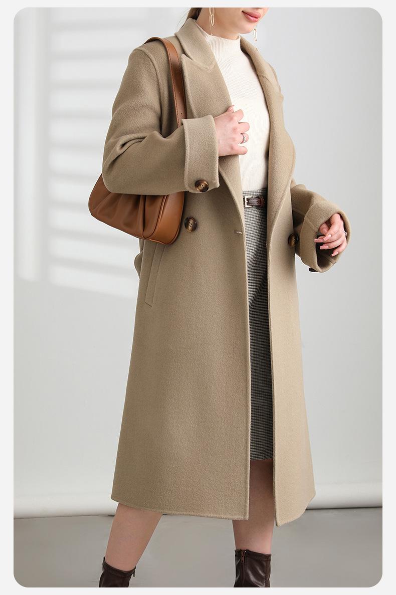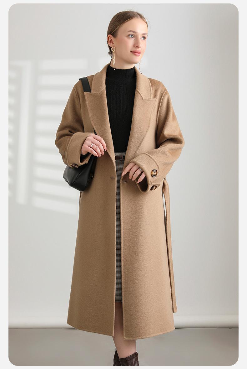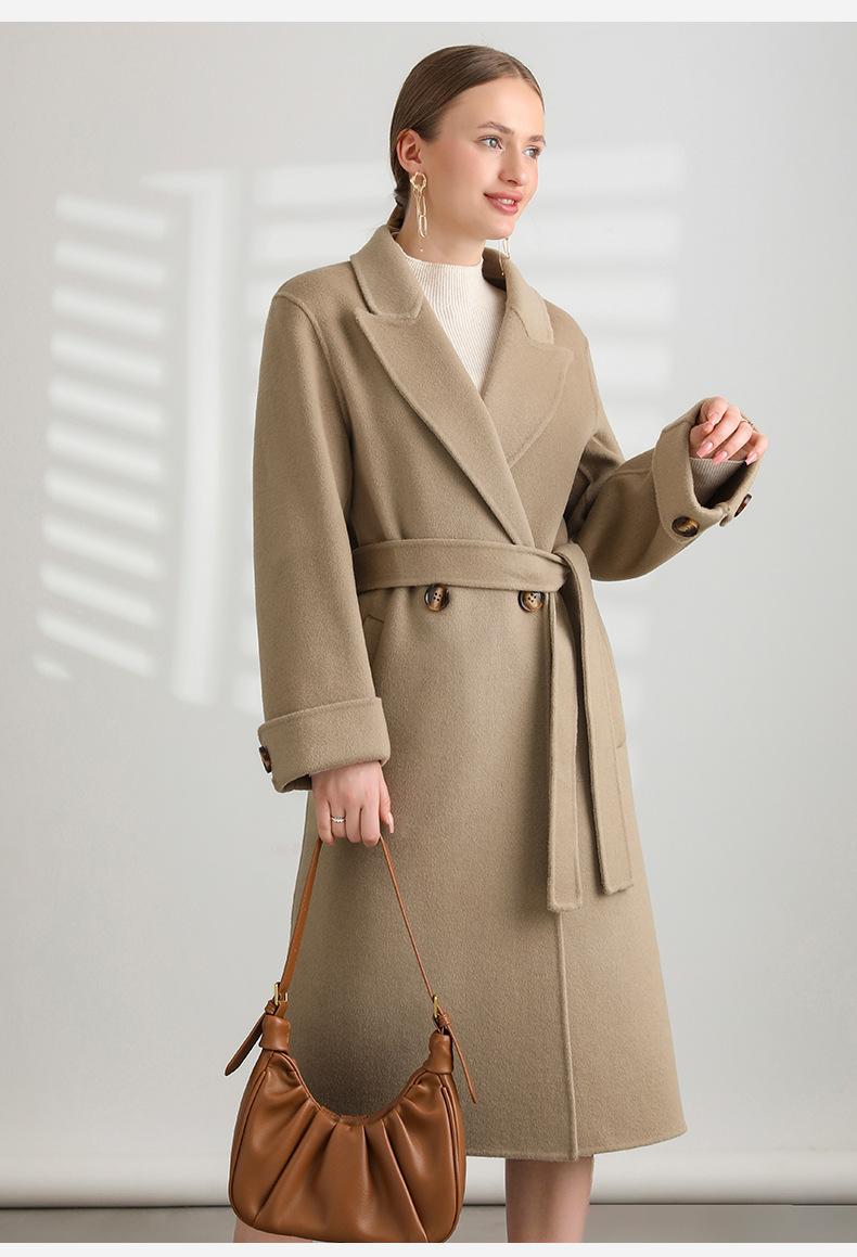 Abrigo de Lana de Doble Vista para Mujer con Cuello de Traje 100% Lana Pura Holgado con Cordones 24 Largo Estilo Commuter Abrigo por Encima de la Rodilla