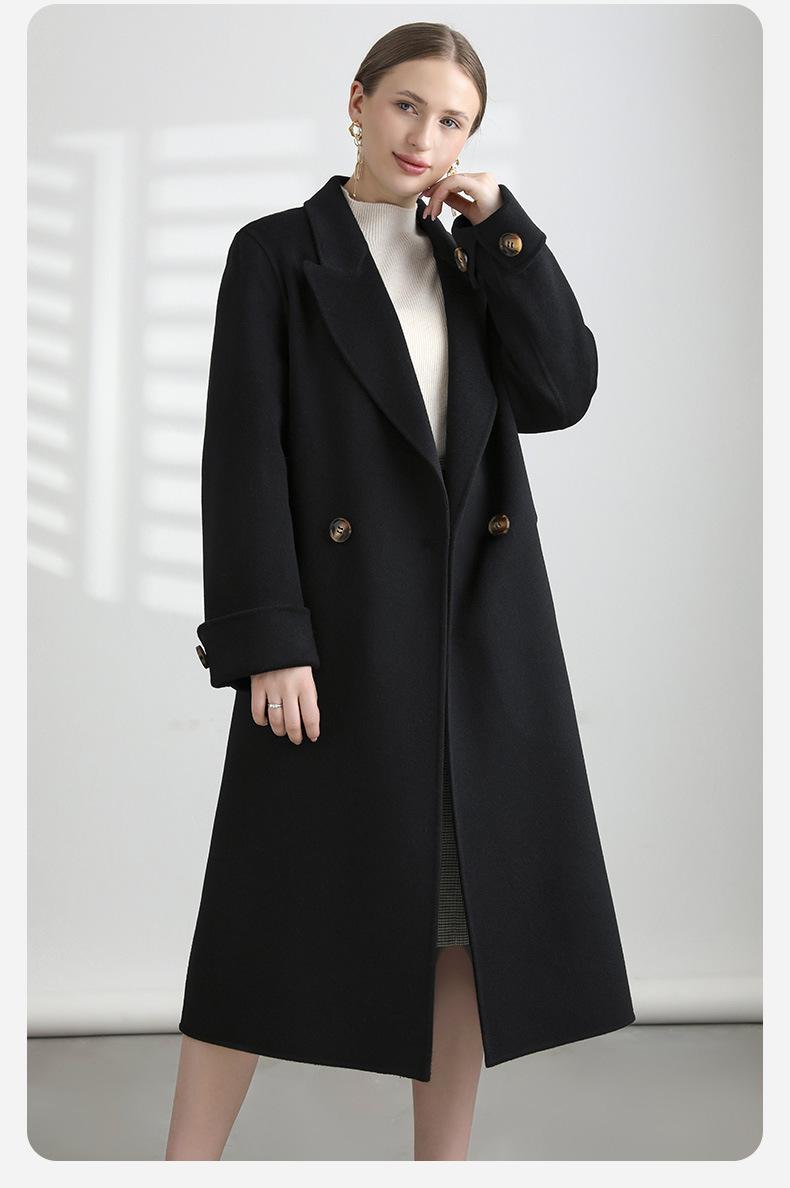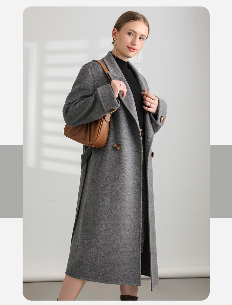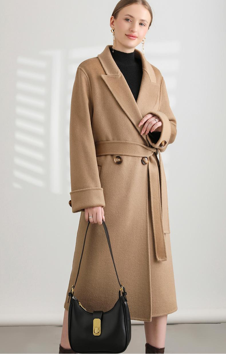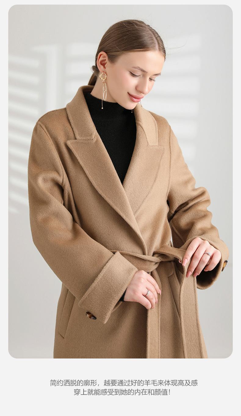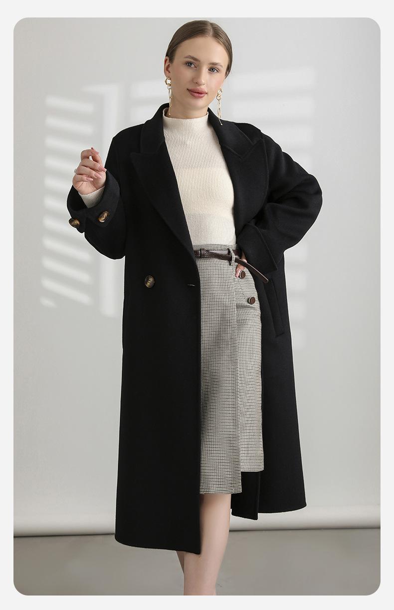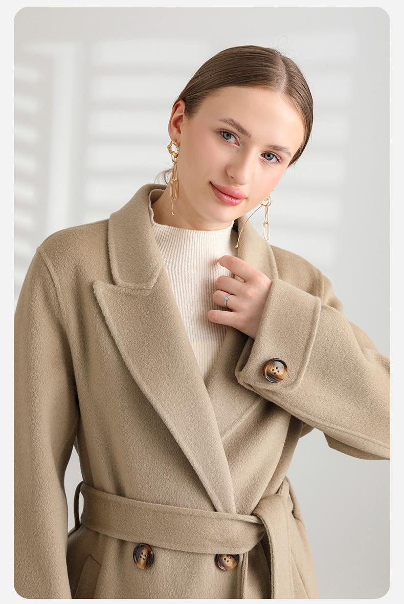 Abrigo de Lana de Doble Vista para Mujer con Cuello de Traje 100% Lana Pura Holgado con Cordones 24 Largo Estilo Commuter Abrigo por Encima de la Rodilla