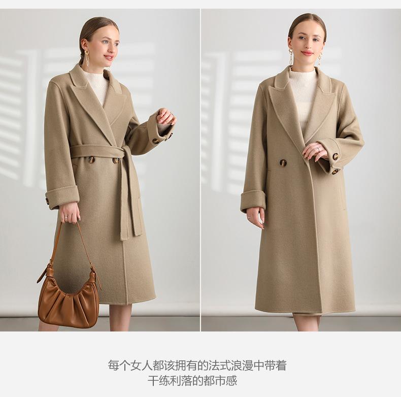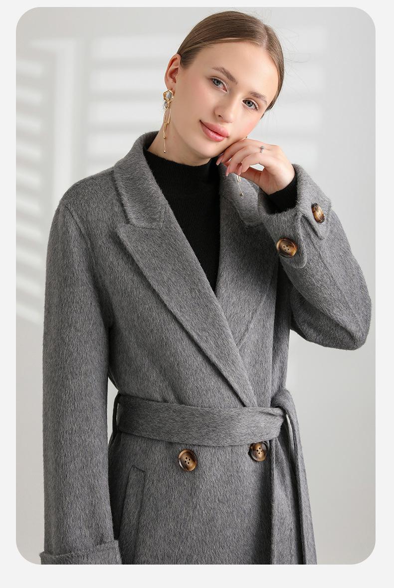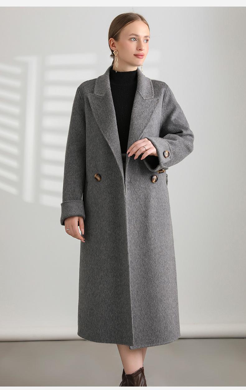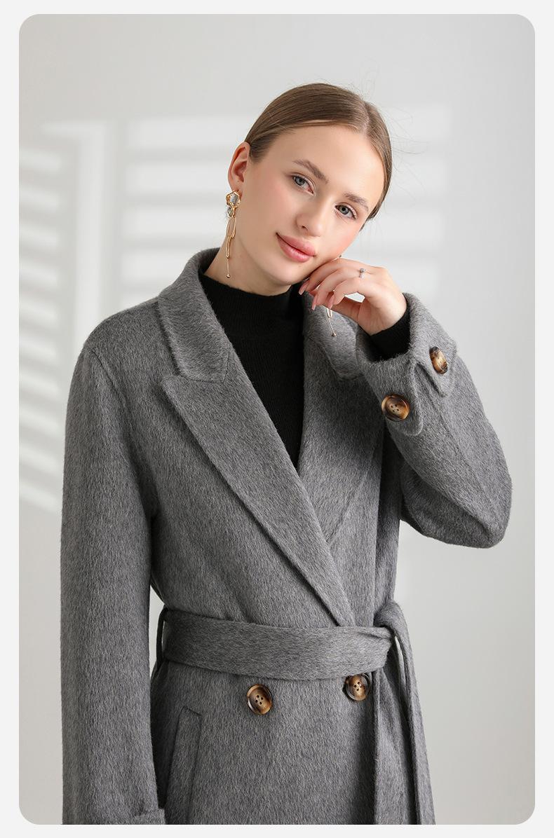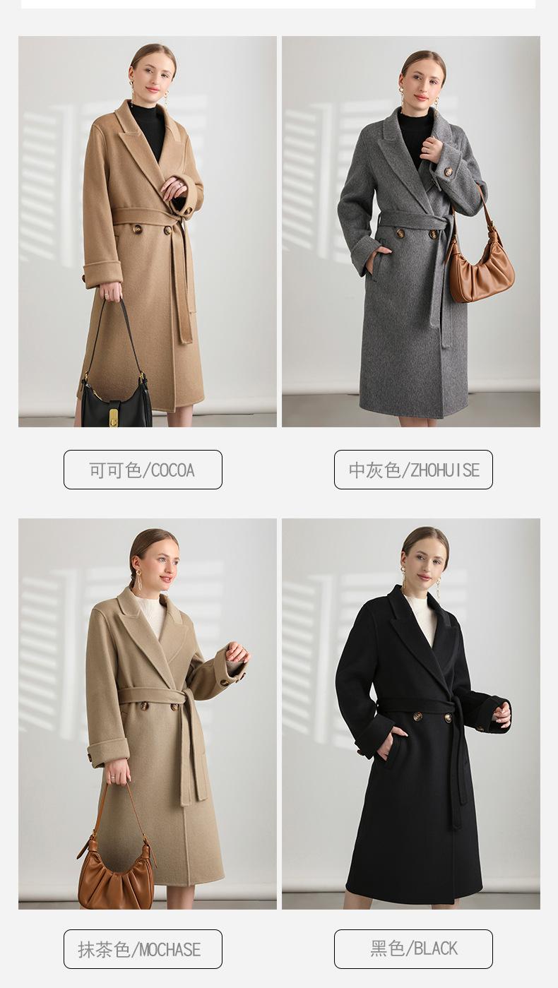 Abrigo de Lana de Doble Vista para Mujer con Cuello de Traje 100% Lana Pura Holgado con Cordones 24 Largo Estilo Commuter Abrigo por Encima de la Rodilla
