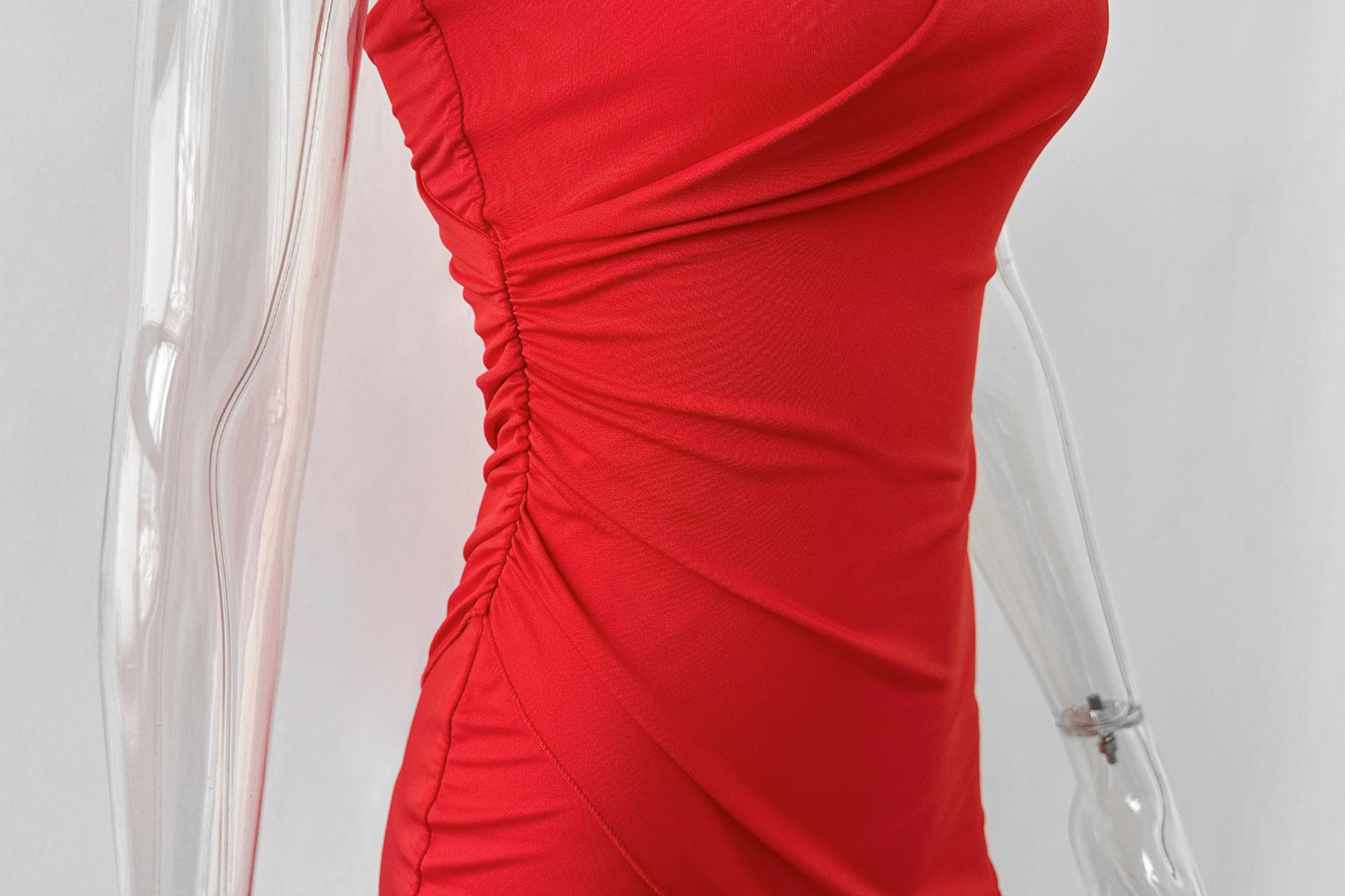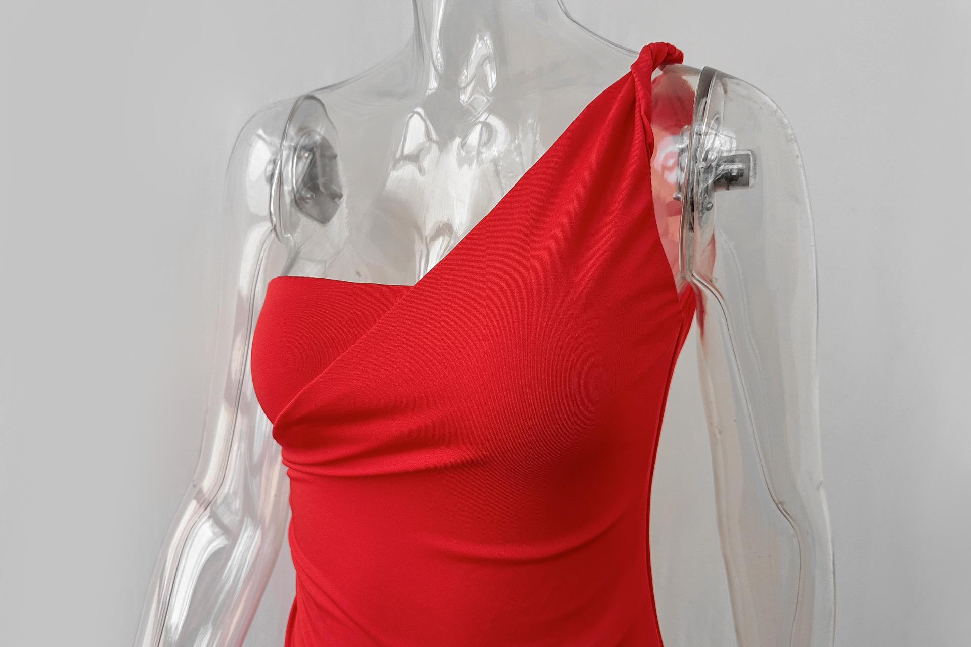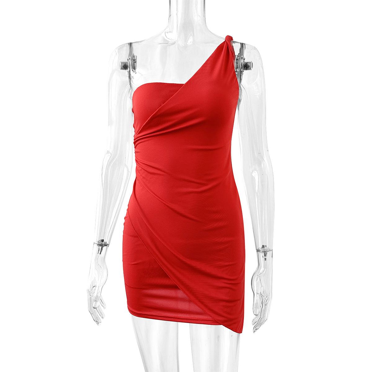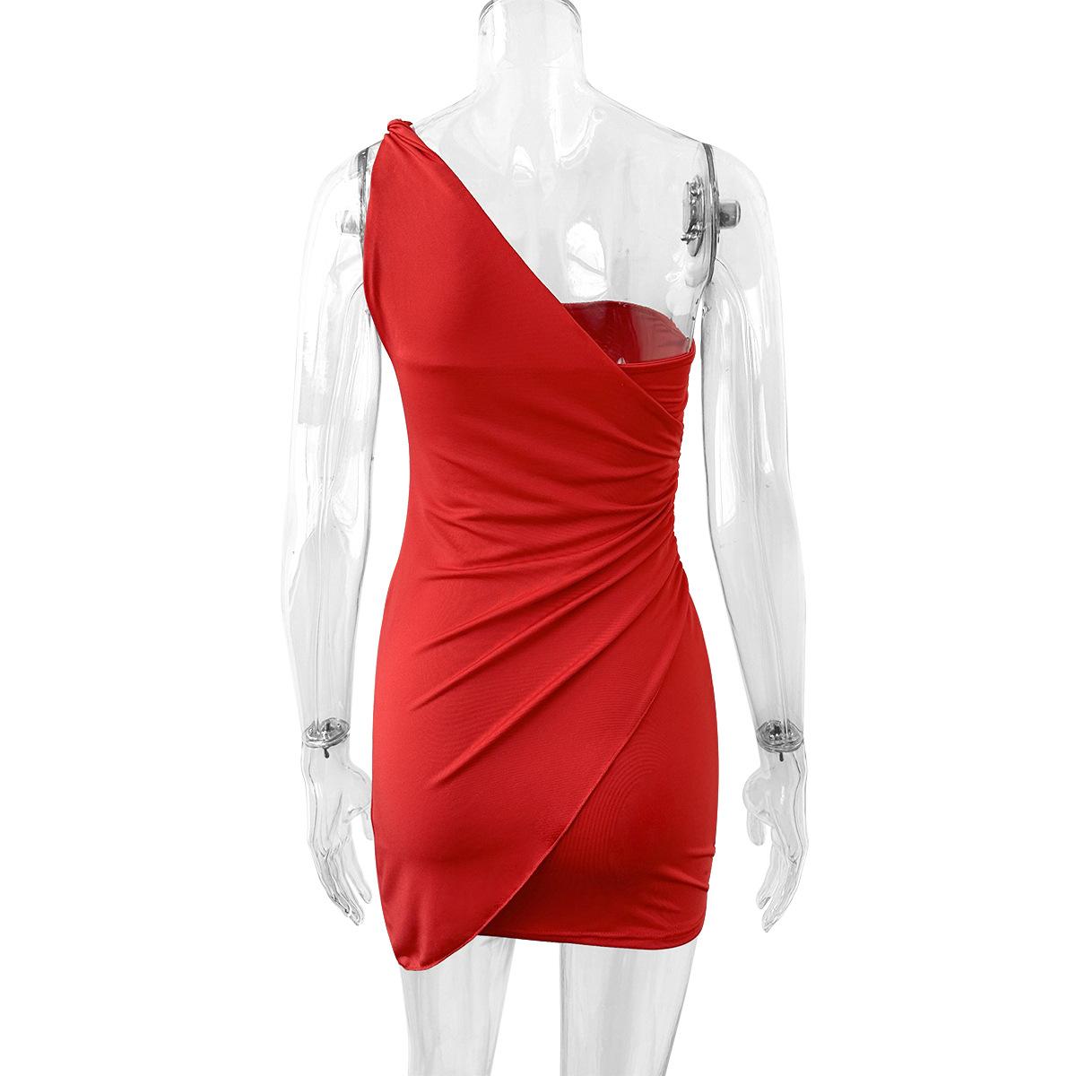 Este estilo utiliza tela de seda de leche de doble capa, envoltura de cadera de un solo hombro, diseño plisado lateral, sexy y de moda;