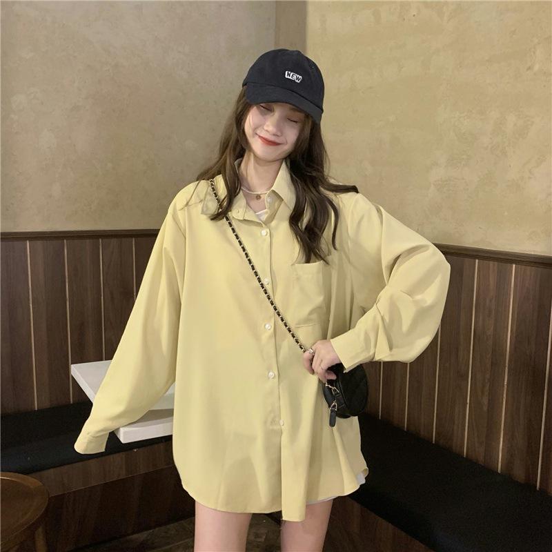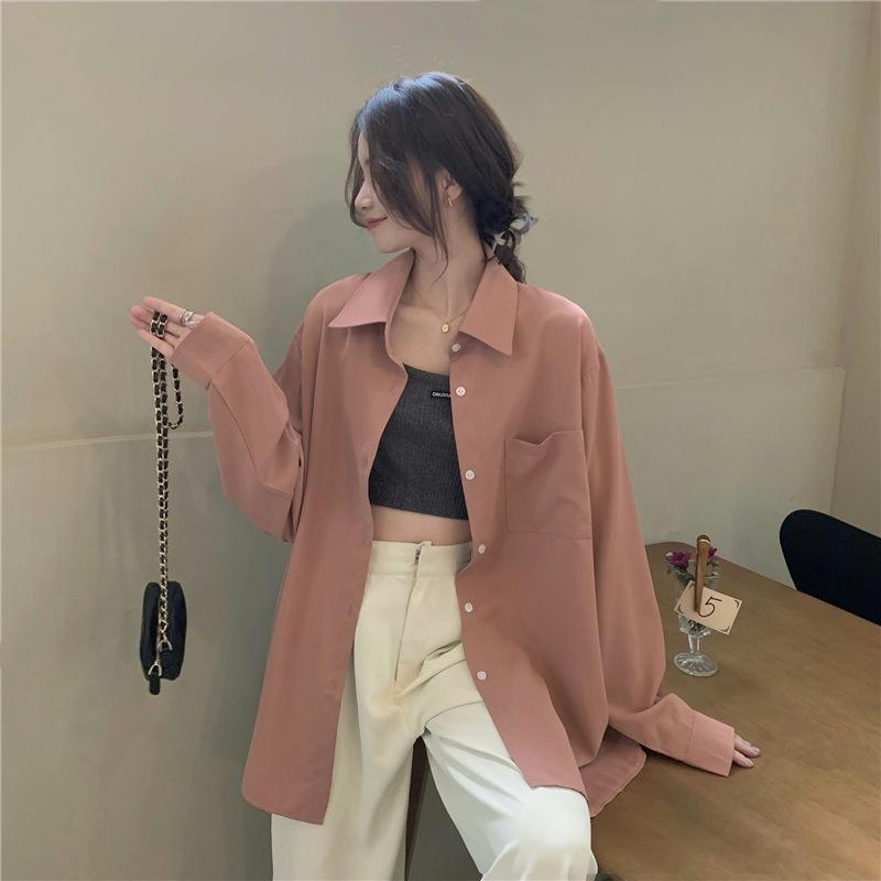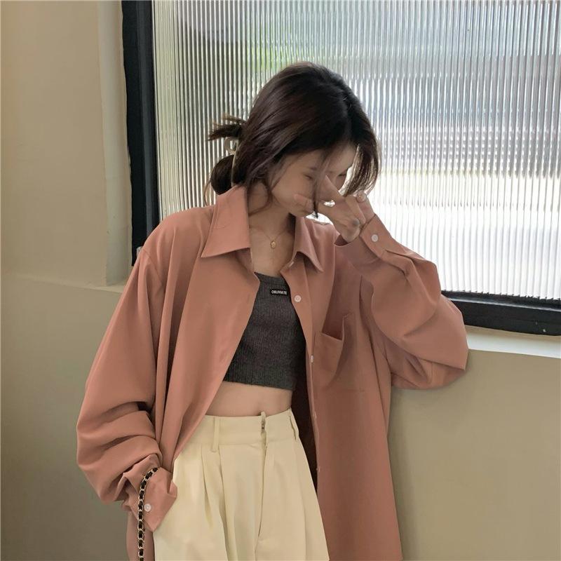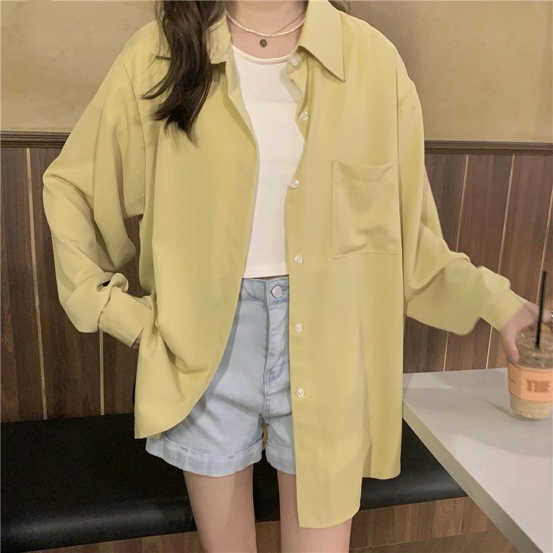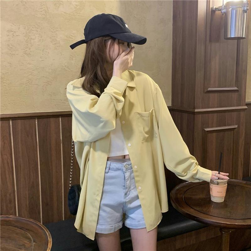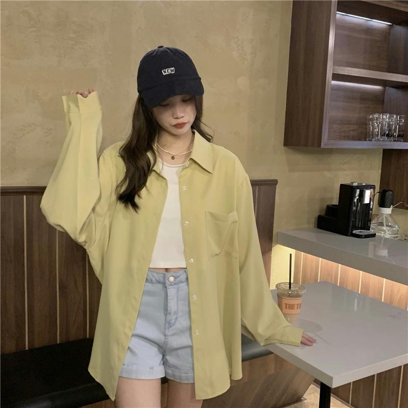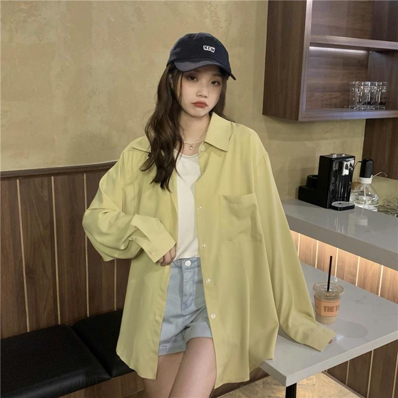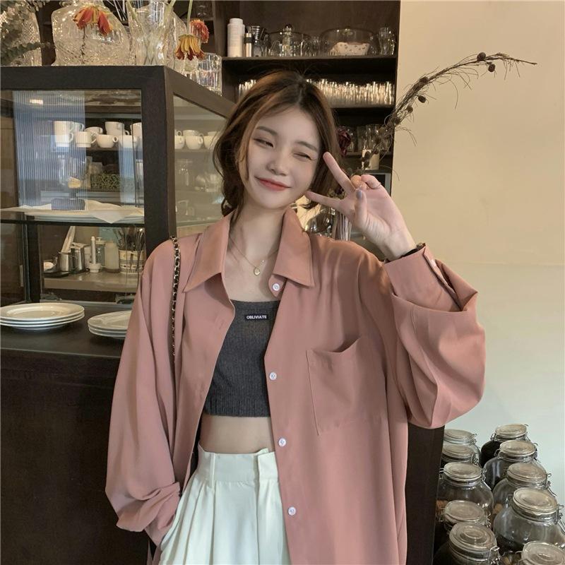 Foto Real de Otoño Casual Holgado Color Puro Versión Bf Básico Fácil de Usar Camisa Versátil de Manga Larga Camisa Protección Solar 39003