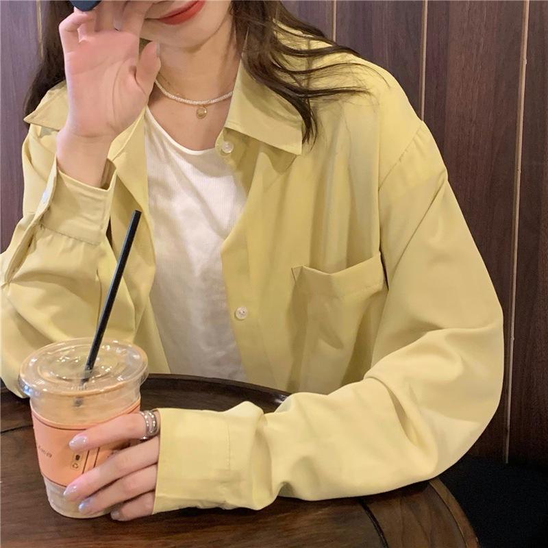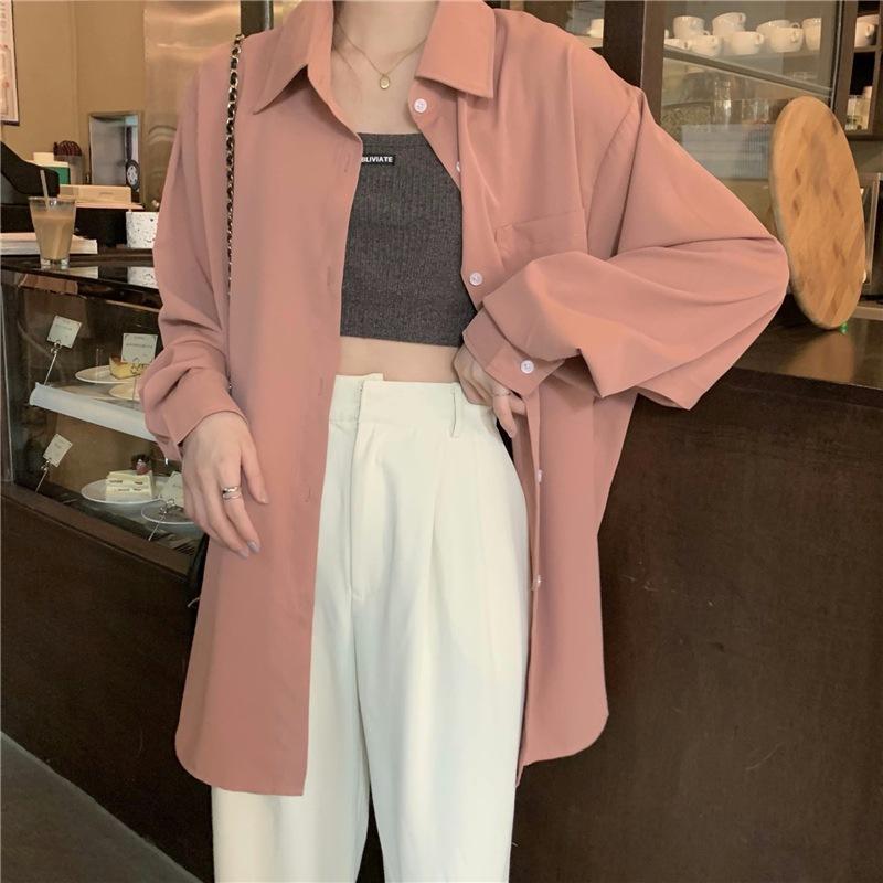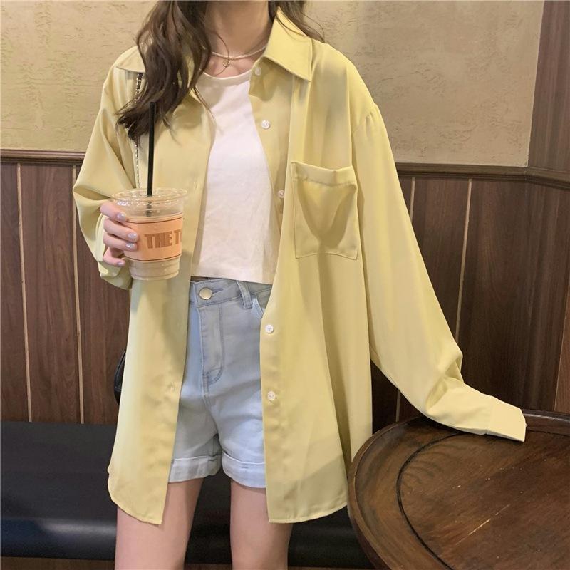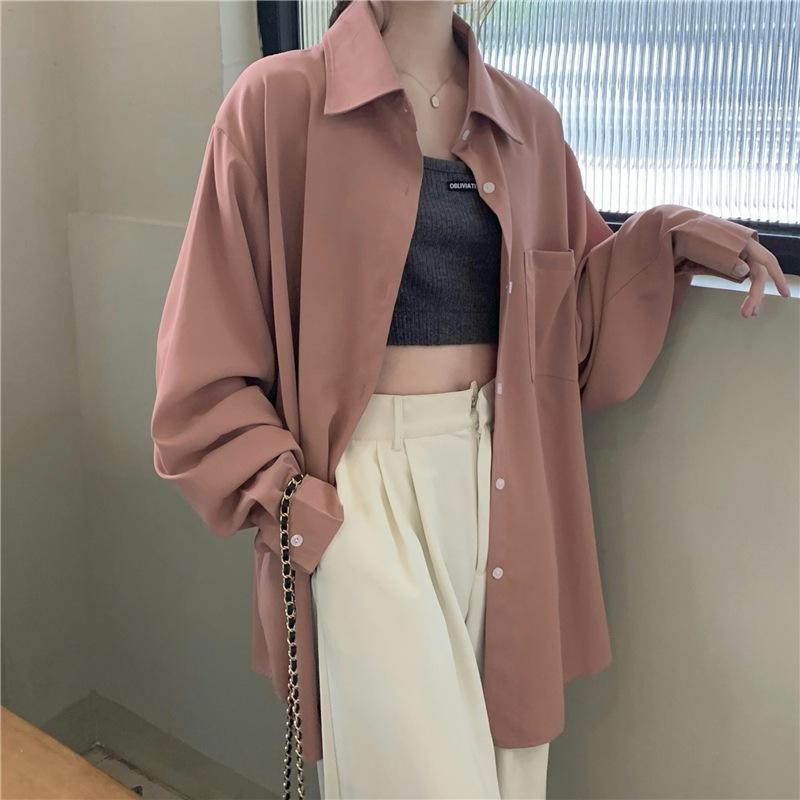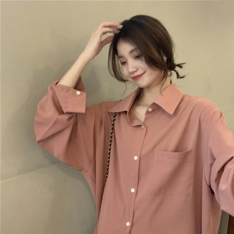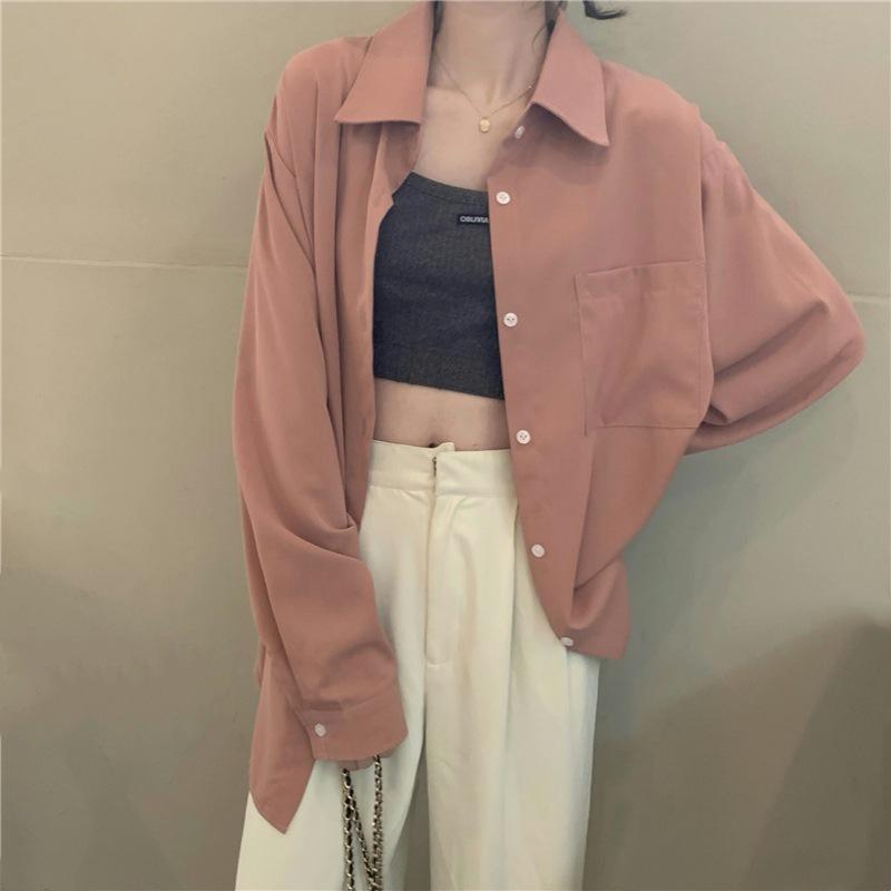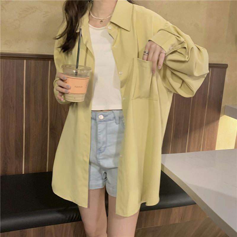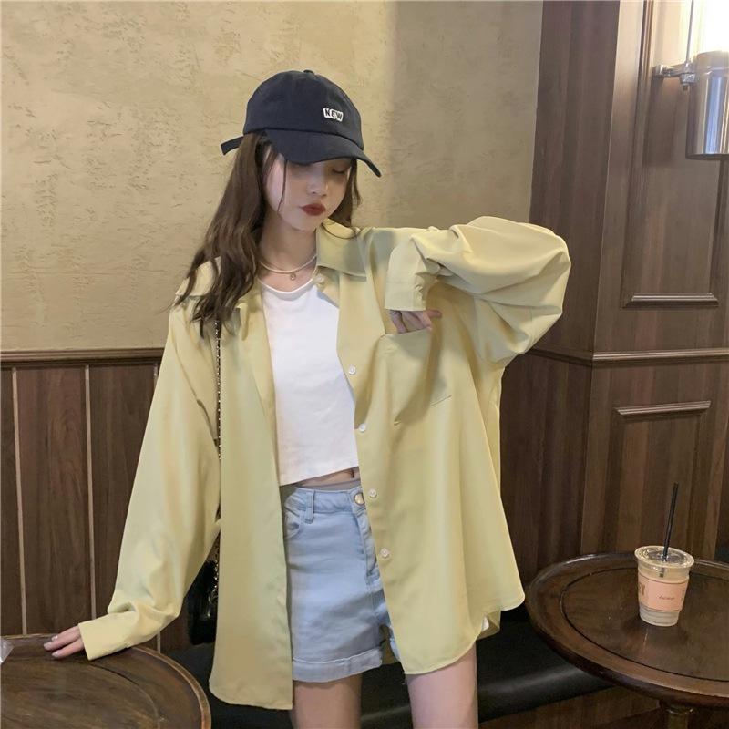 Foto Real de Otoño Casual Holgado Color Puro Versión Bf Básico Fácil de Usar Camisa Versátil de Manga Larga Camisa Protección Solar 39003