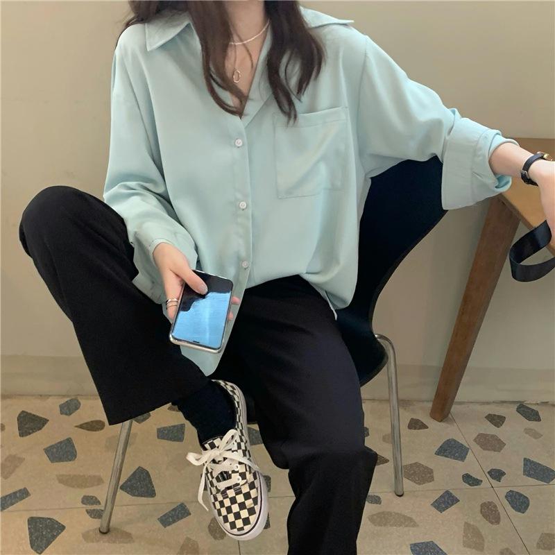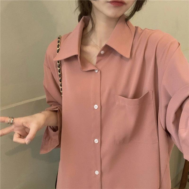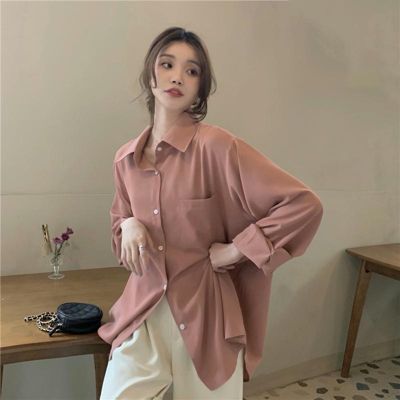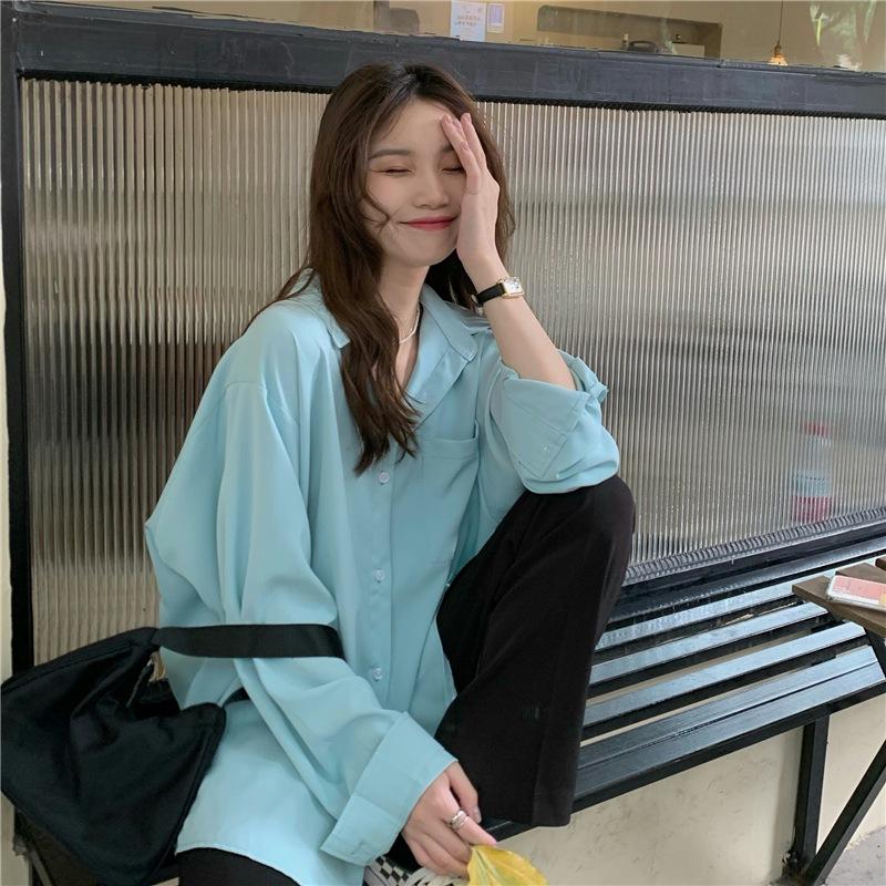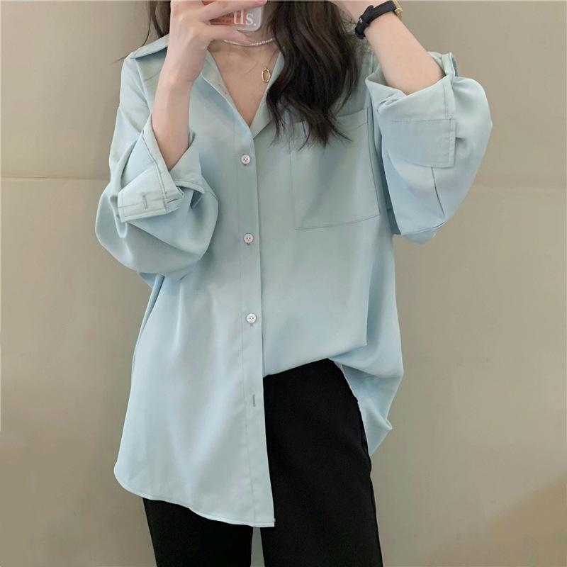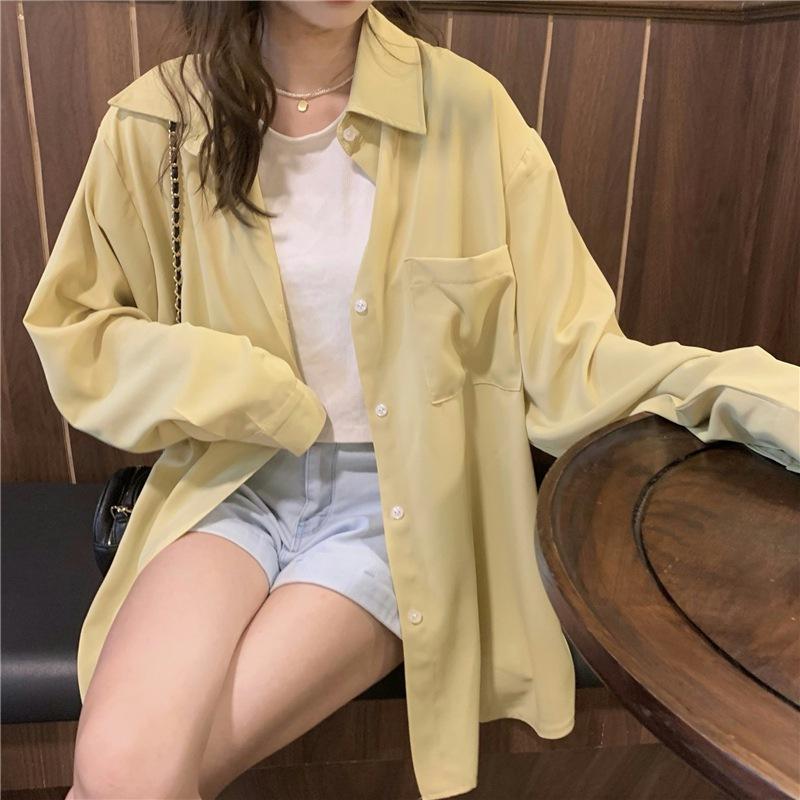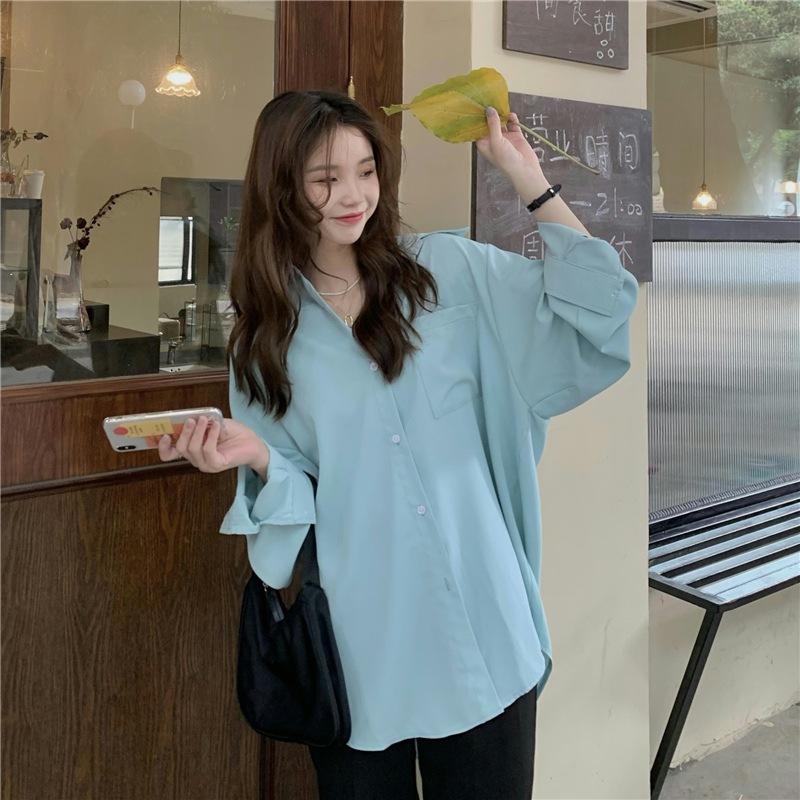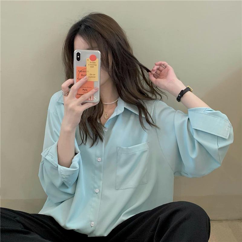 Foto Real de Otoño Casual Holgado Color Puro Versión Bf Básico Fácil de Usar Camisa Versátil de Manga Larga Camisa Protección Solar 39003