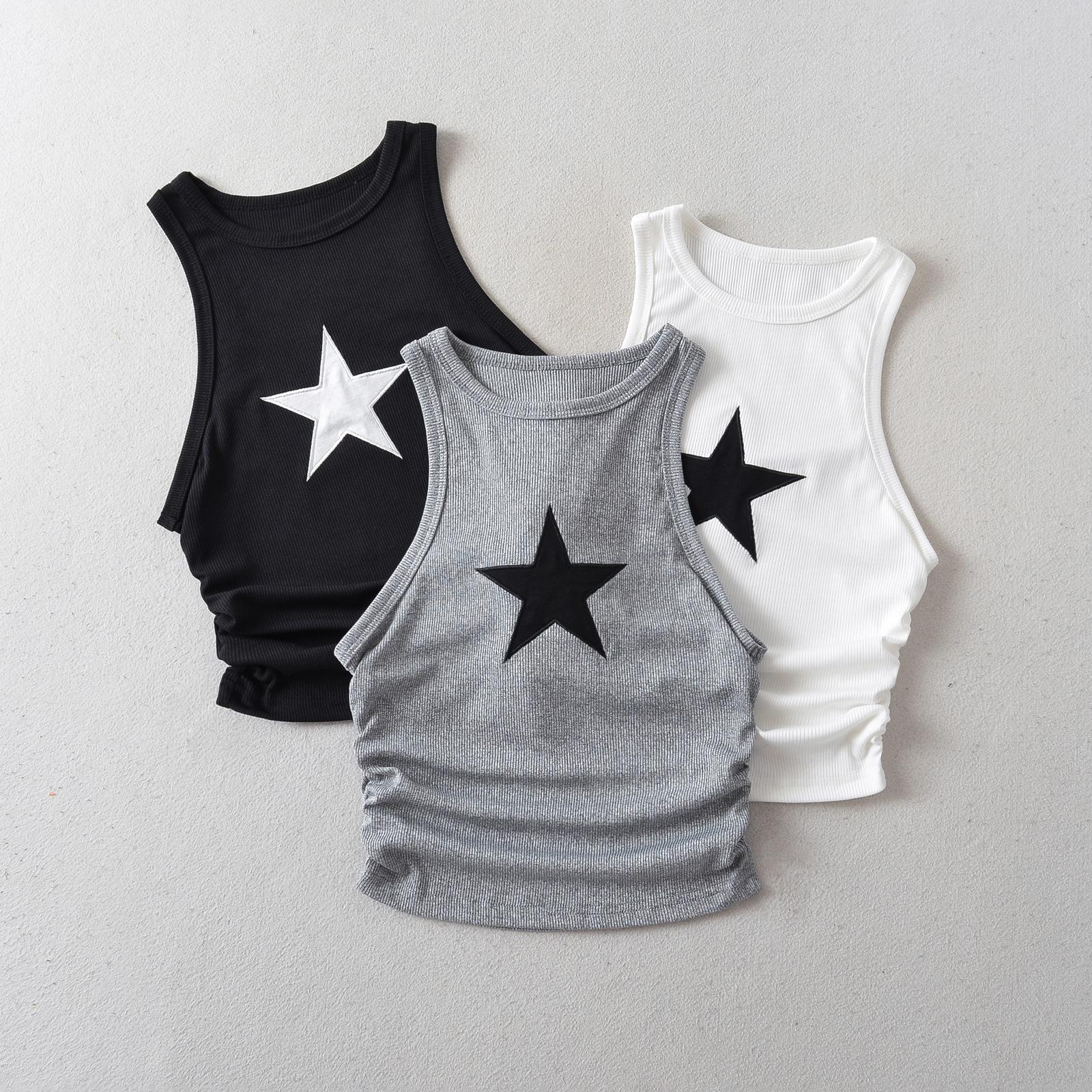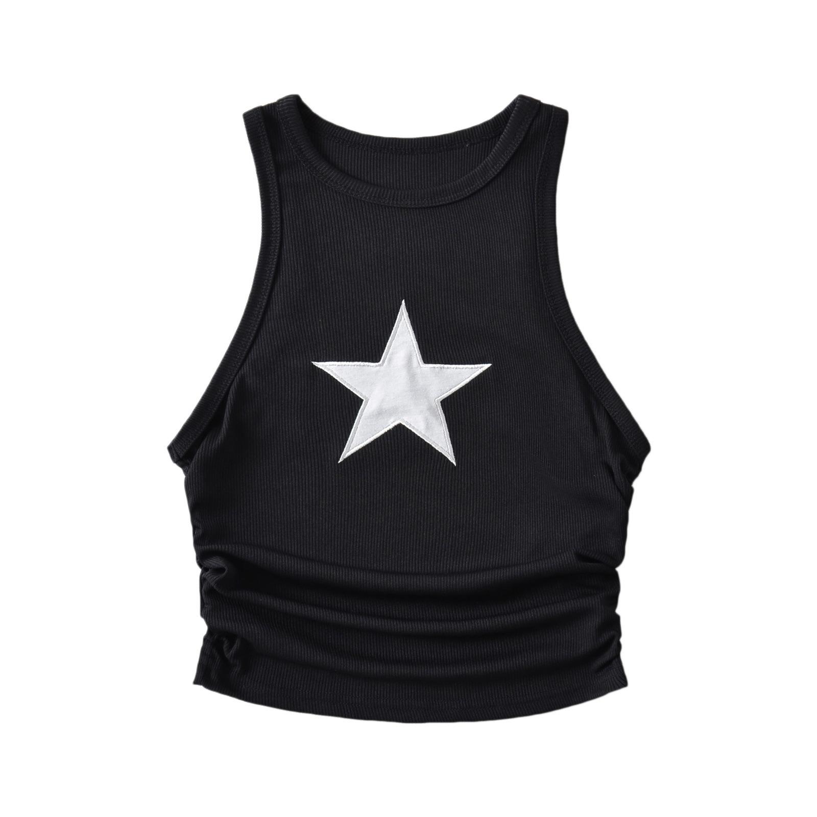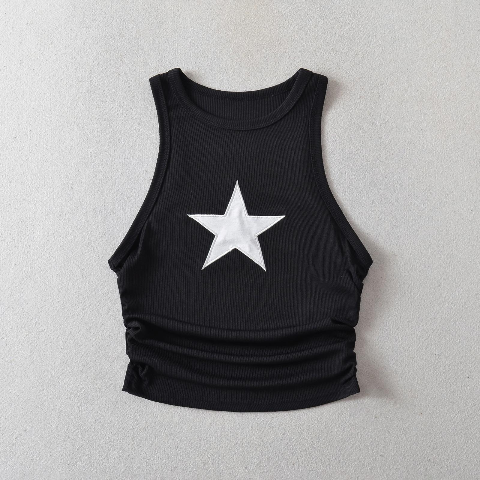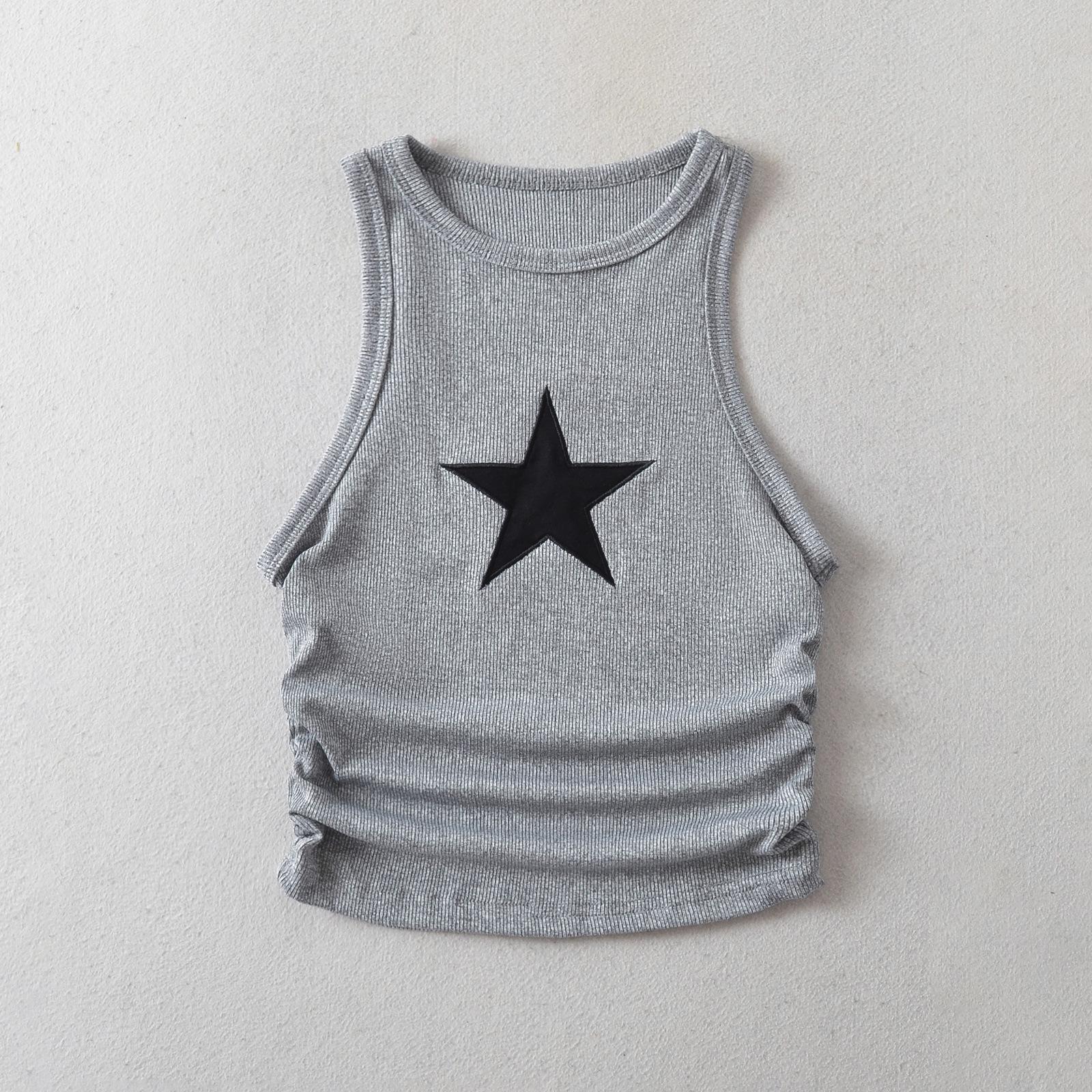 Chaleco plisado ajustado de cuello redondo para mujer, venta al por mayor, novedad de verano 2024, top corto sin mangas con parche de estrella de cinco puntas para chica sexy