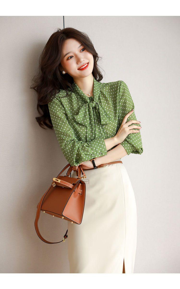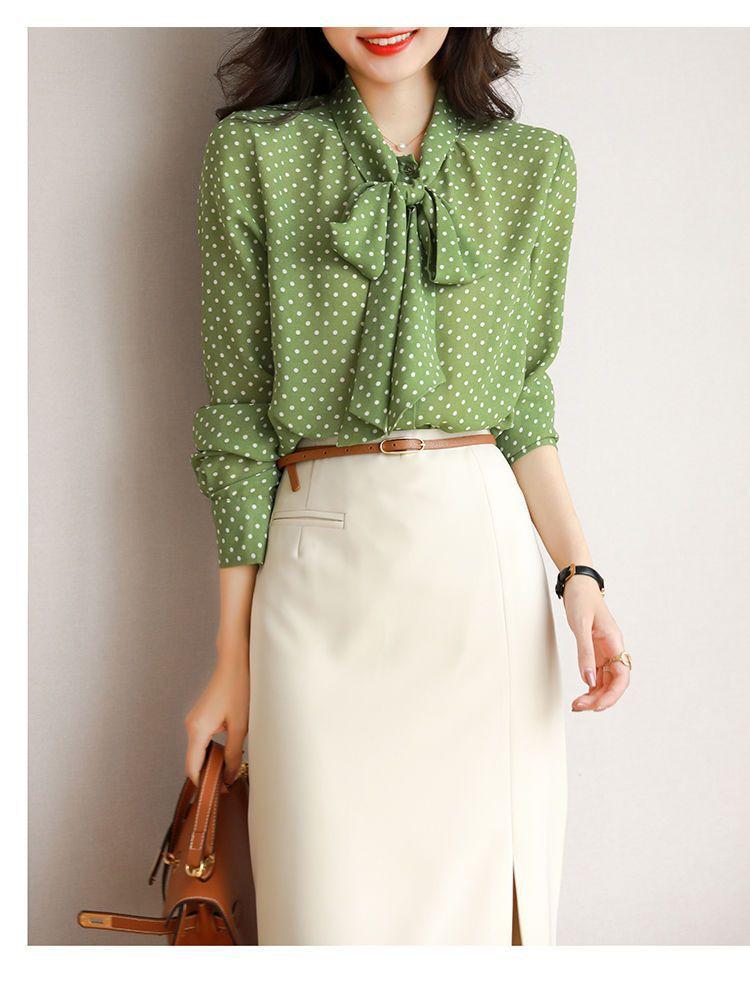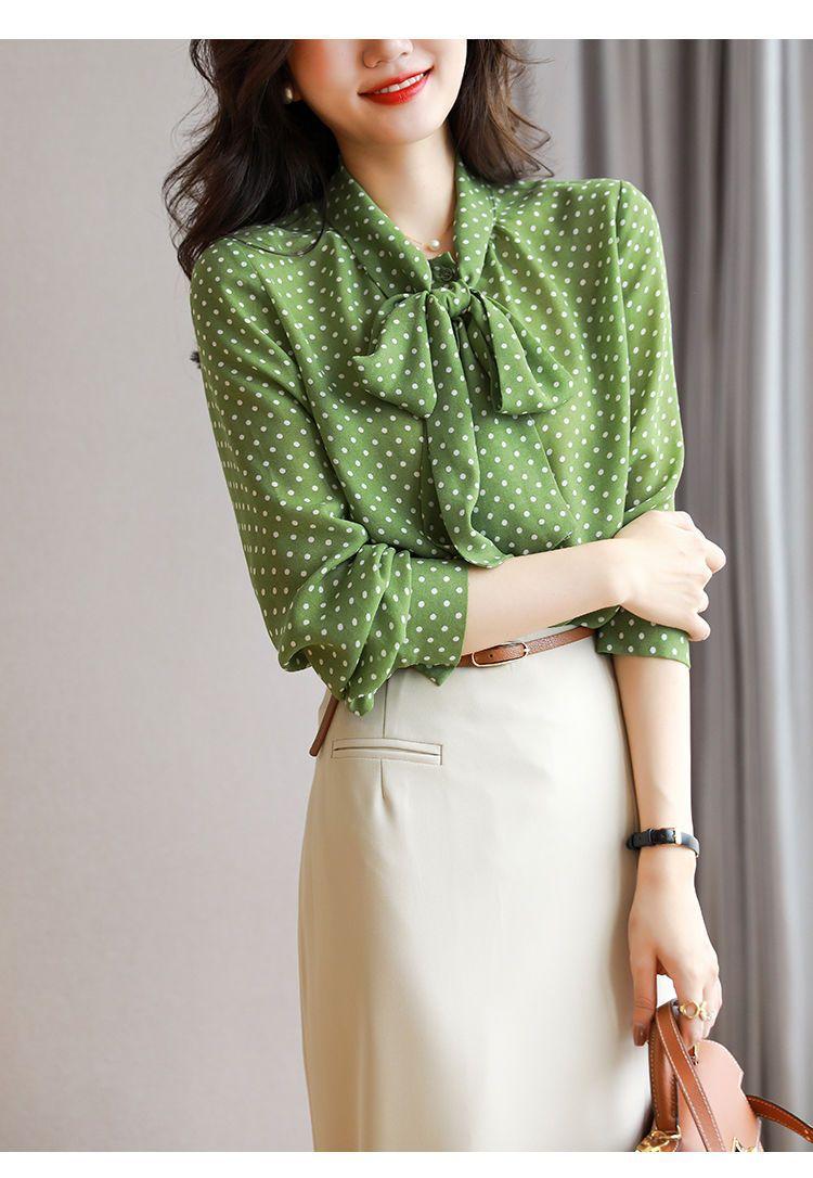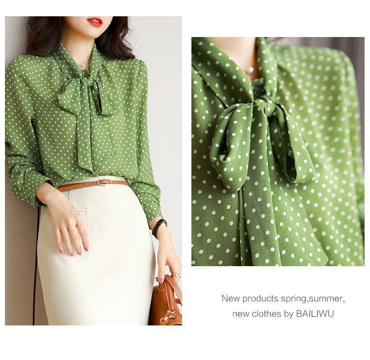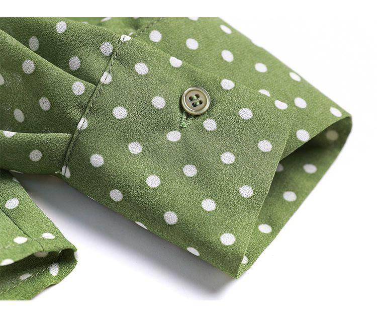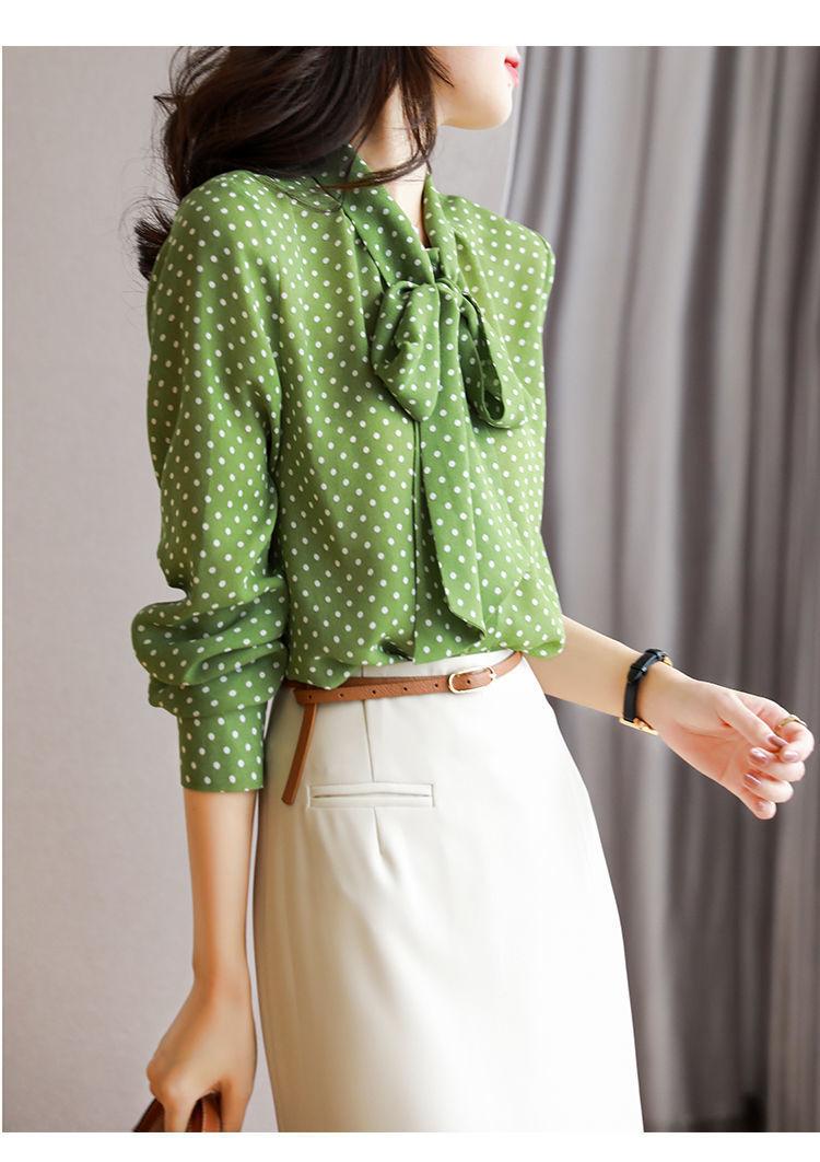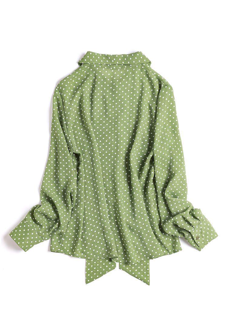 Camisa de mujer de primavera y otoño 2025 con lunares verdes, cuello camisero con cordones, manga larga, cárdigan de un solo pecho, top fino