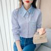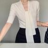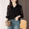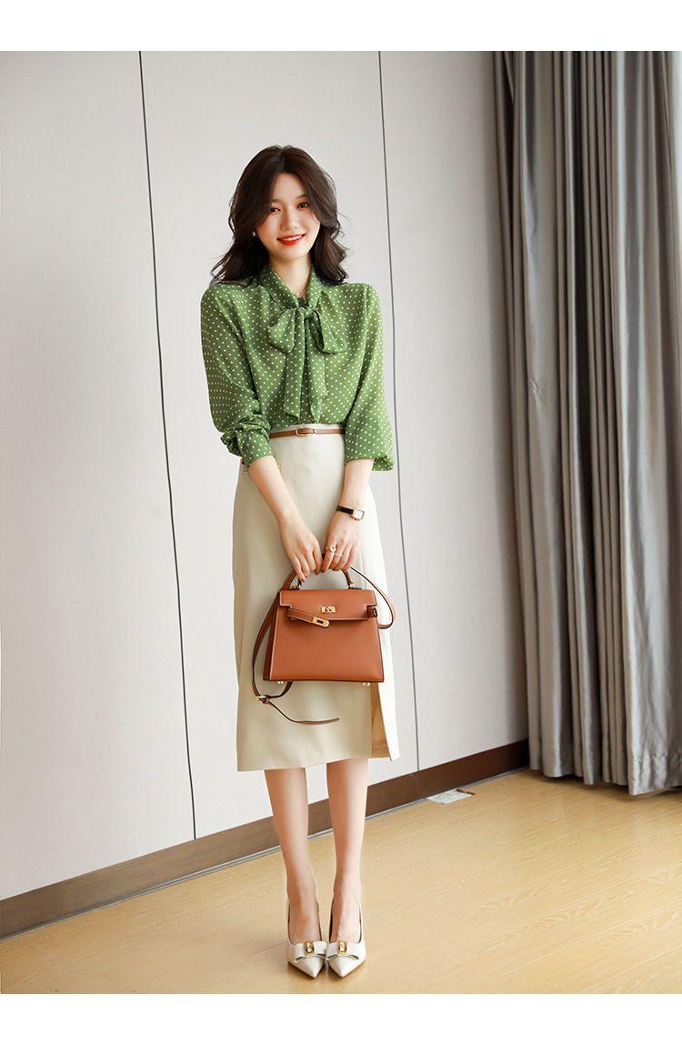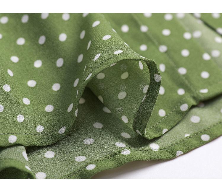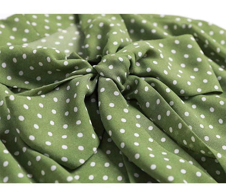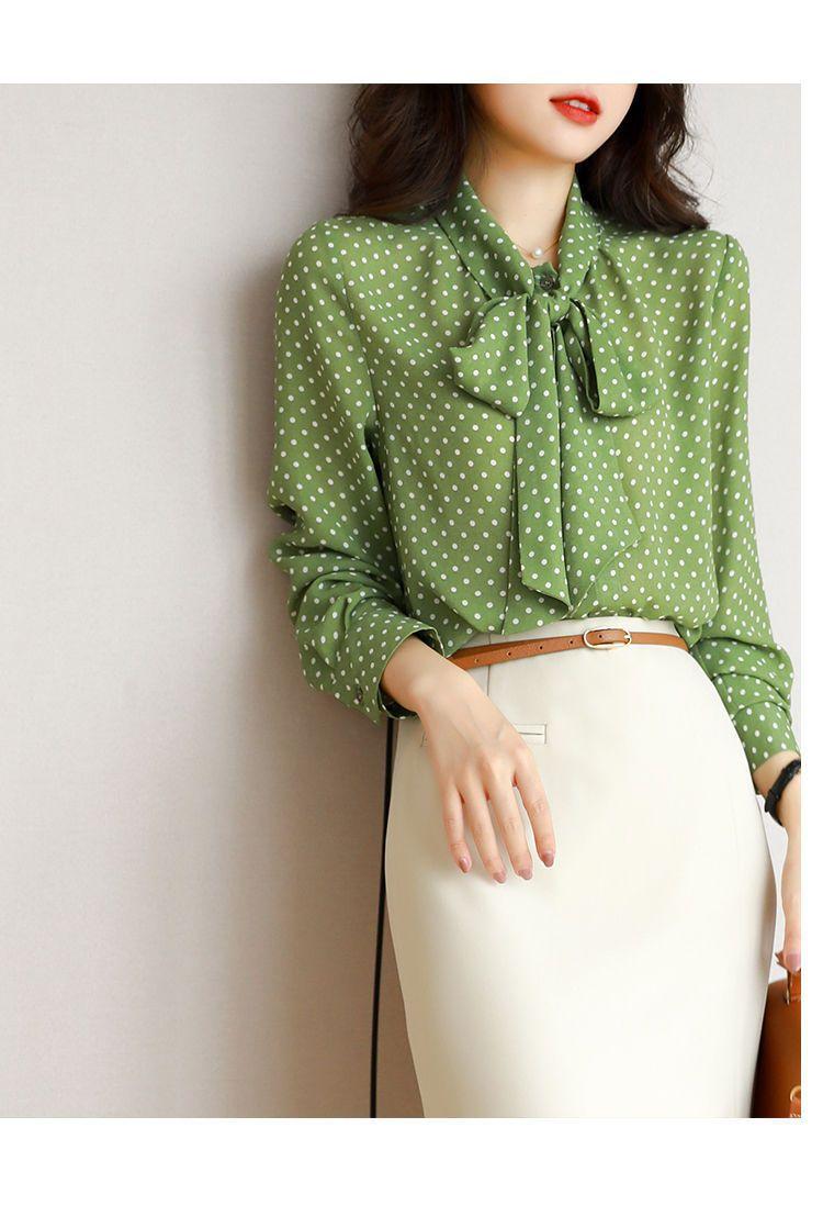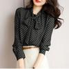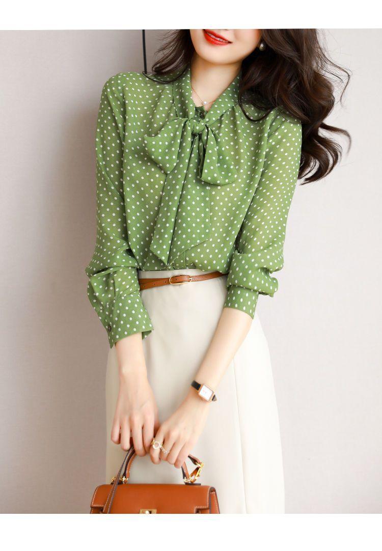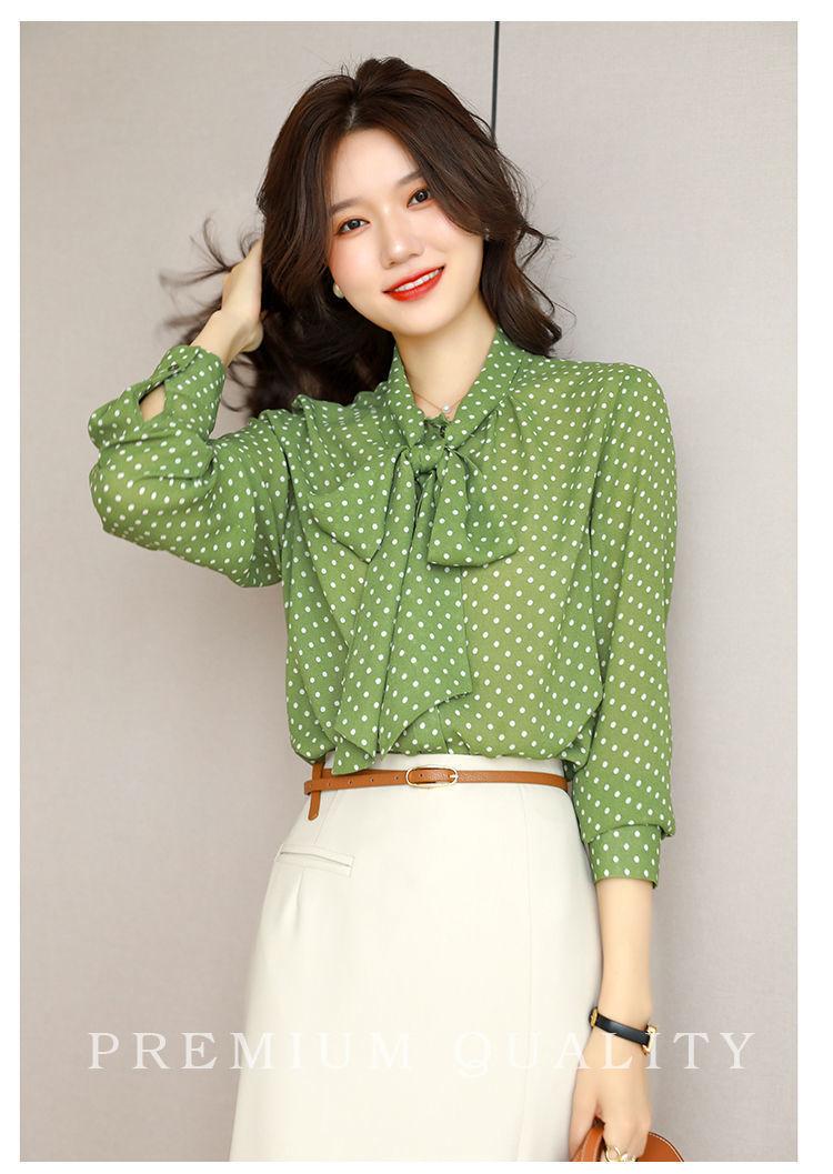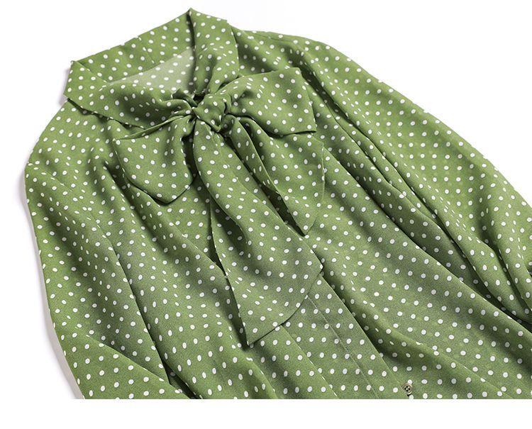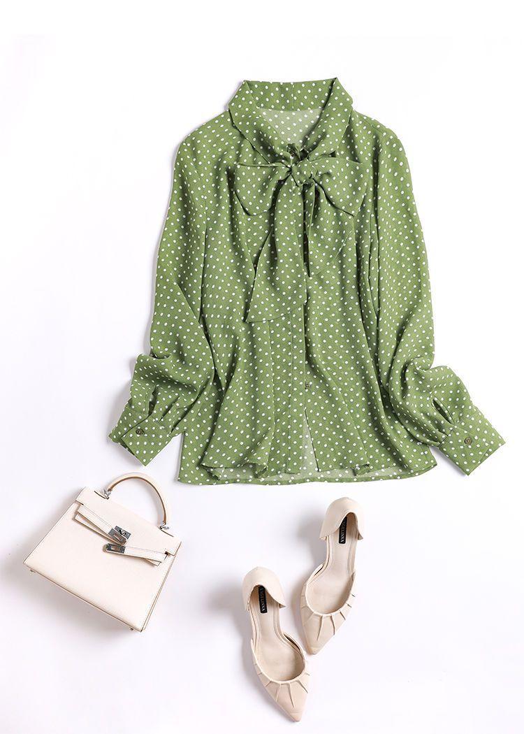 Camisa de mujer de primavera y otoño 2025 con lunares verdes, cuello camisero con cordones, manga larga, cárdigan de un solo pecho, top fino