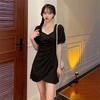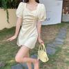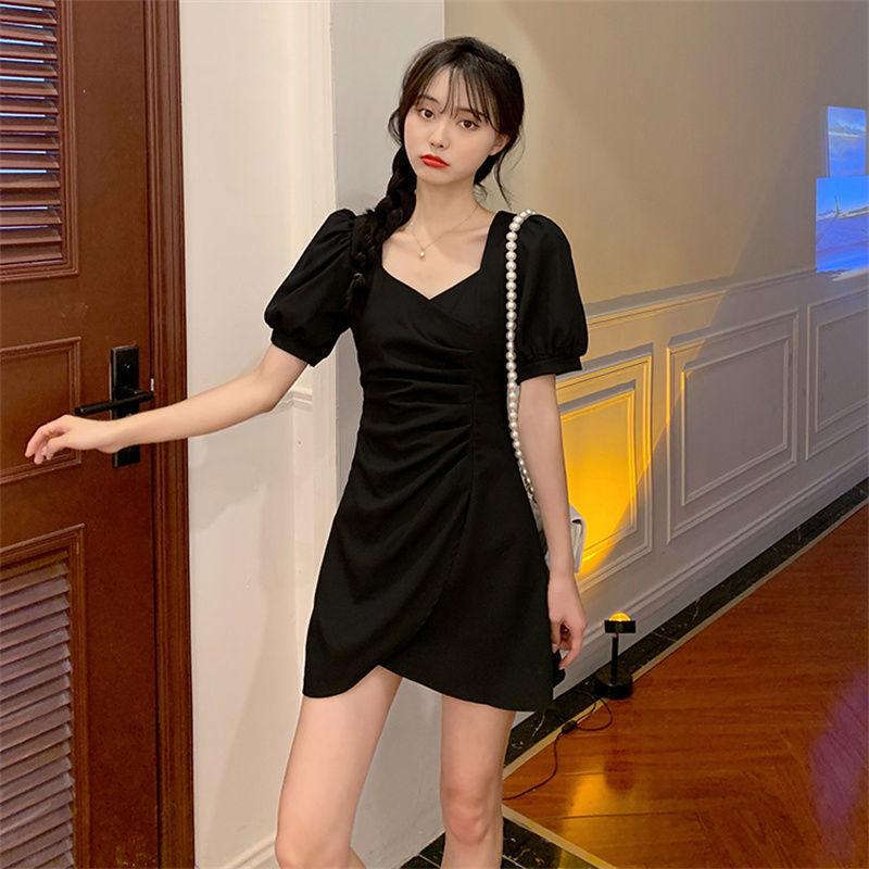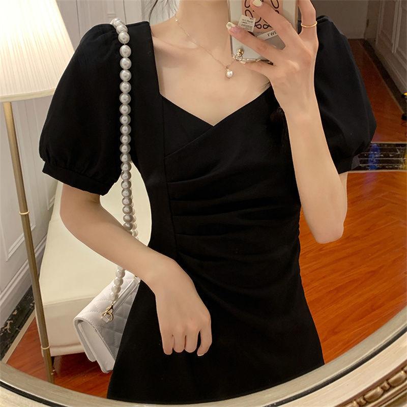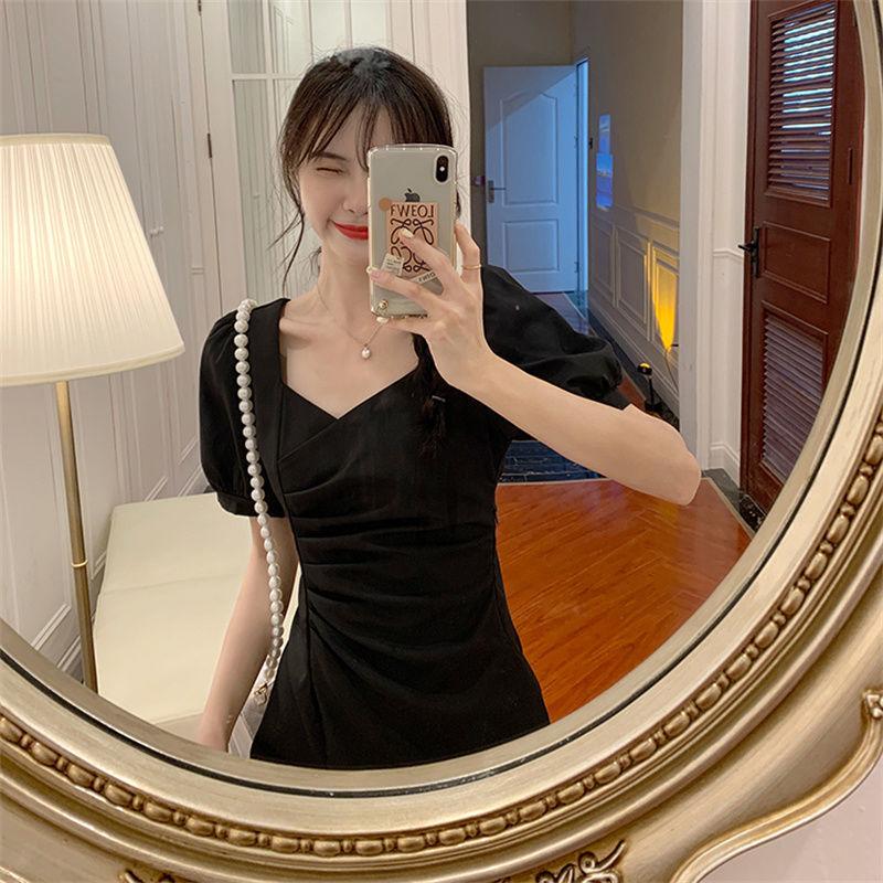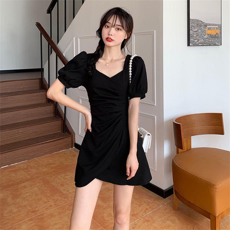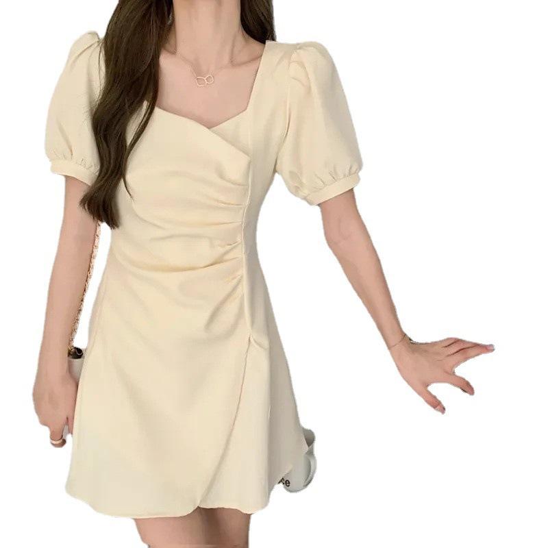 Vestido Irregular de Manga Abullonada Plisada con Cuello Cuadrado Francés para Mujer Verano 2023 Nuevo Falda Adelgazante de Cintura Pequeña