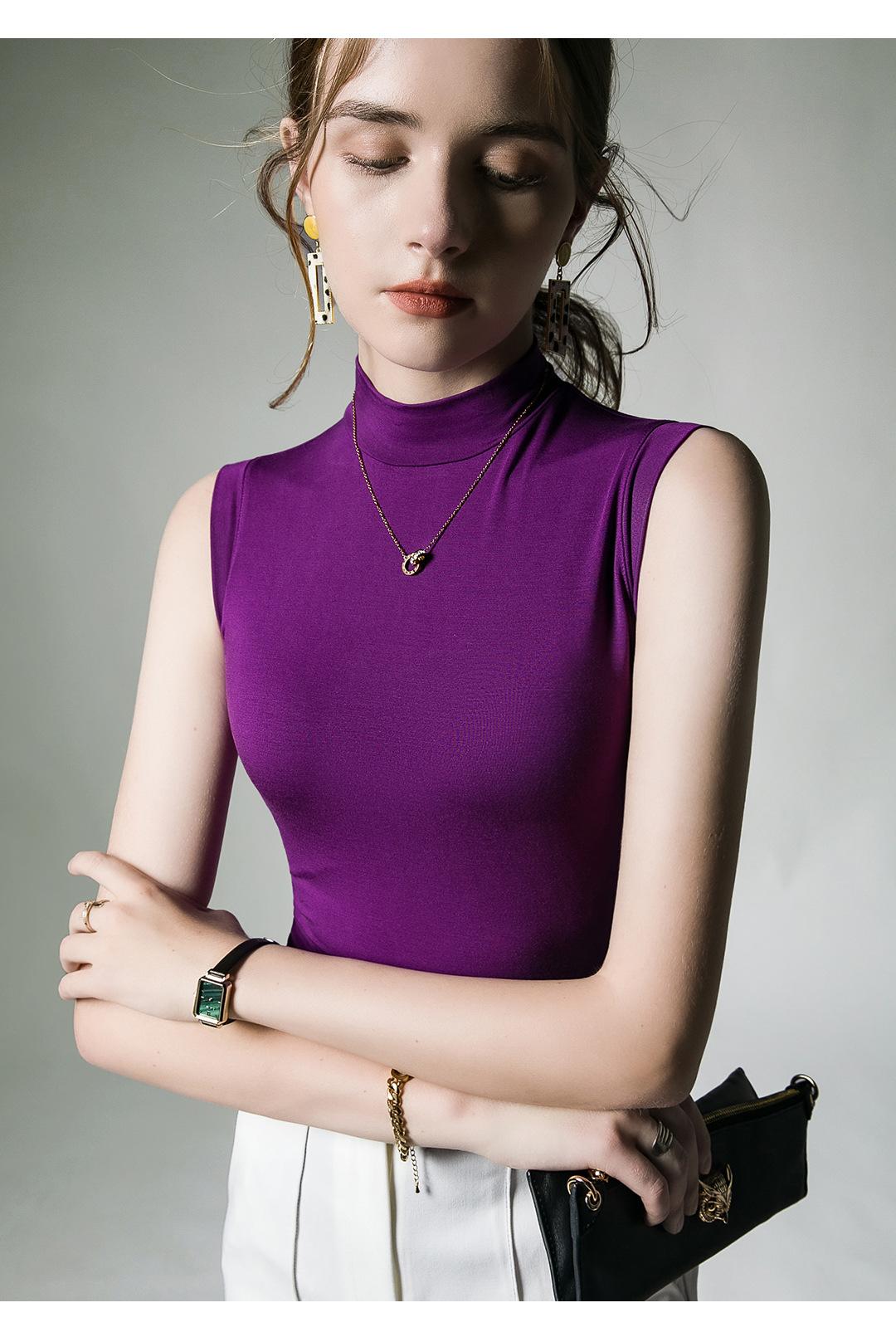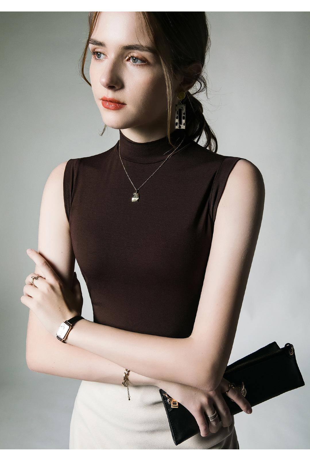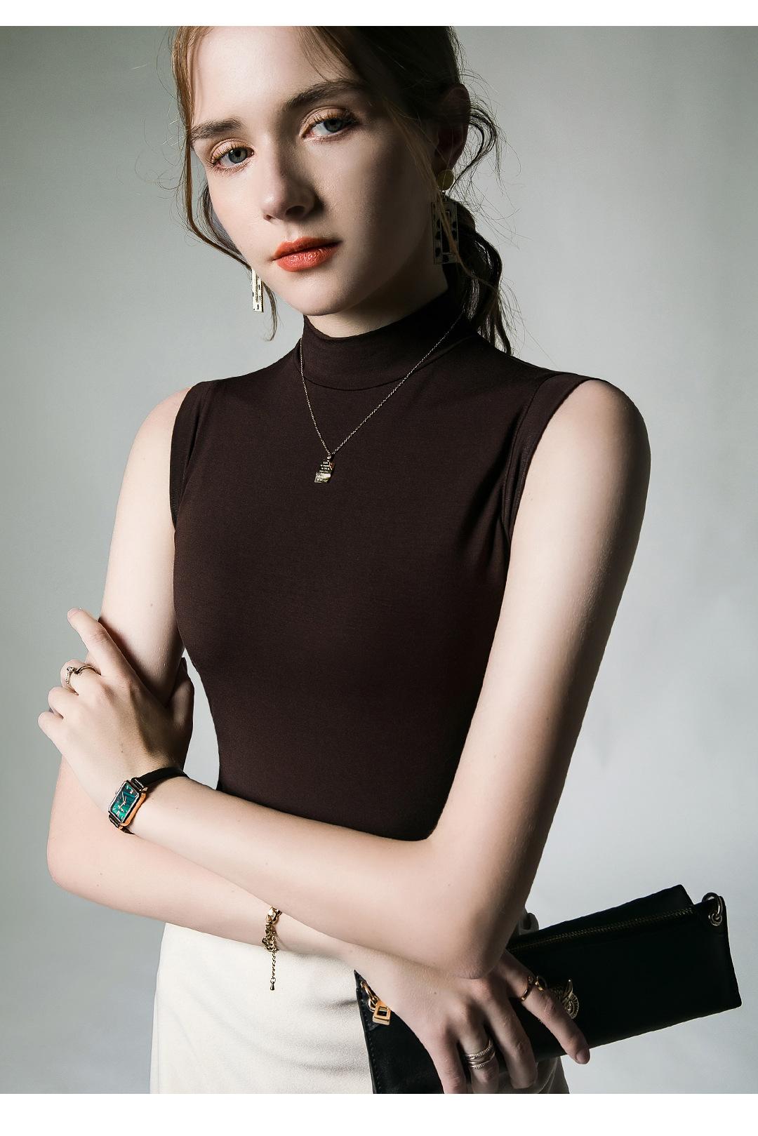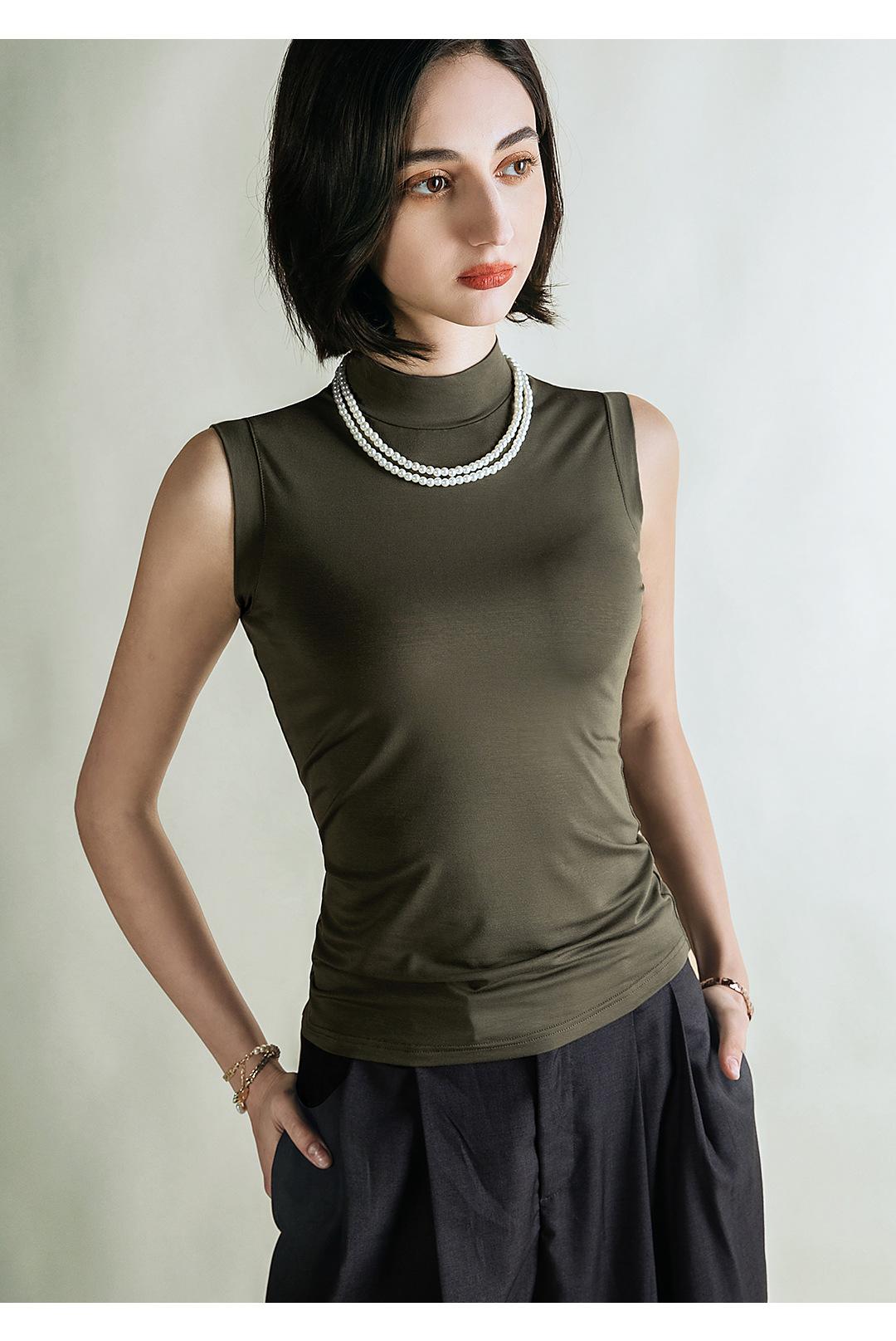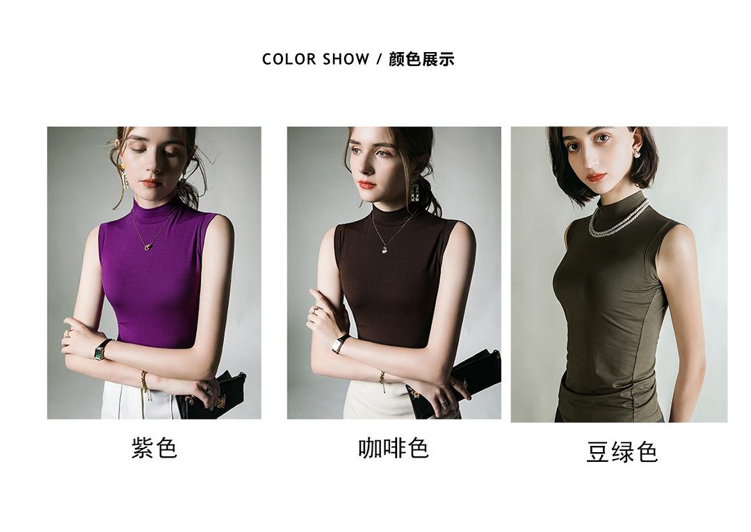 Camisa básica de otoño sin mangas con cuello medio alto, sencilla y generosa, de color sólido, ajustada, estilo occidental, pequeña.