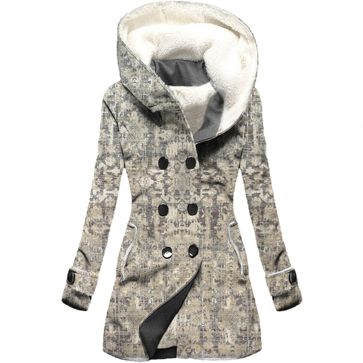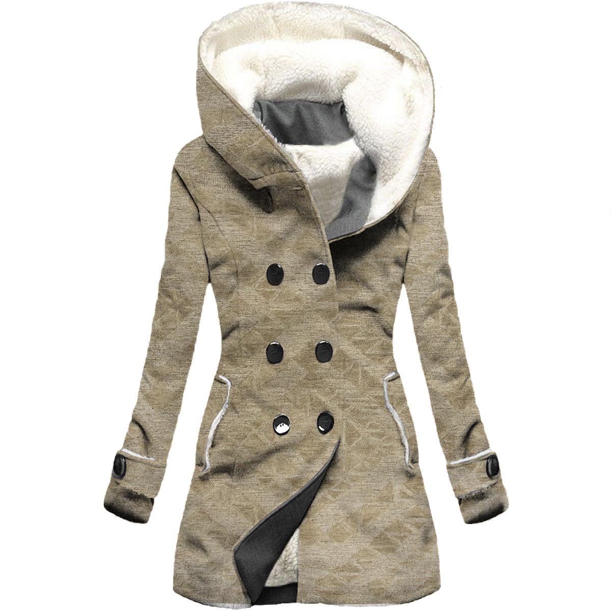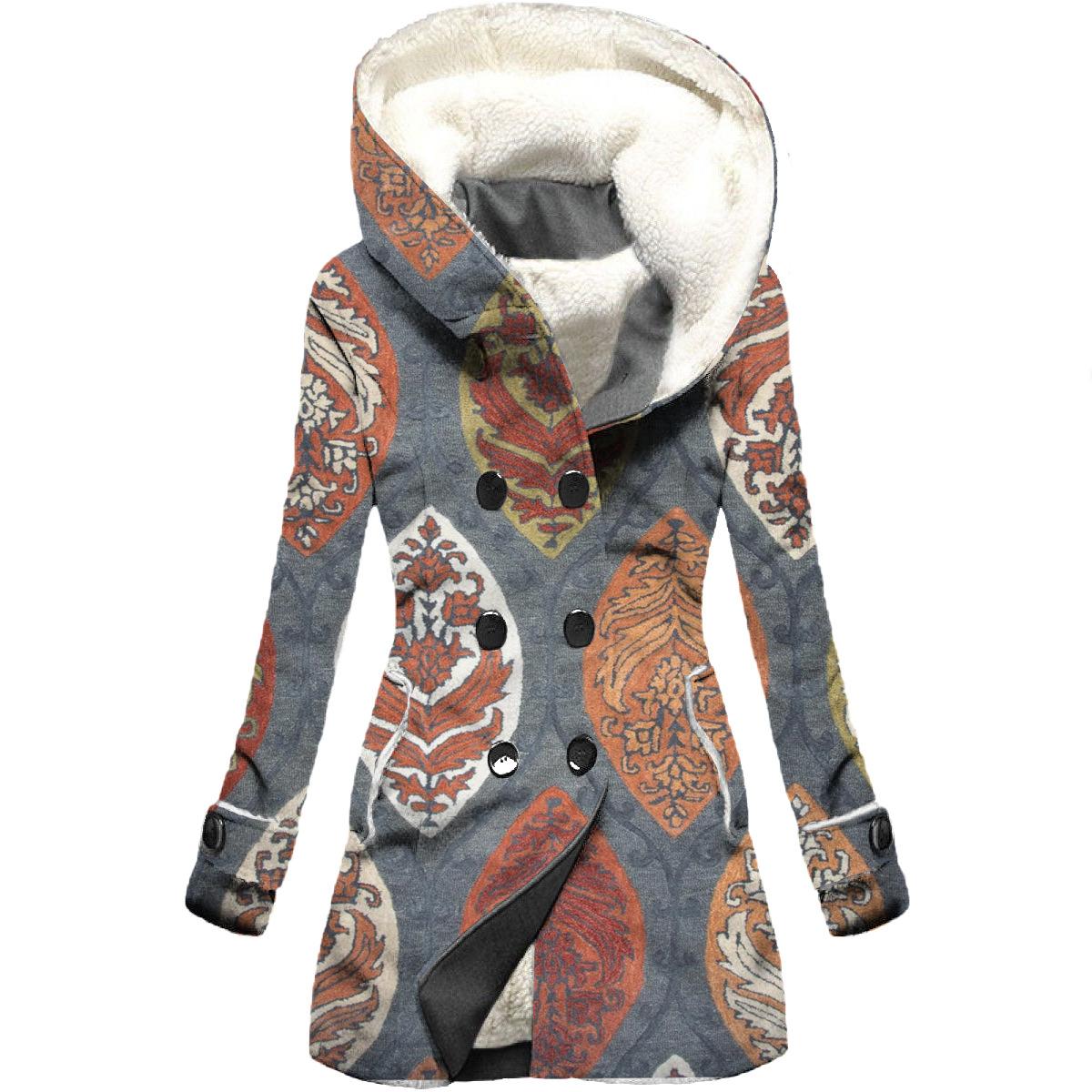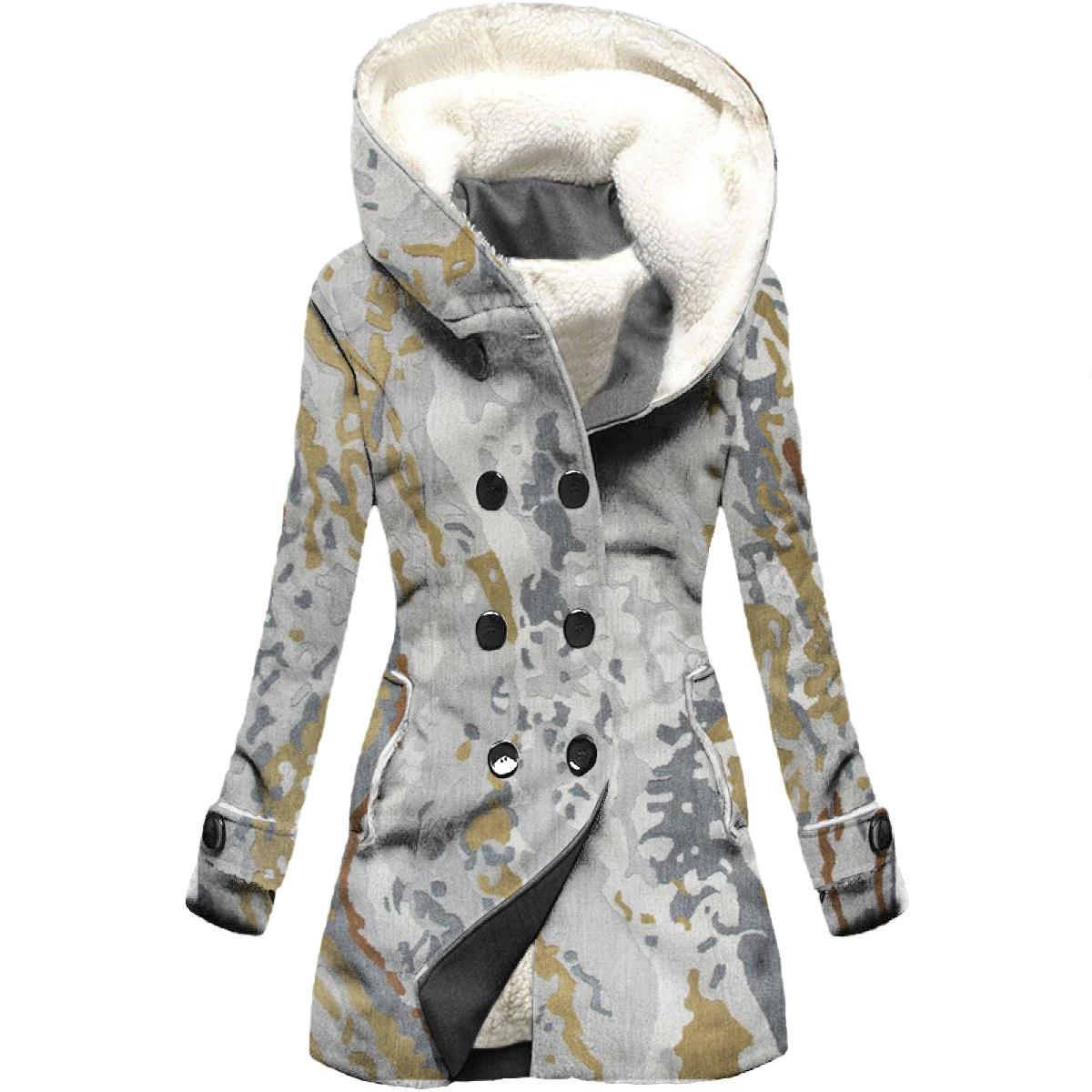 Abrigo trench nuevo y moderno para mujer transfronterizo 2023 invierno felpa estilo europeo y americano abrigo con capucha estampado a rayas 3D al por mayor