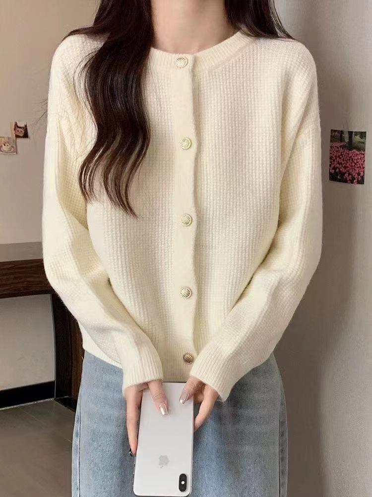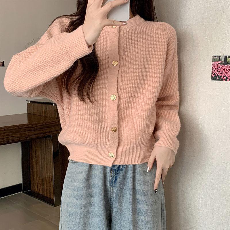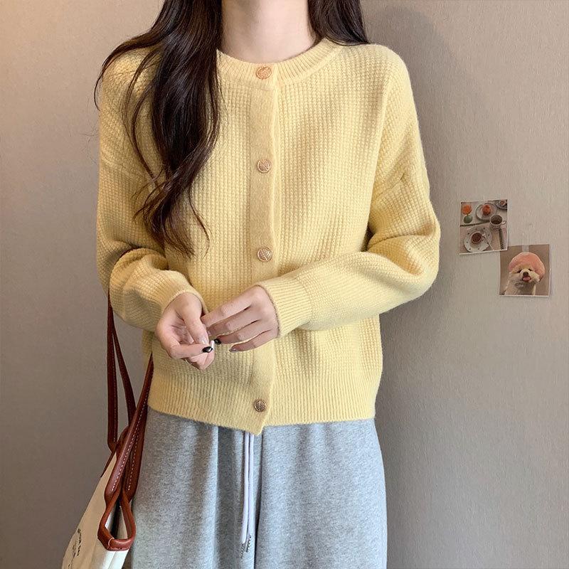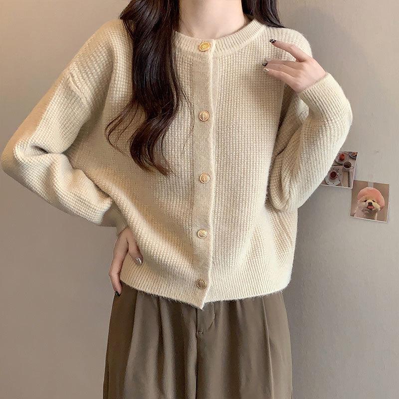 Cárdigan de punto elegante y suave de cuello redondo para mujer 2024 Primavera y Otoño Nuevo estilo coreano Ropa Abrigo Suéter color caramelo Mujer