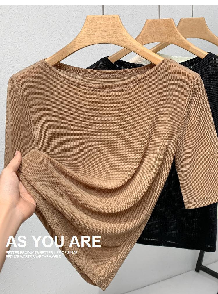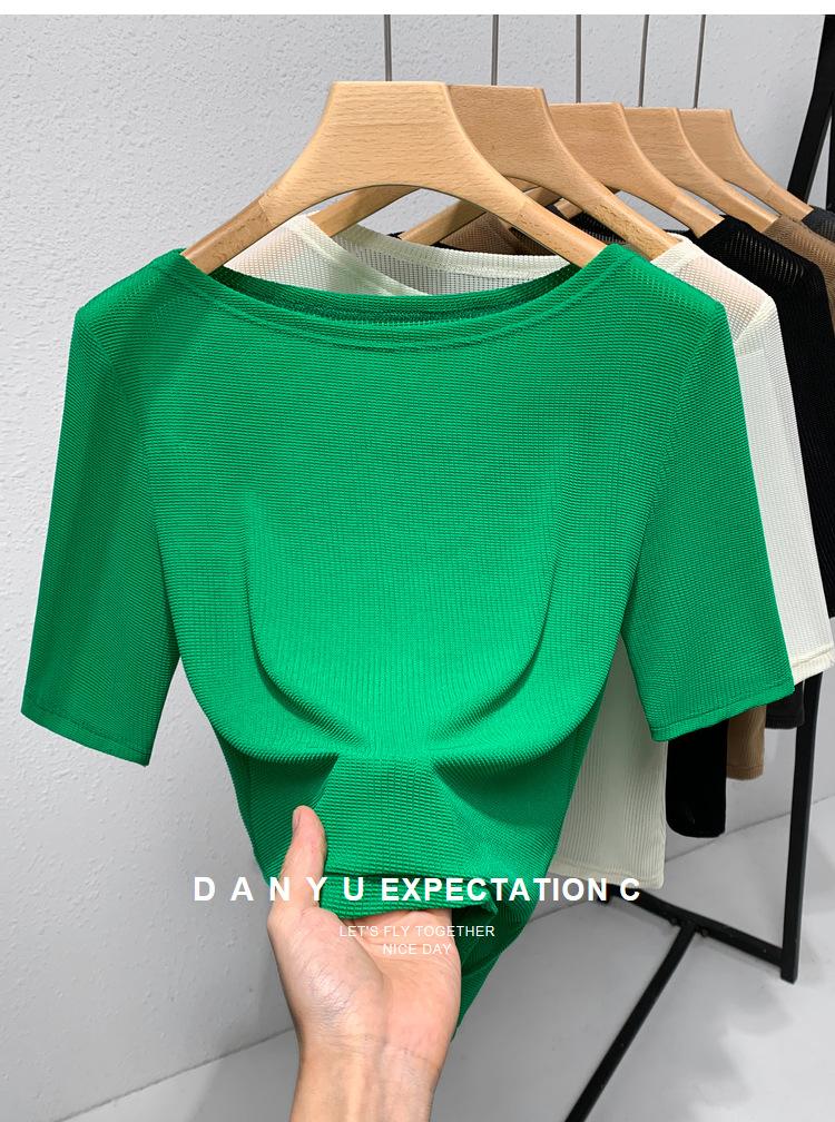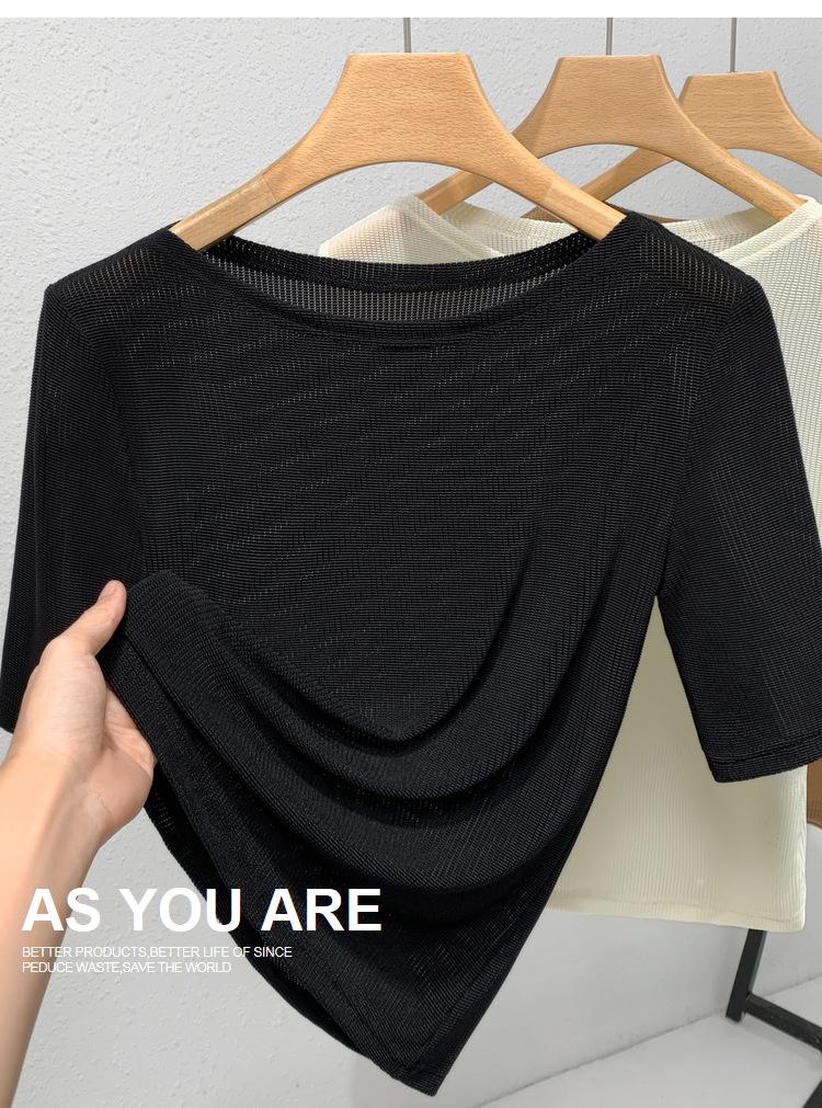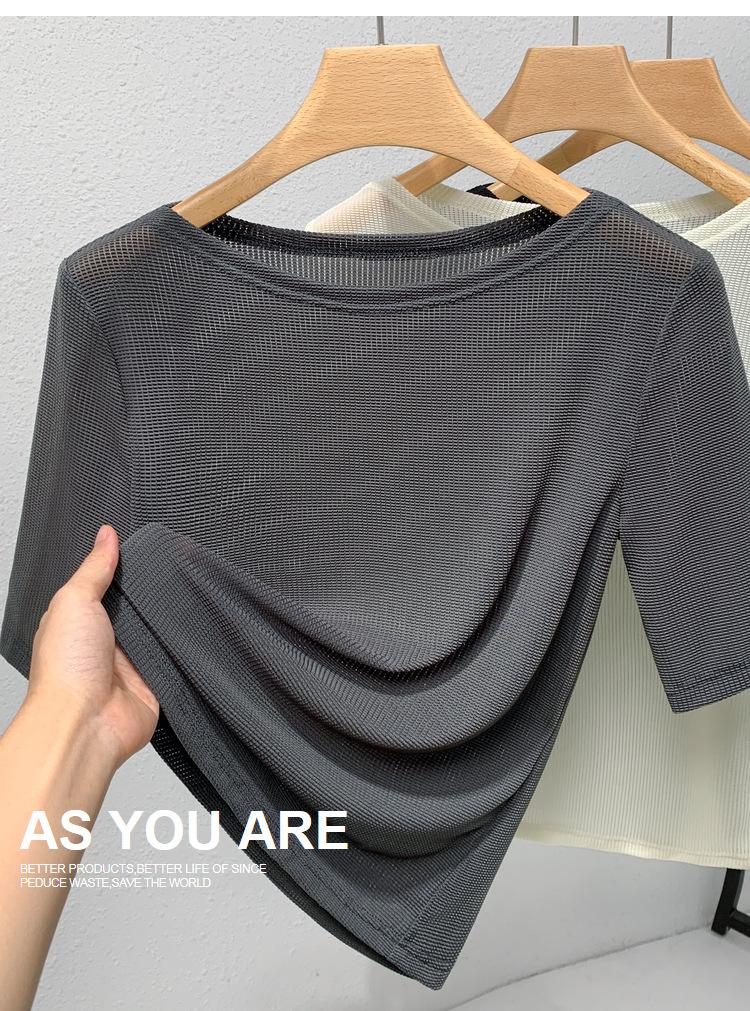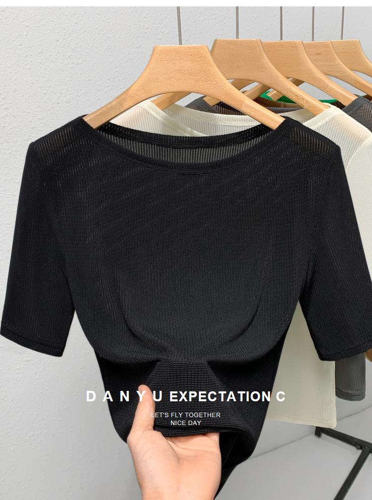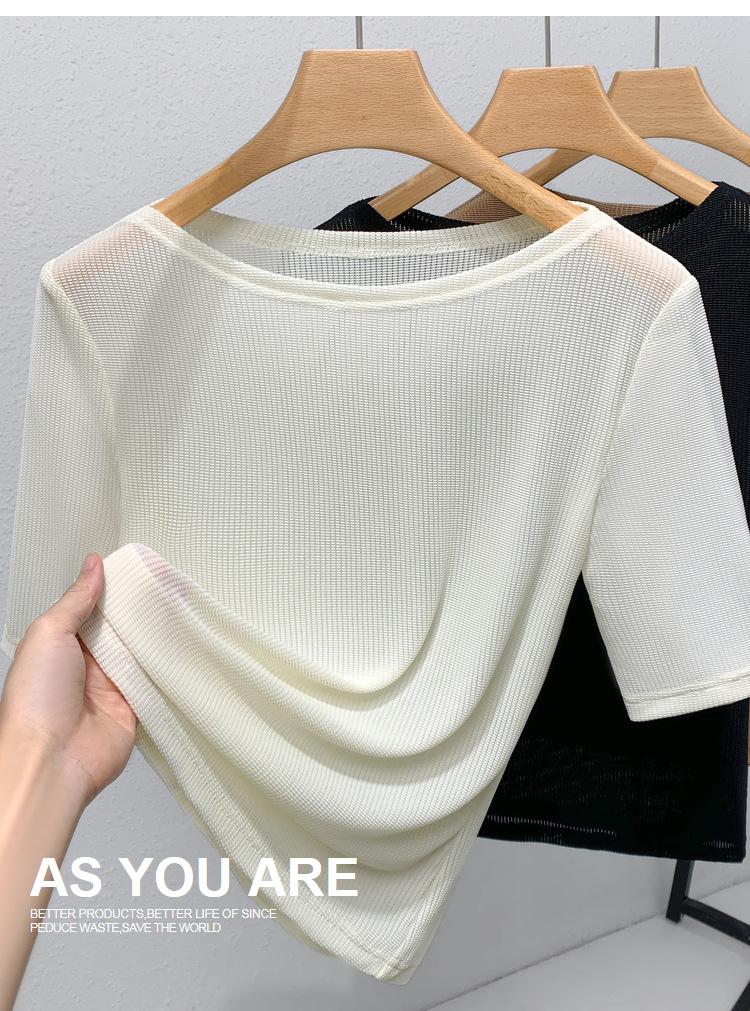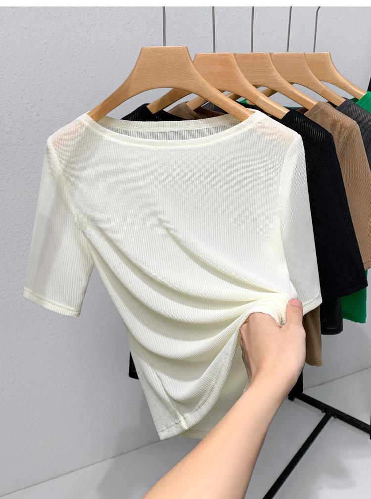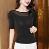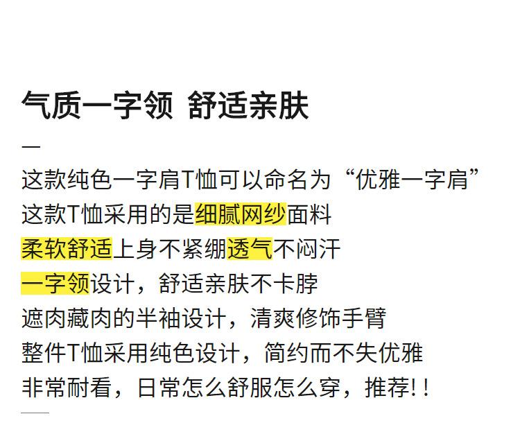 Playera de Manga Media para Mujer 2023 Nuevo Estilo Europeo Moda Femenina Top de Malla con Hombros Descubiertos Color Sólido Blusa Elástica Entallada en la Cintura