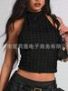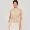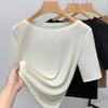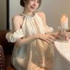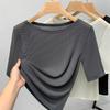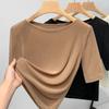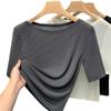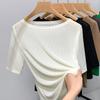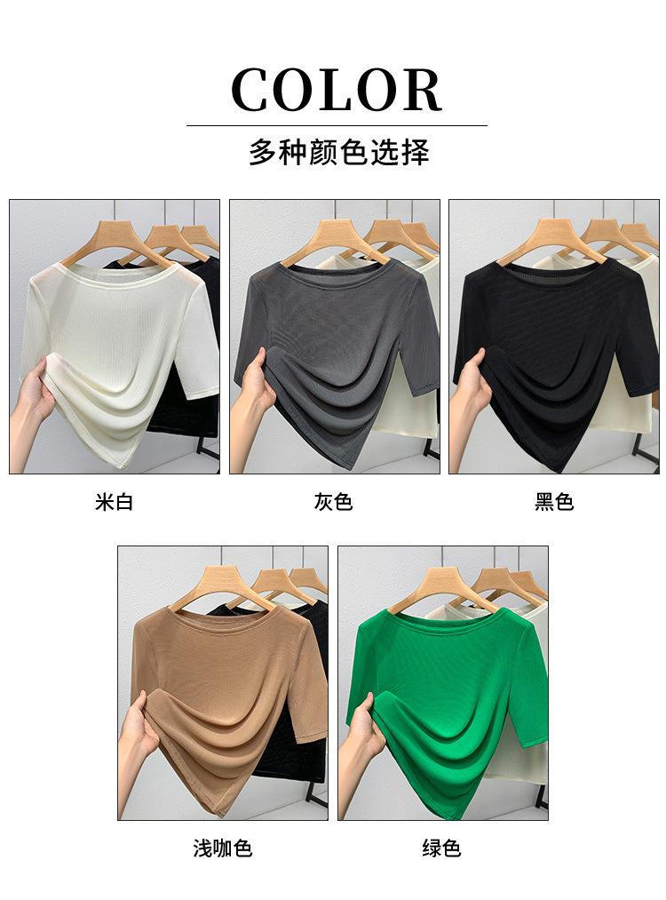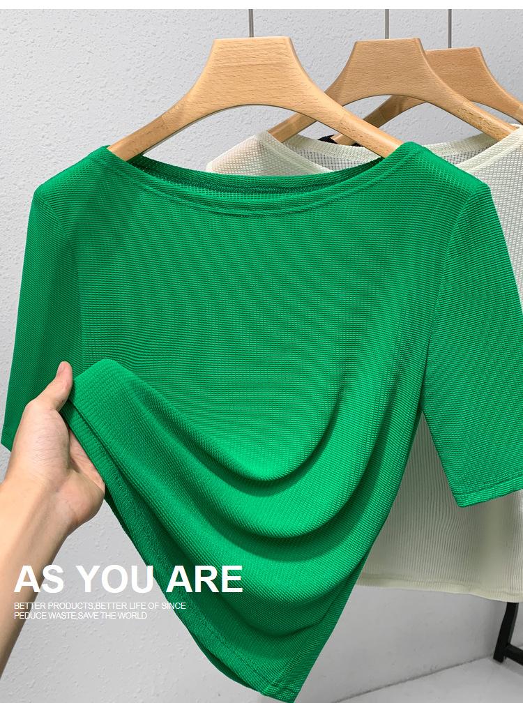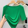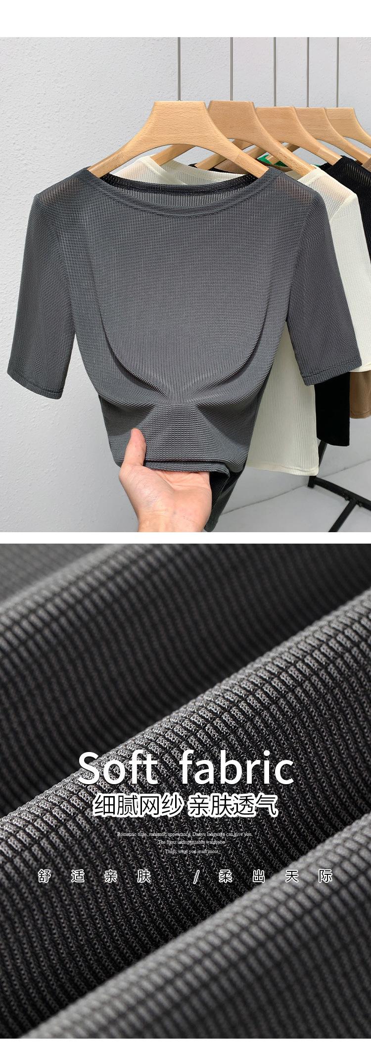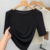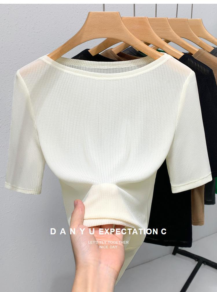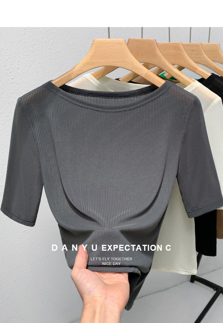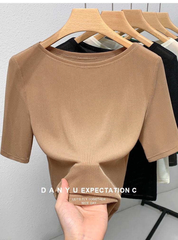Playera de Manga Media para Mujer 2023 Nuevo Estilo Europeo Moda Femenina Top de Malla con Hombros Descubiertos Color Sólido Blusa Elástica Entallada en la Cintura