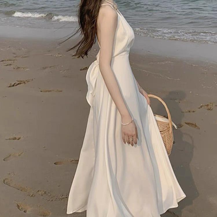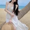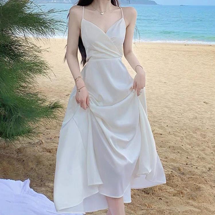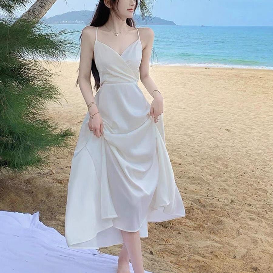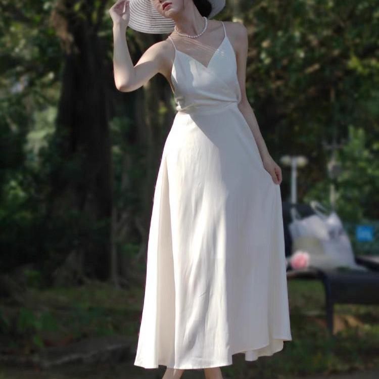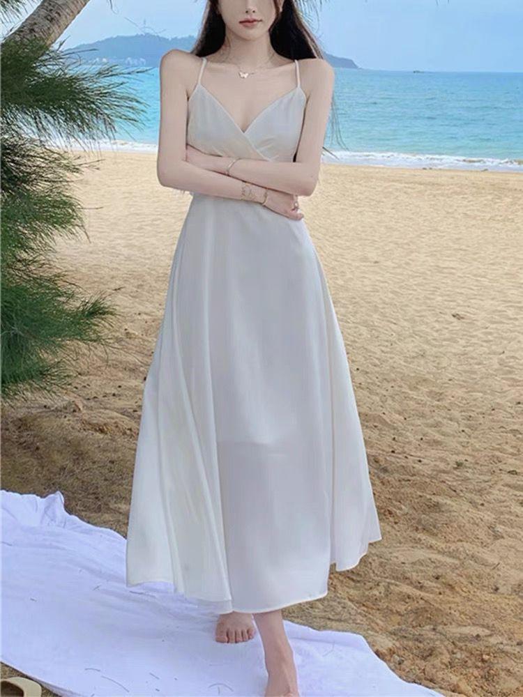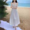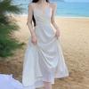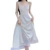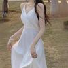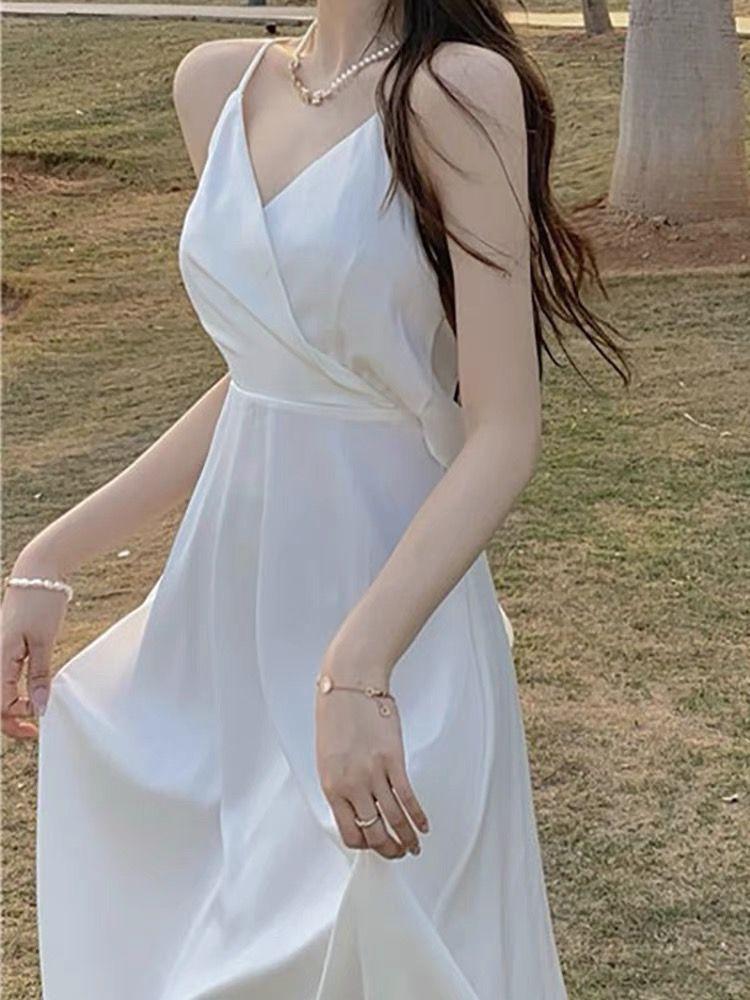 Vestido de Tirantes Blanco Puro Verano 2025 Cuello en V para Mujer Falda Larga Ajustado Sexy Cintura Vestido de Tirantes