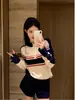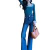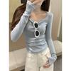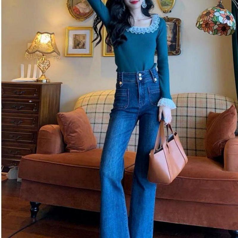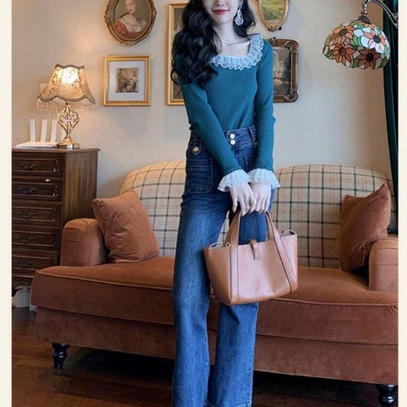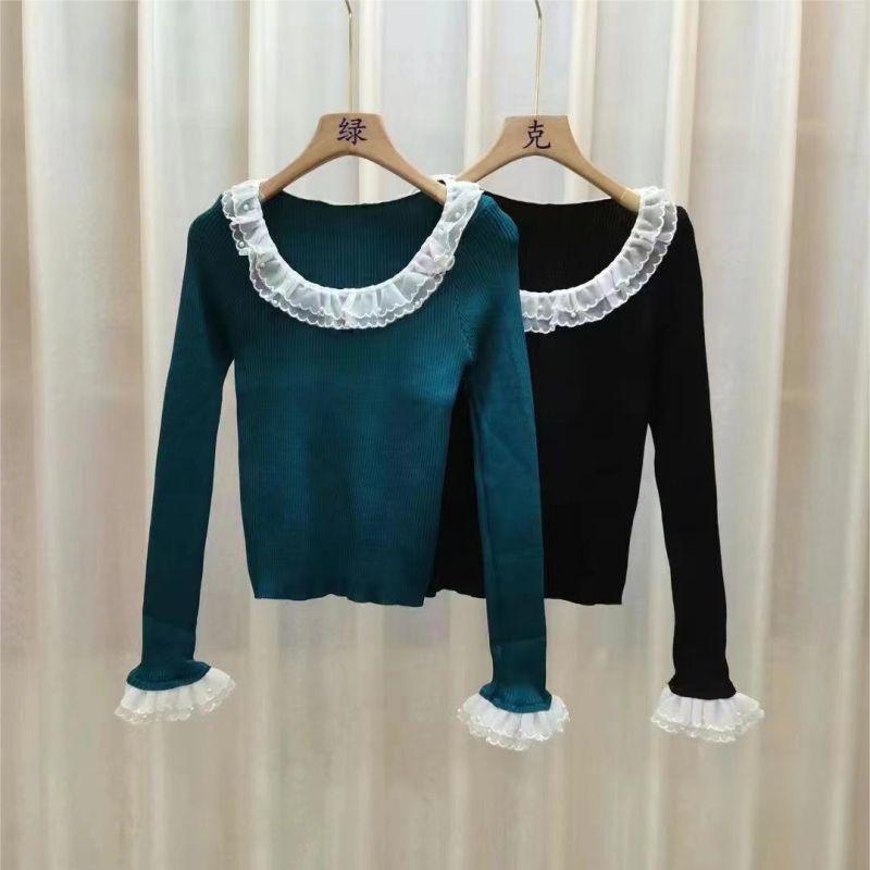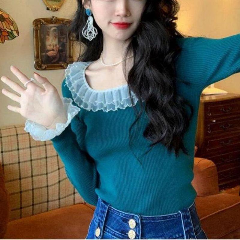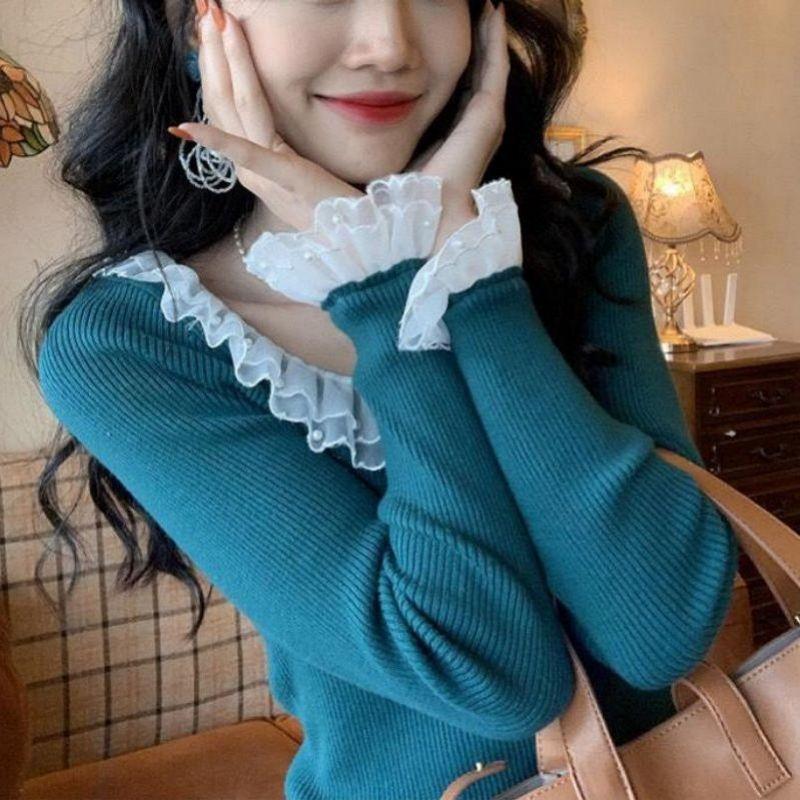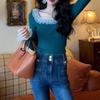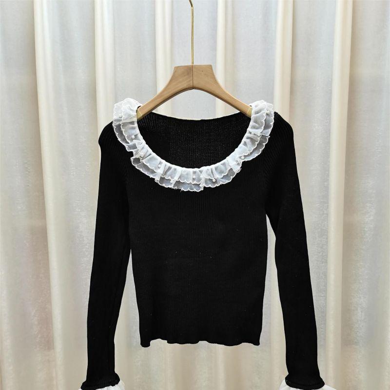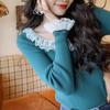 Primavera 2023, nuevo estilo coreano, sencillo, estilo dulce, cuello redondo, costura de encaje, manga larga, top de punto combinable