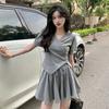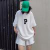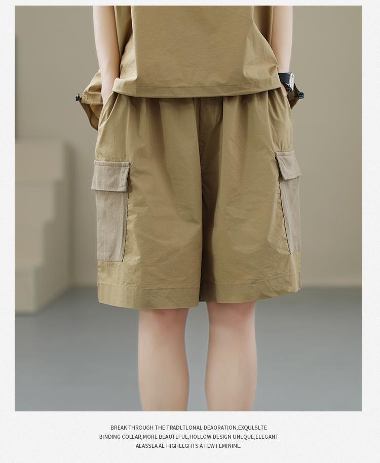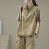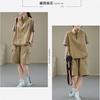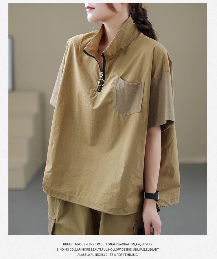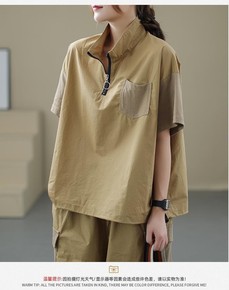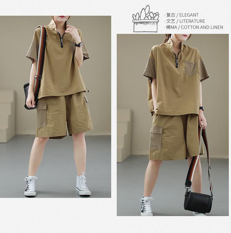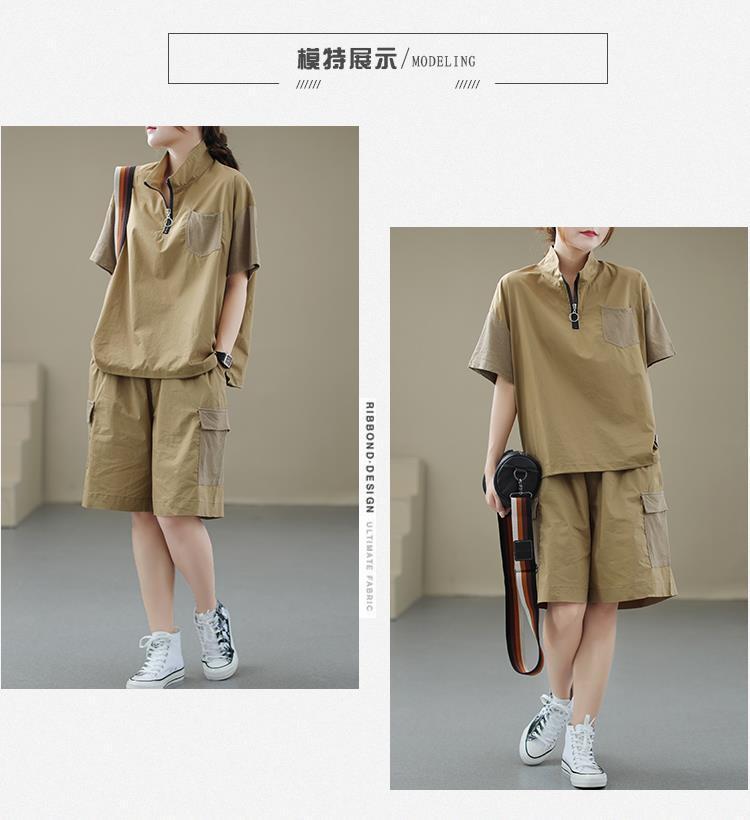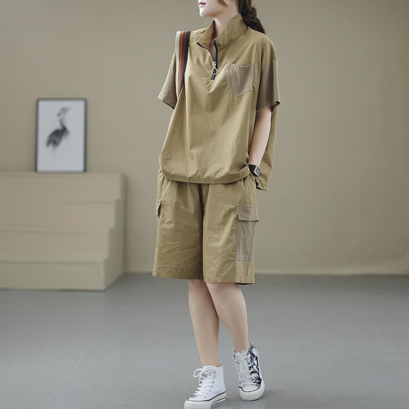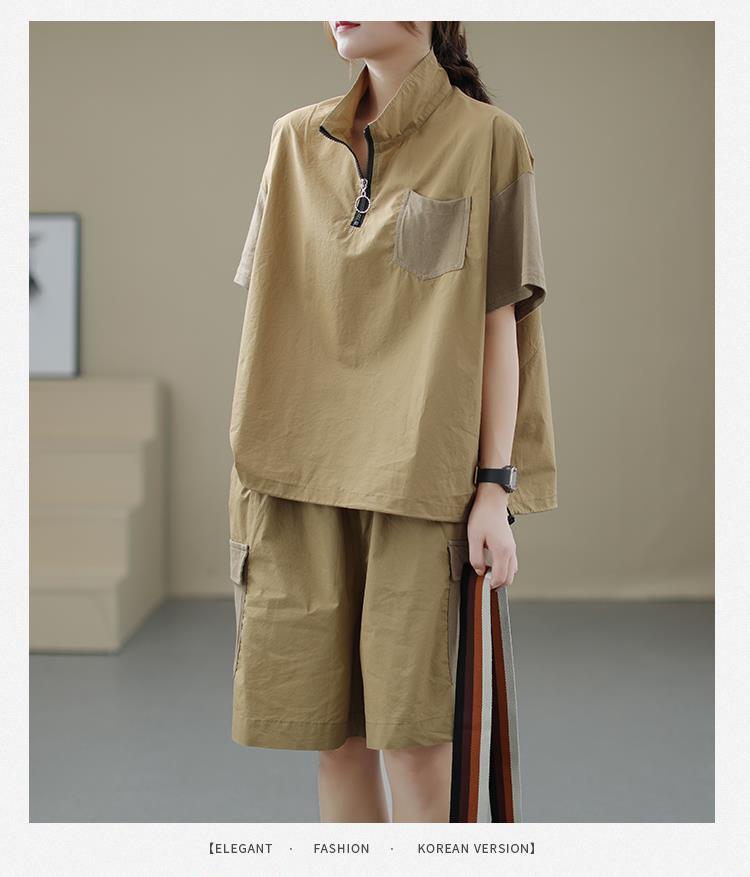 Traje de verano nuevo con cuello con cremallera, informal, combina con todo, para mujer, color sólido, pantalones cortos sueltos, camiseta, traje